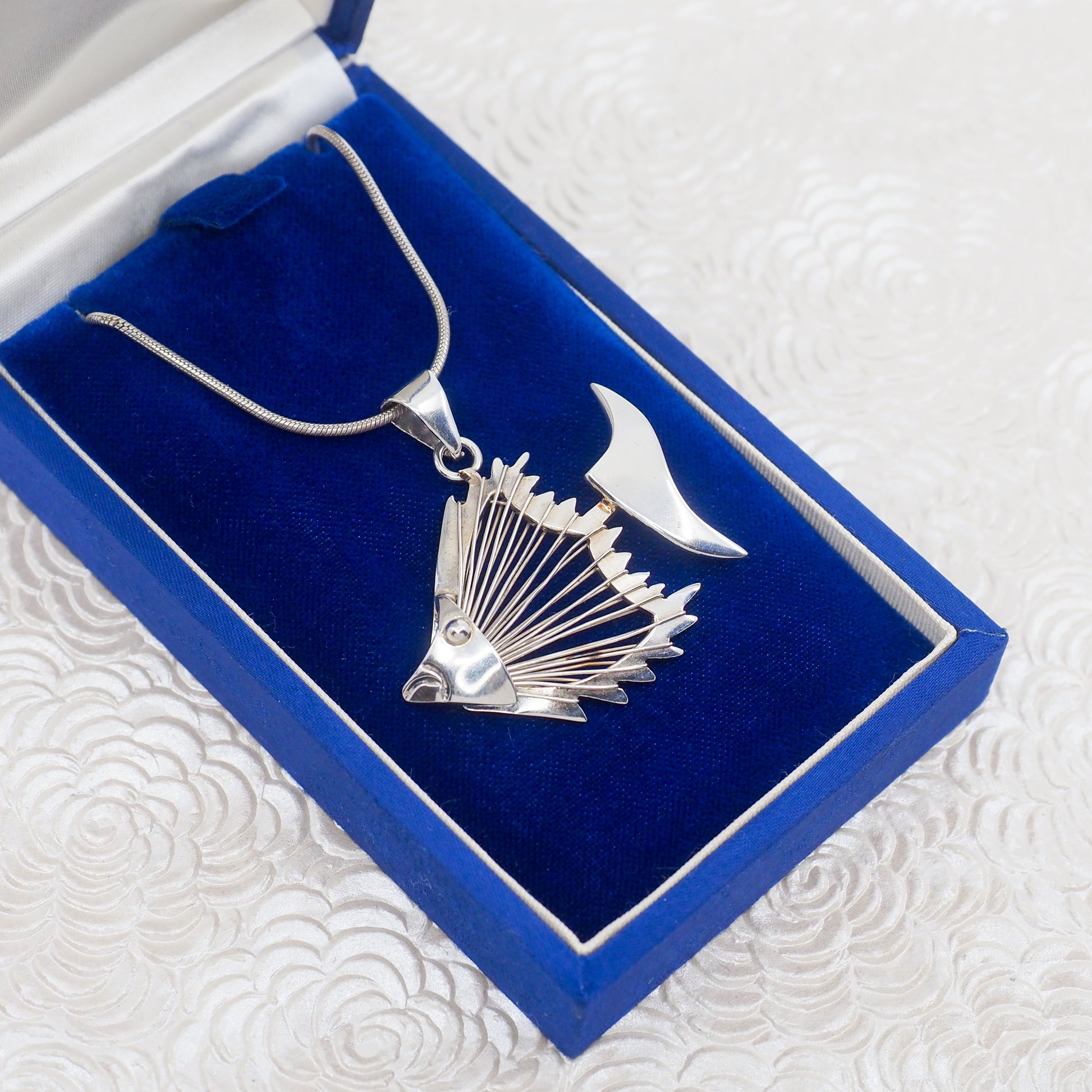 Vintage 190s Mexico Fish Skeleton Sterling Silver Pendant 18" Necklace