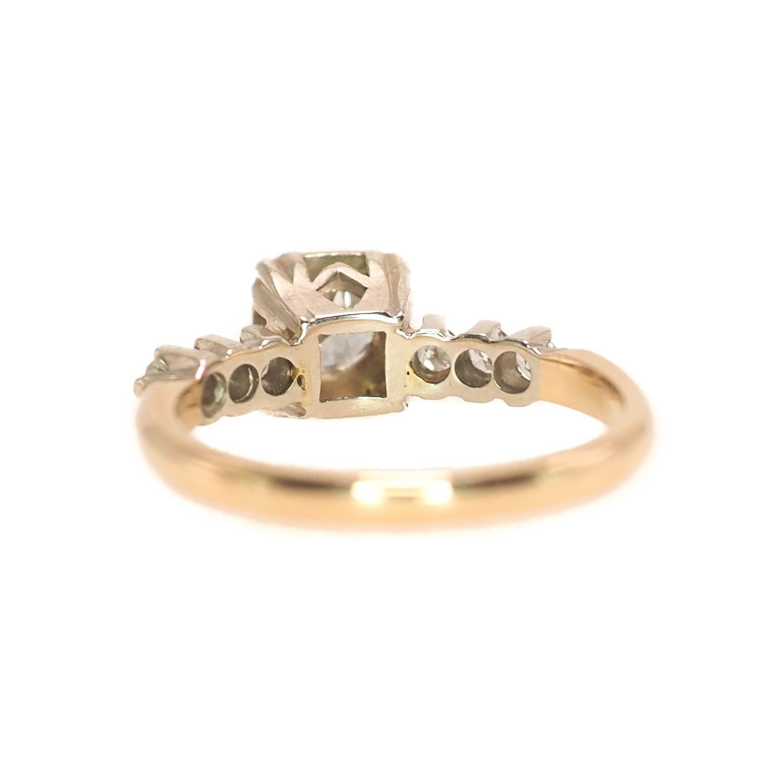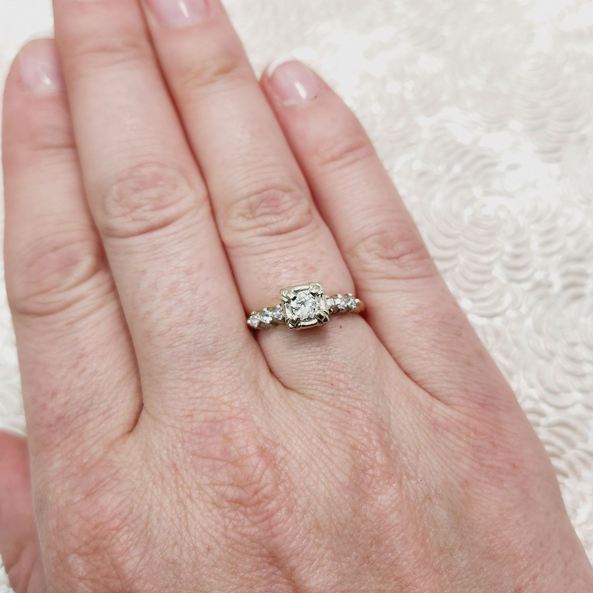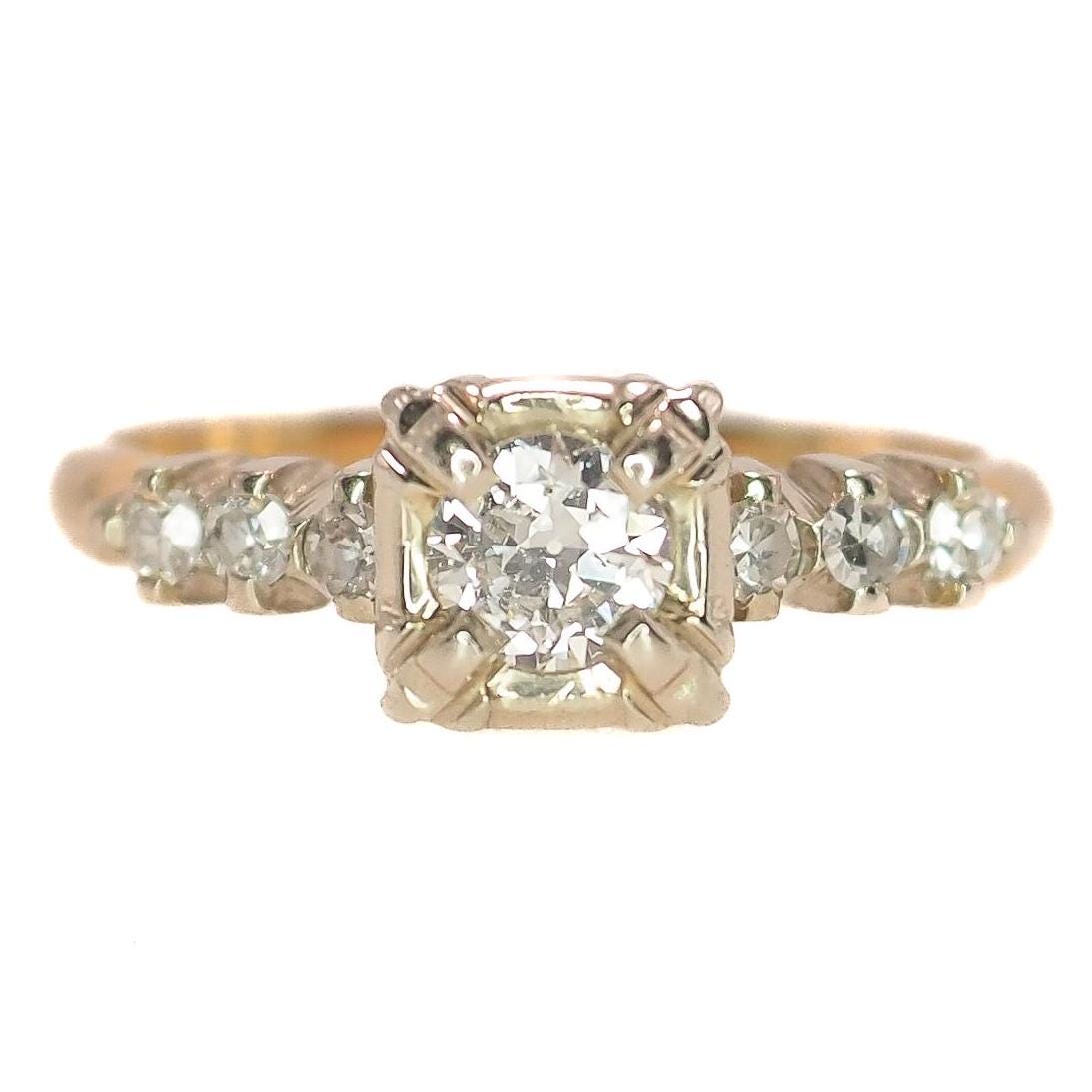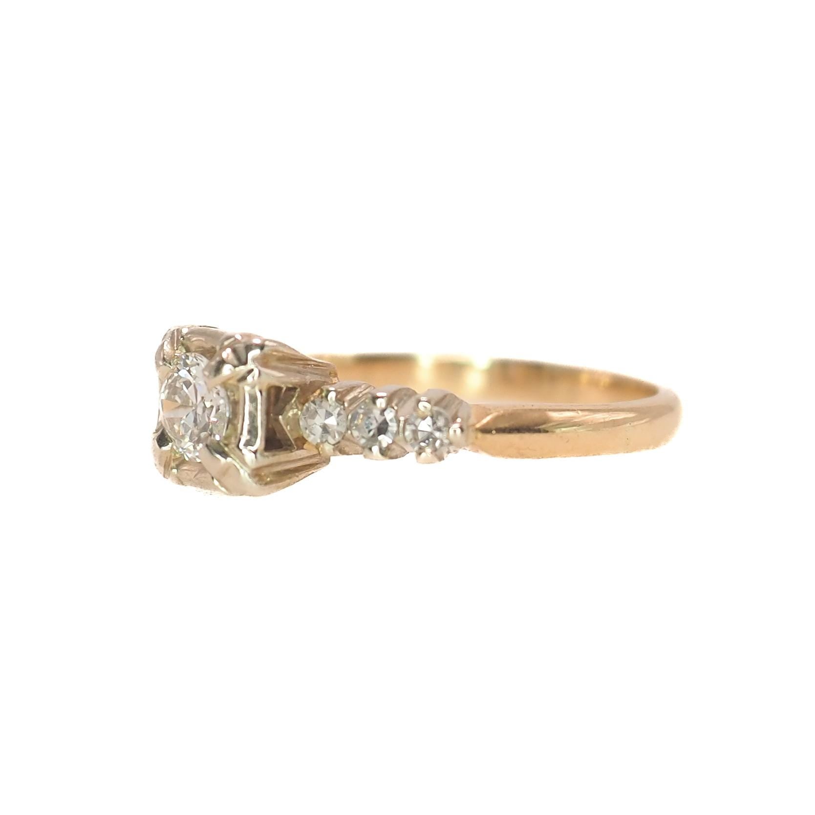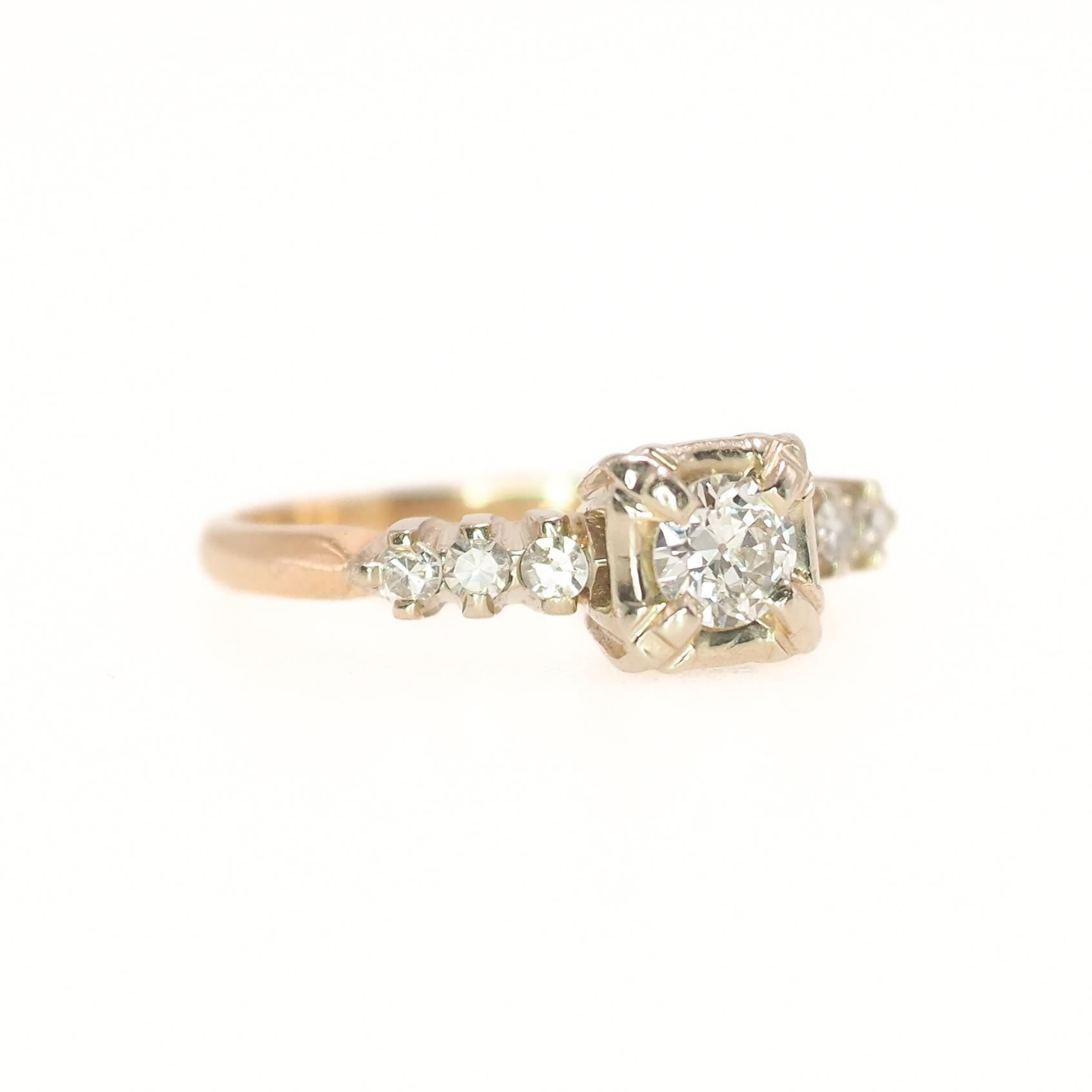 Crafted during the 1930s, this beautiful vintage engagement ring features a 0.32-carat transitional-cut diamond framed by six round-cut diamonds set into 14K white and yellow gold. The mixed metal "illusion" setting is typical of this era and was used to make the diamond appear more prominent. The seven diamonds are set into the metal so they won‘t snag on clothing. This is a fabulous Art Deco engagement ring for your special day!