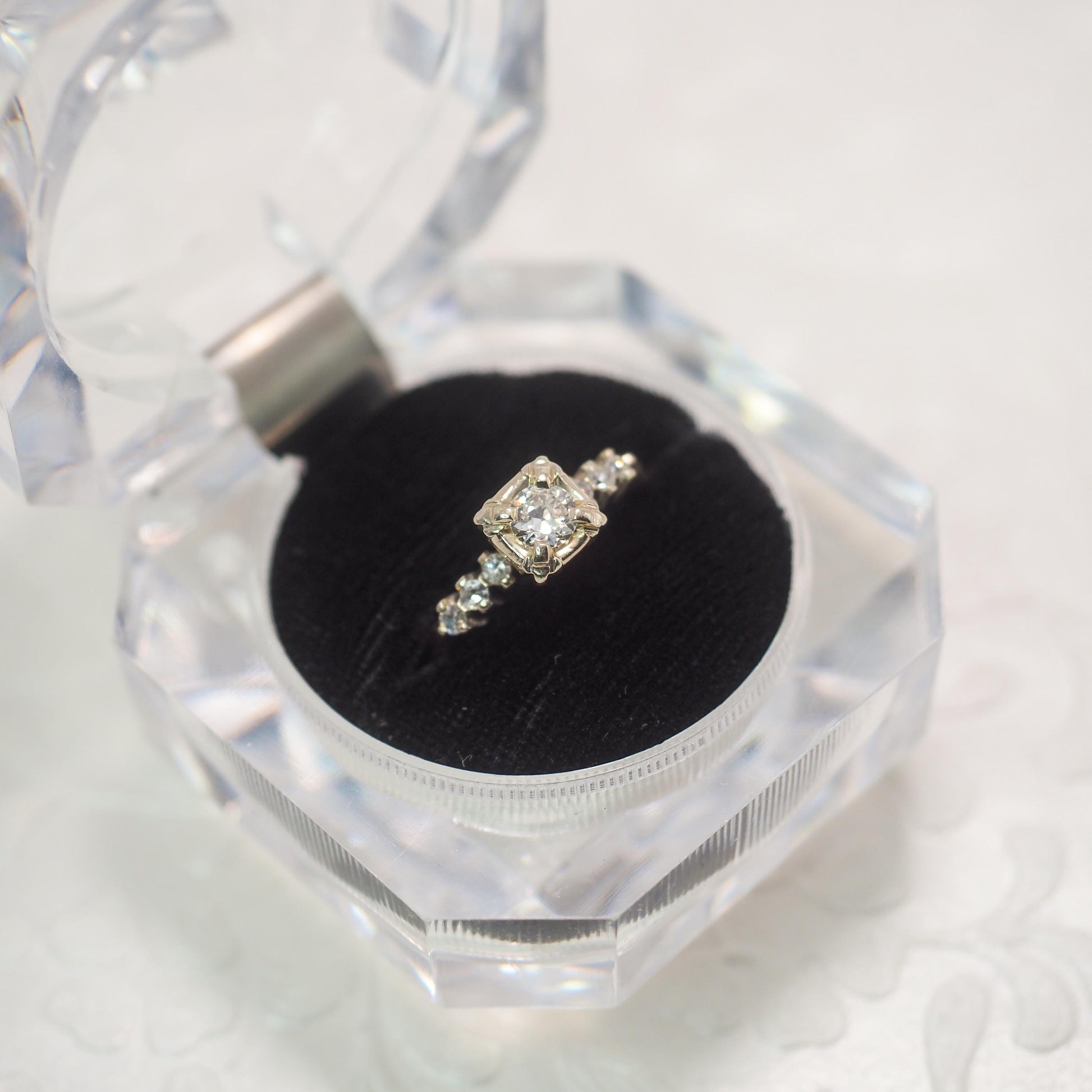 The ring is a size 6.75 and can be sized. It weighs 2.90 grams and has a 0.32-carat center diamond, which is VS2 clear and J-K in color. The six round-cut framing diamonds weigh 0.03 carats each, for a total diamond weight of 0.50 carats. The box pictured is for display only, but the ring comes with a lovely rosewood presentation box.