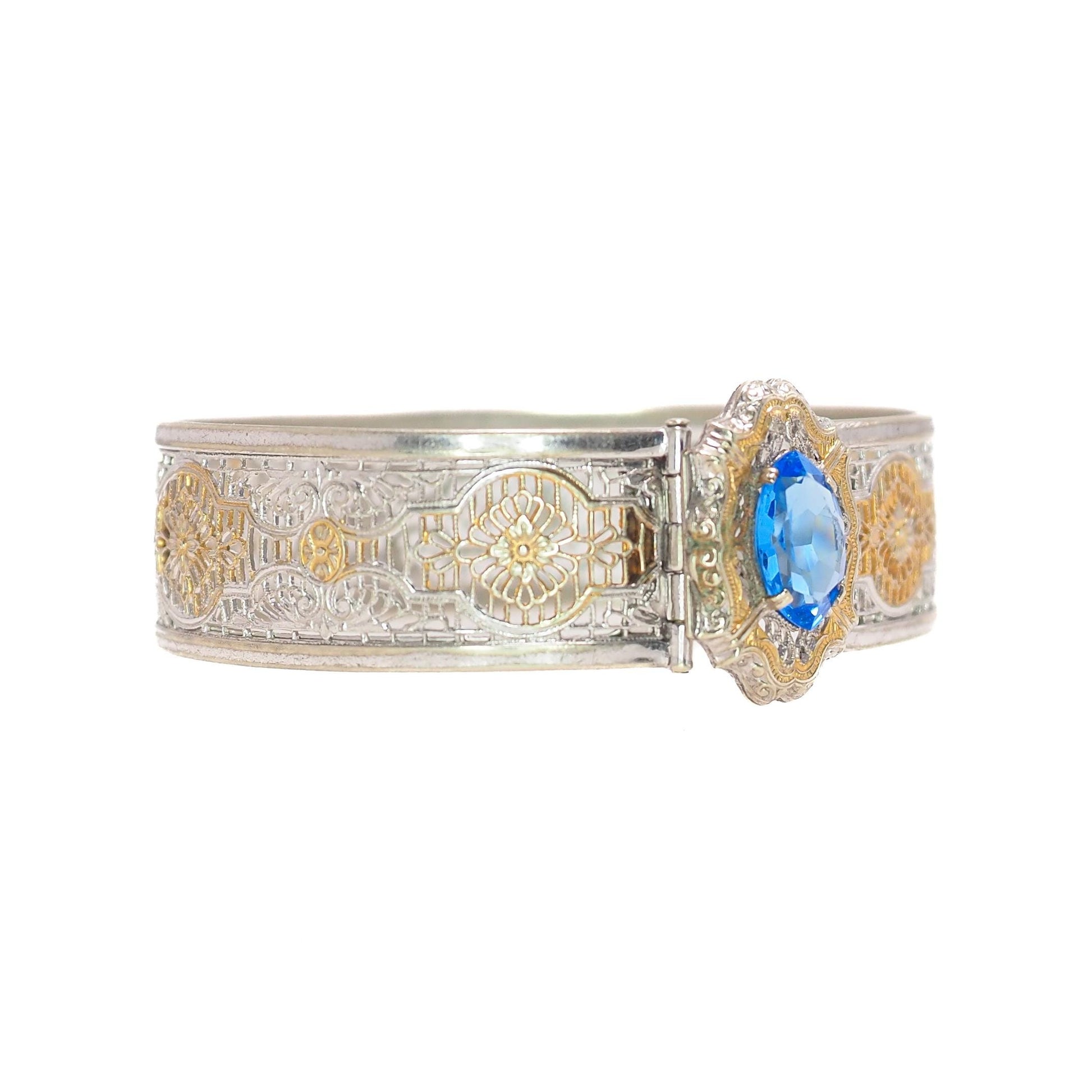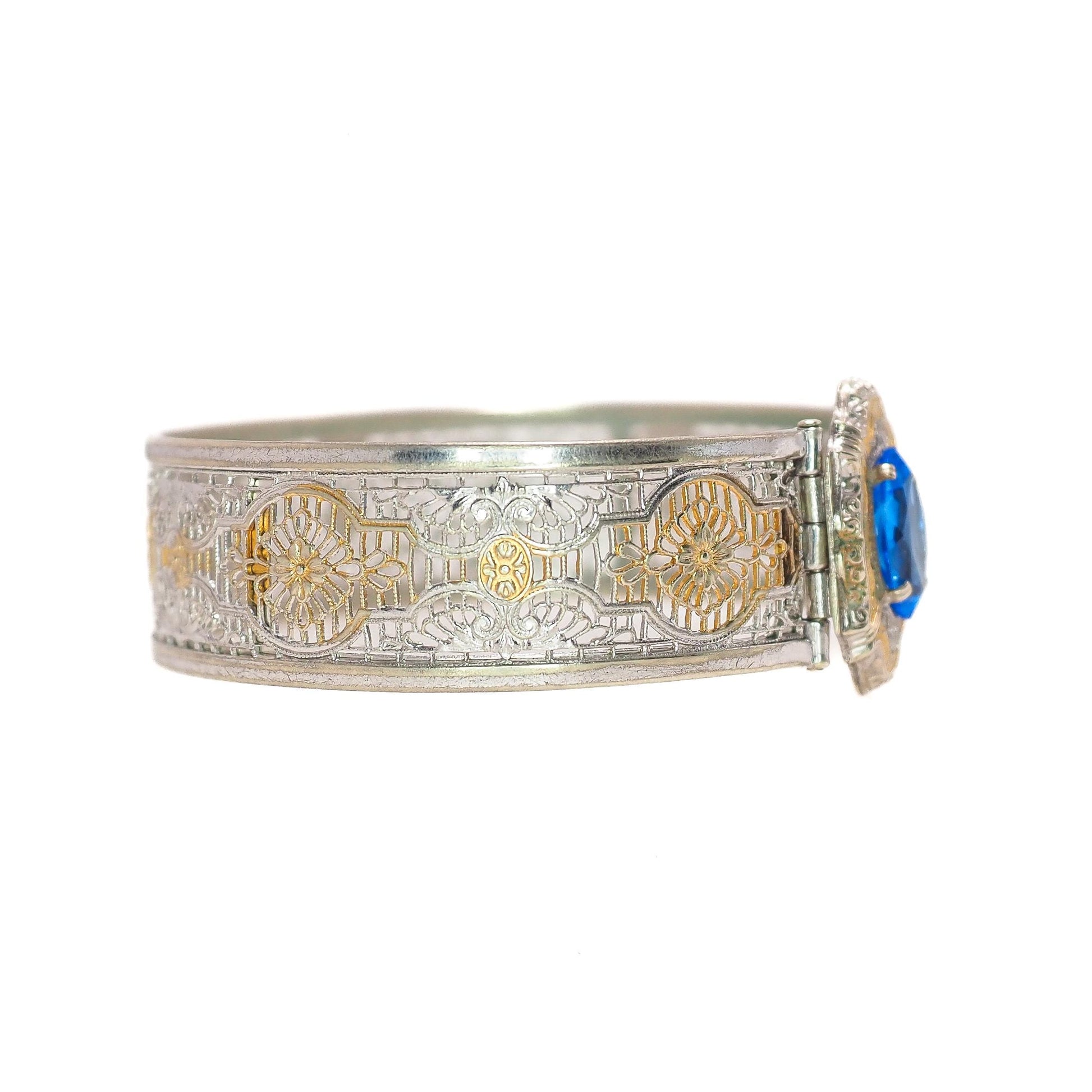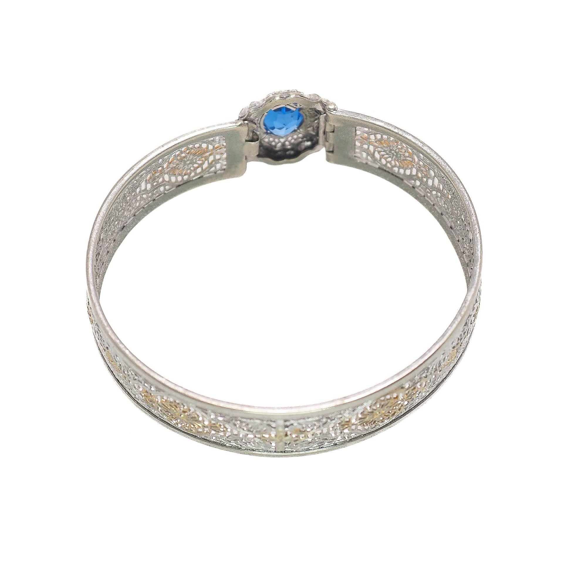 Vintage 1930s JJ WHITE Art Deco Blue Glass and Silver Plated Filigree Hinged Bangle 6.5" Bracelet