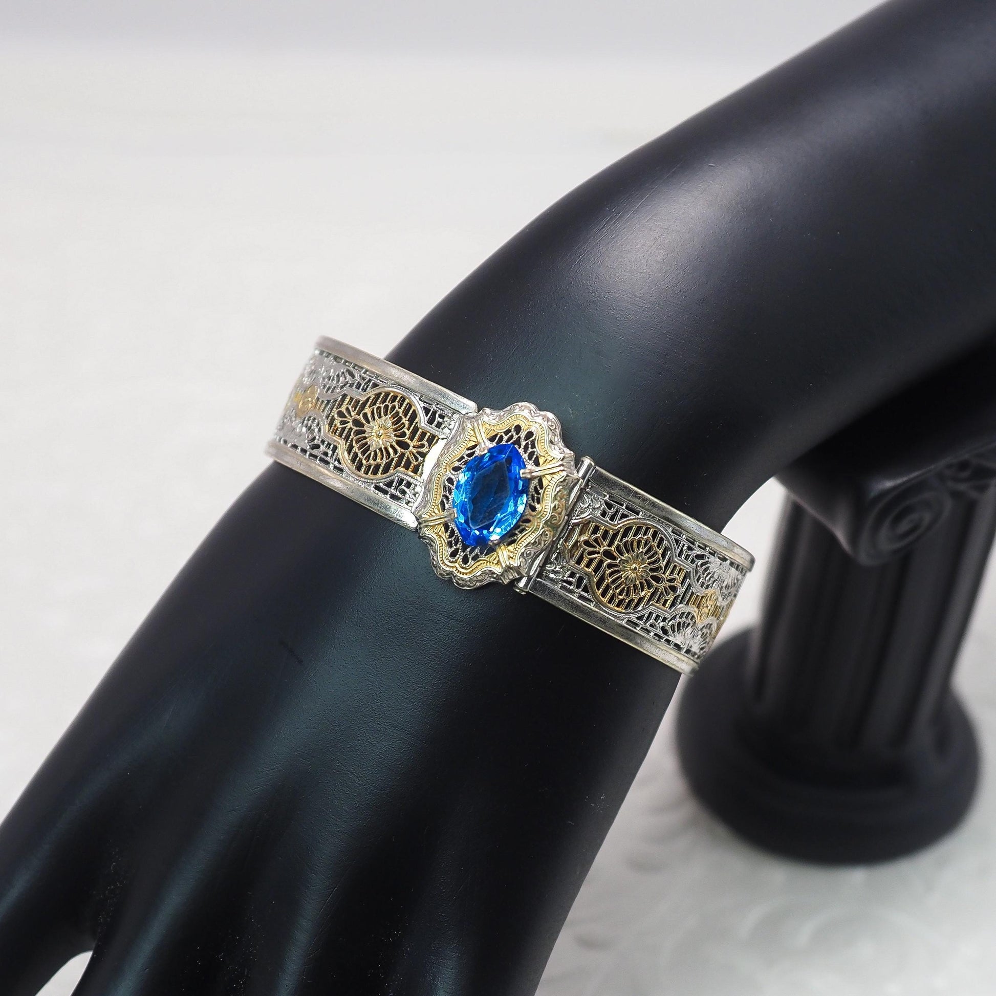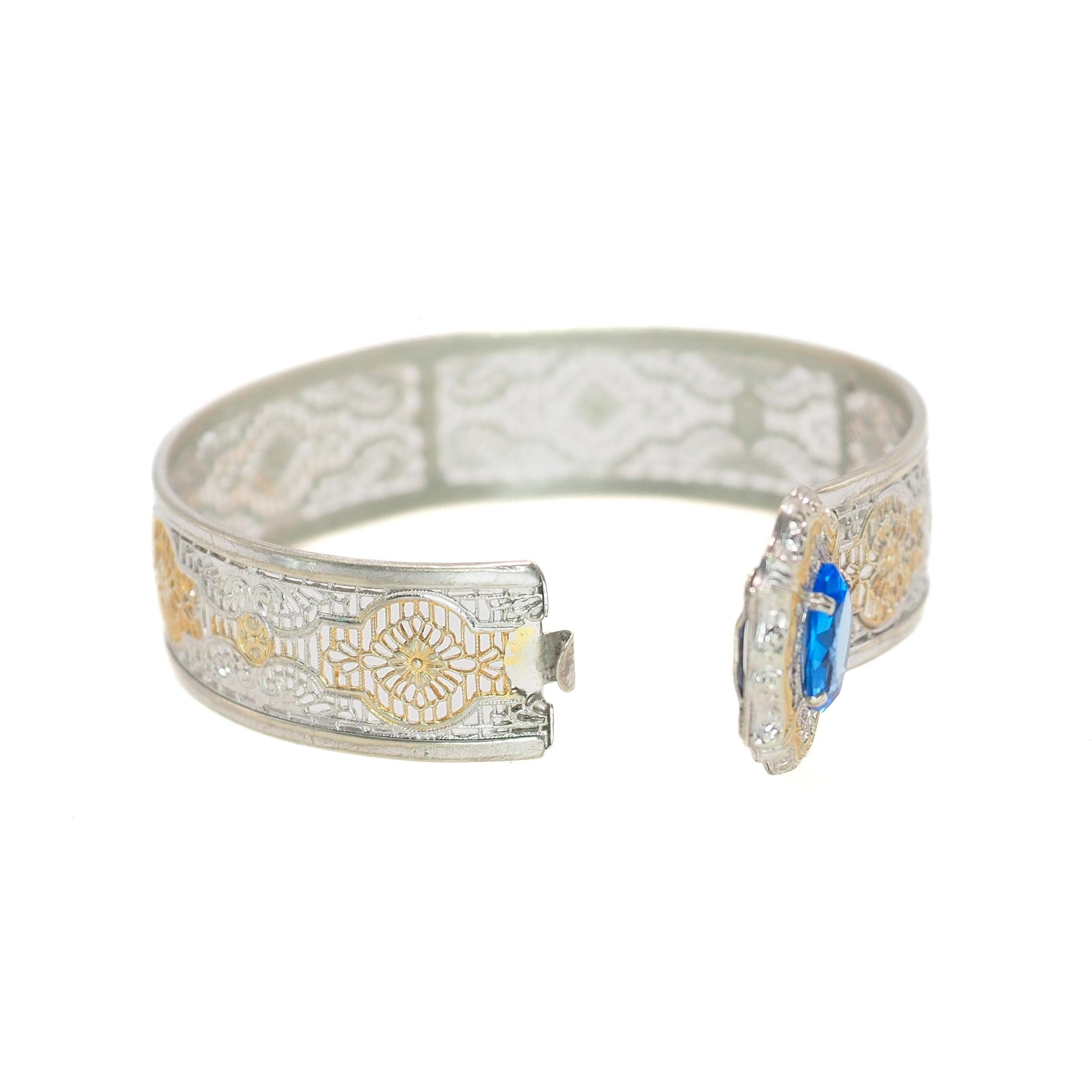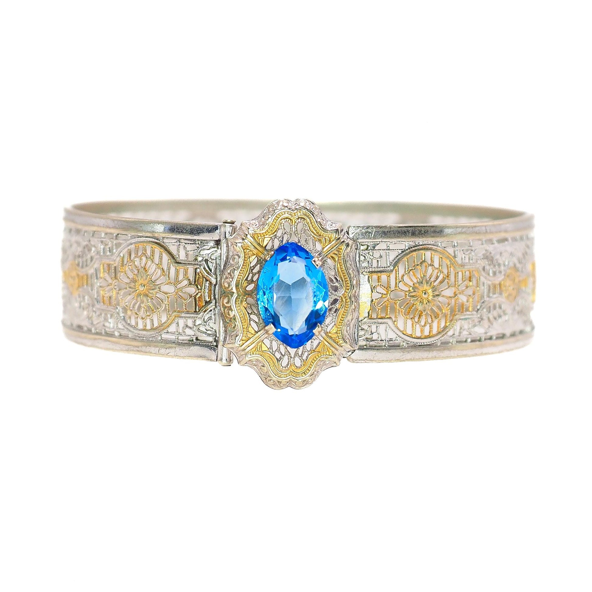 Vintage 1930s JJ WHITE Art Deco Blue Glass and Silver Plated Filigree Hinged Bangle 6.5" Bracelet