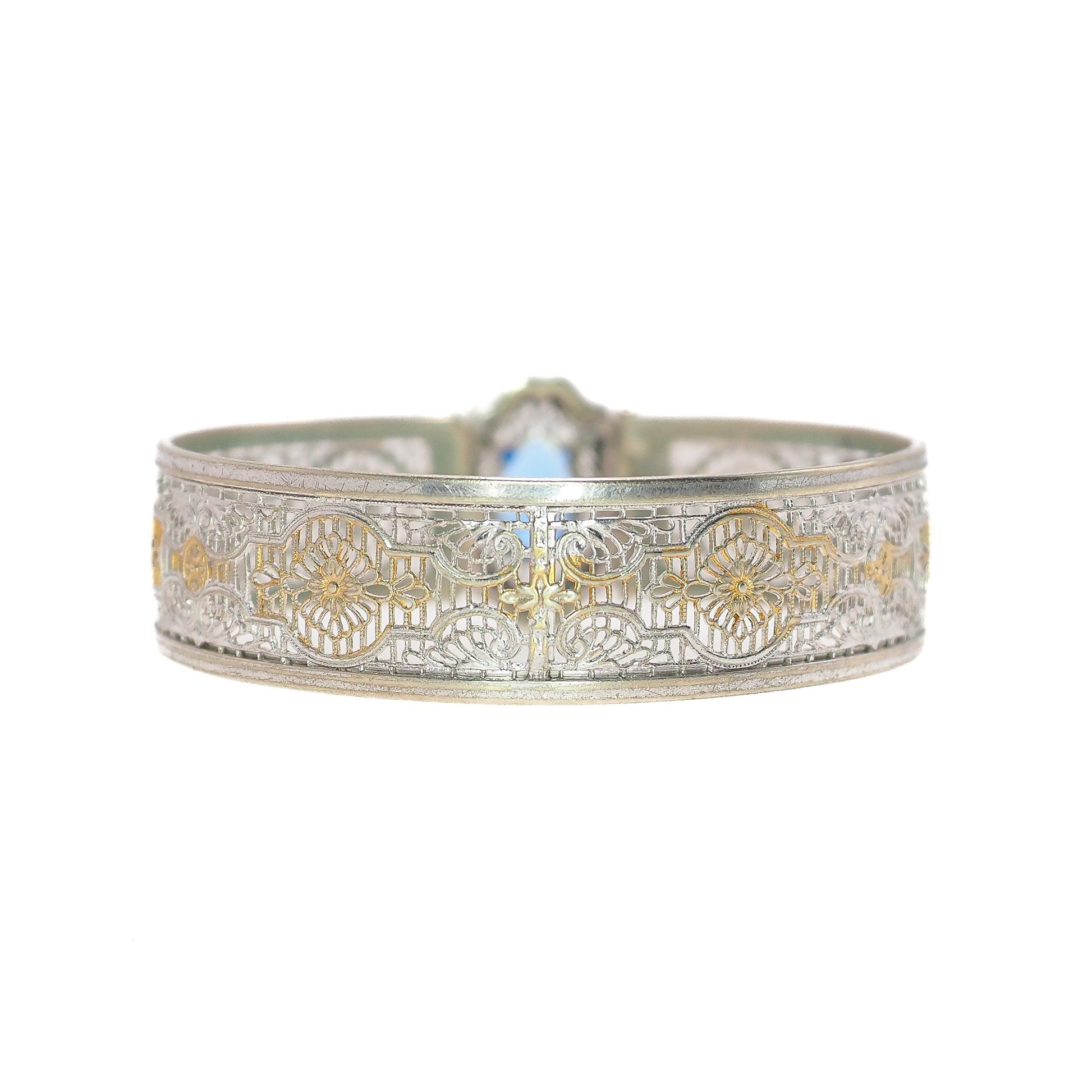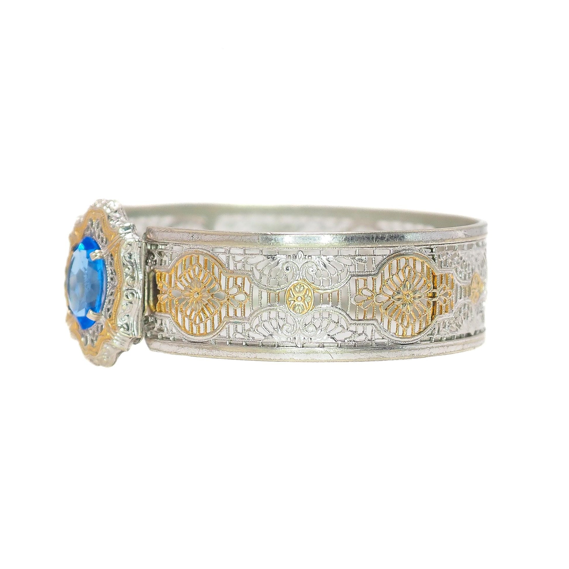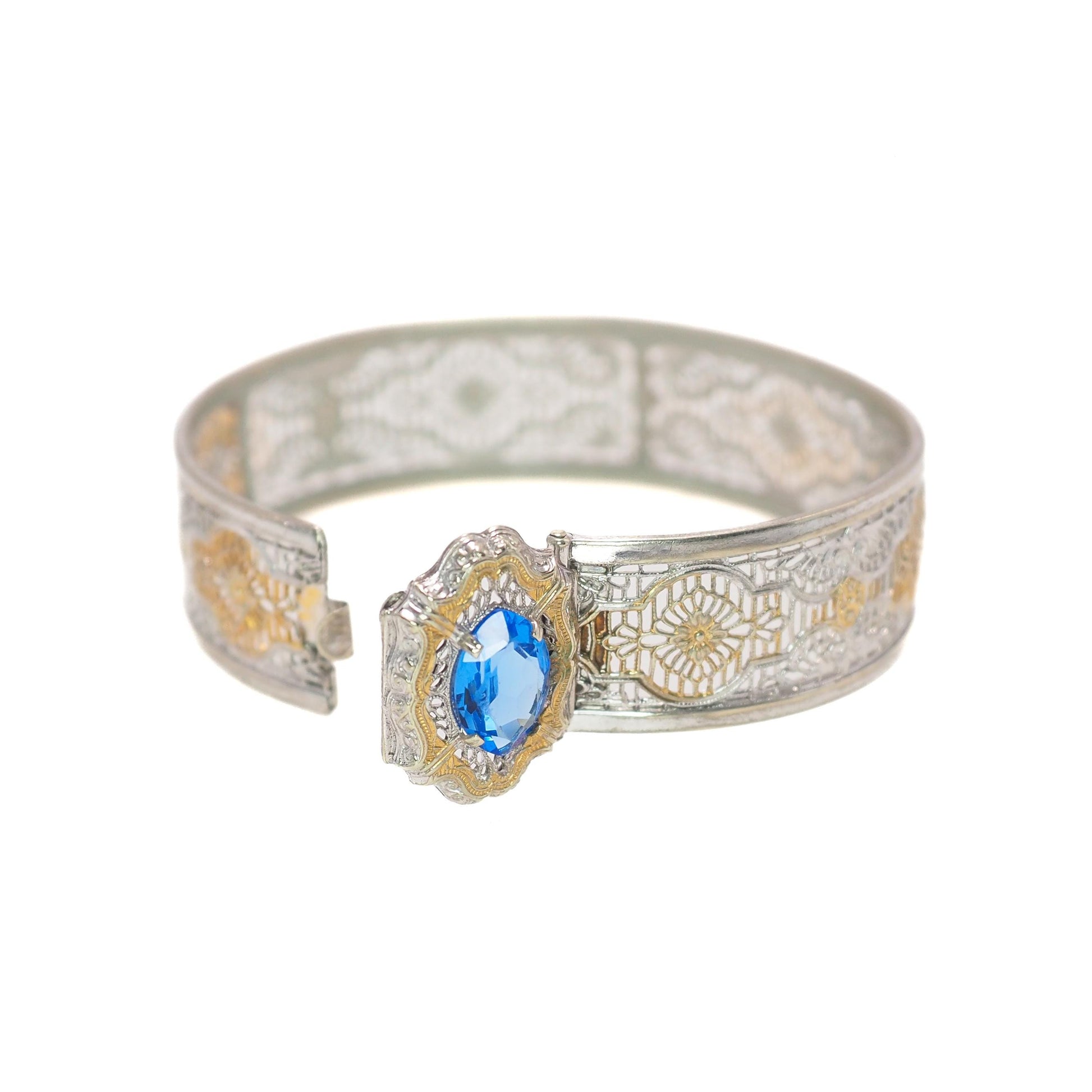 This fabulous vintage bracelet was designed in the 1930s by the J.J. White Jewelry Company. The intricate silver plate and brass filigree resemble delicate lace and add an element of femininity and elegance to the piece. The bright blue, faceted glass is bezel set into the bangle and pops against the metal. A fabulous Art Deco piece to add to your collection.