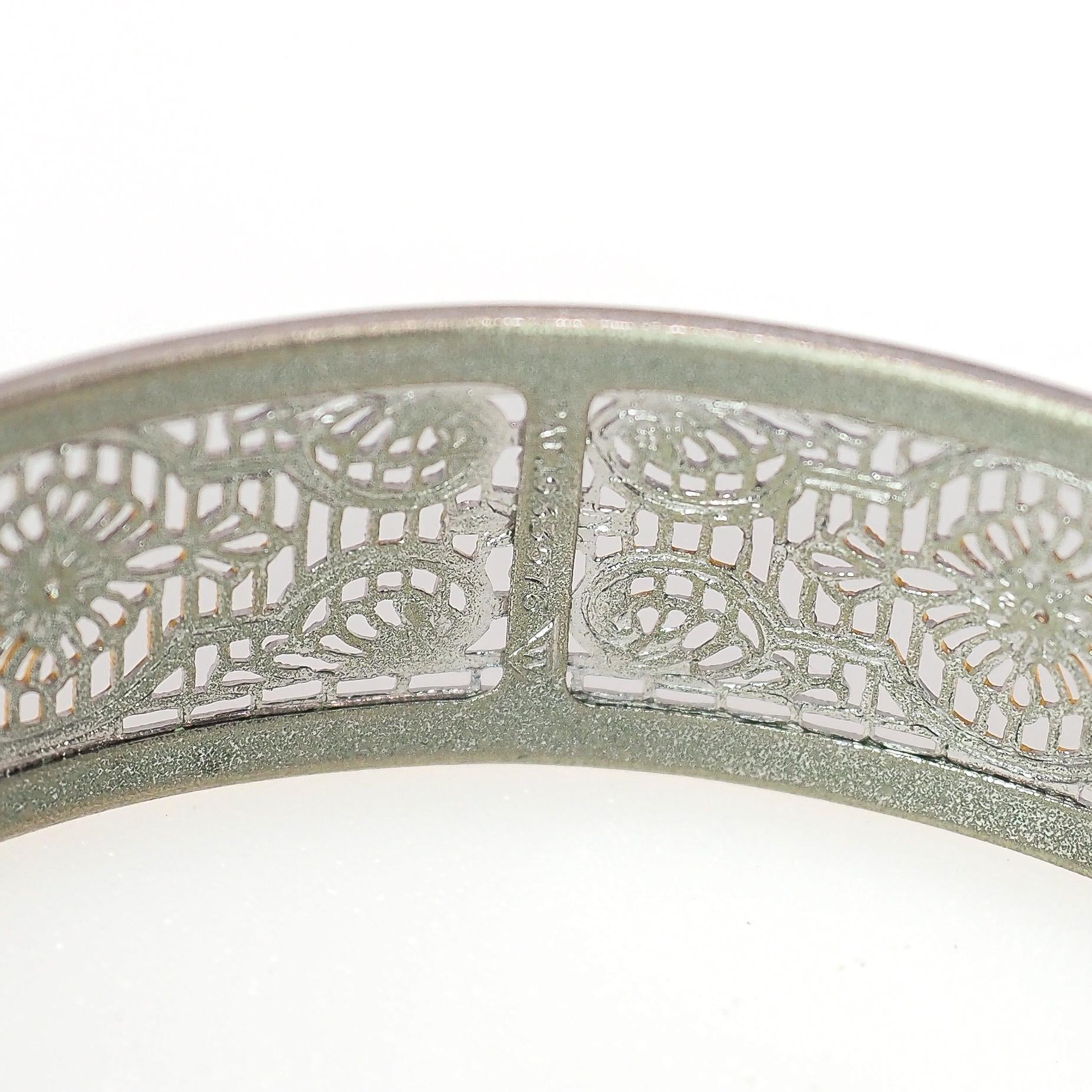 The bangle is in very good vintage condition with typical signs of wear. The plate is lightly scratched on the inside of the bangle on the clasp. The glass has a small chip and a few lines and marks. The filigree is not broken, bent, or damaged. The bracelet is stamped PAT 1933575.