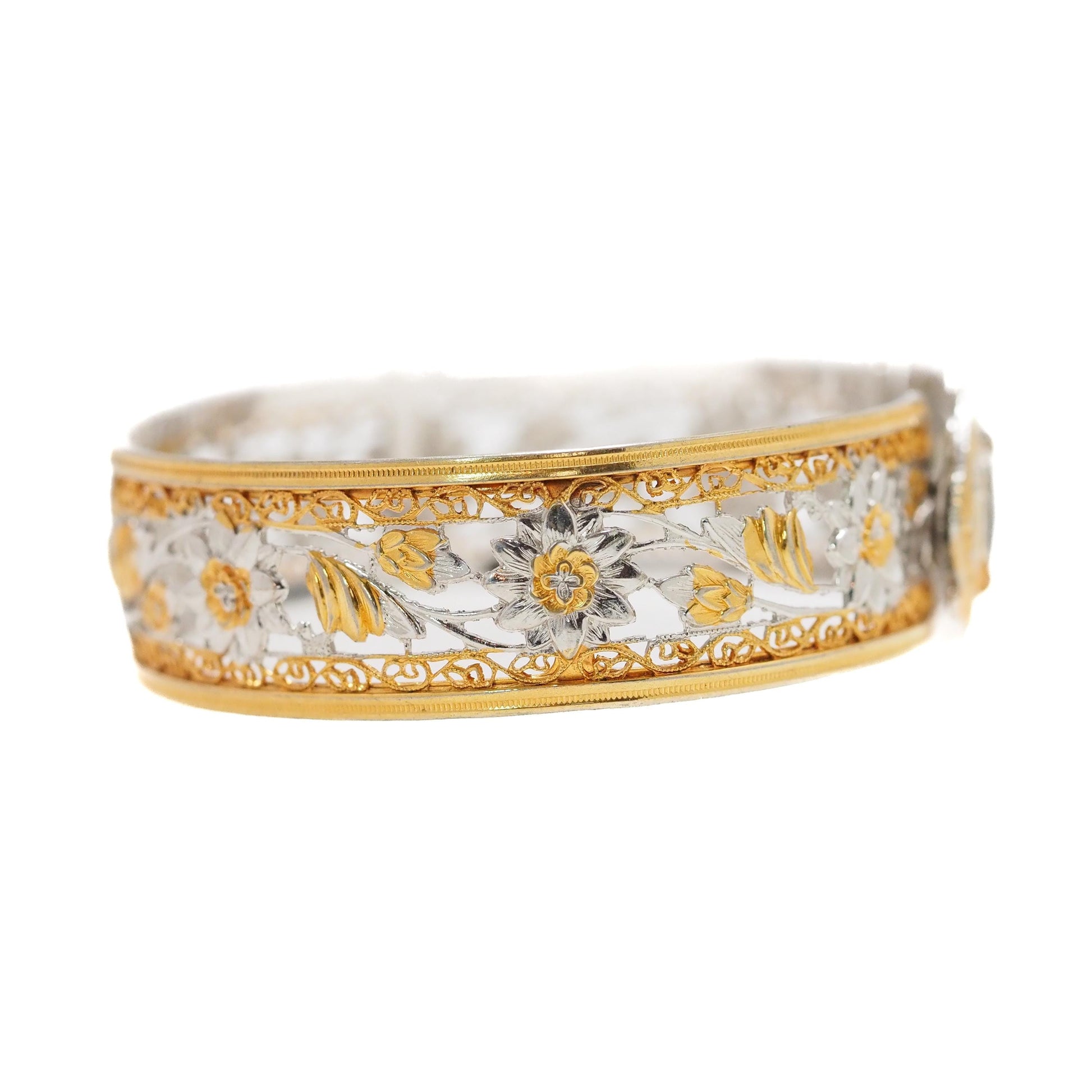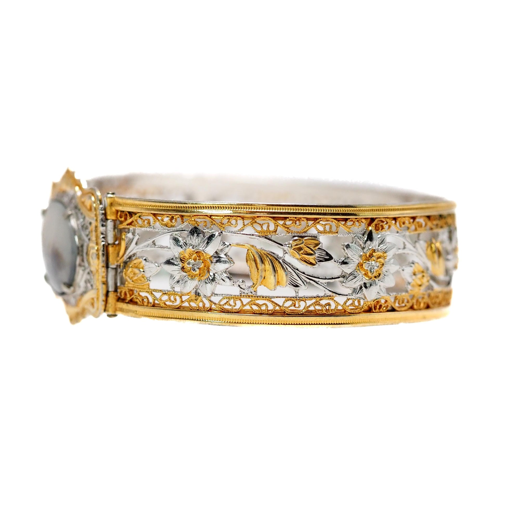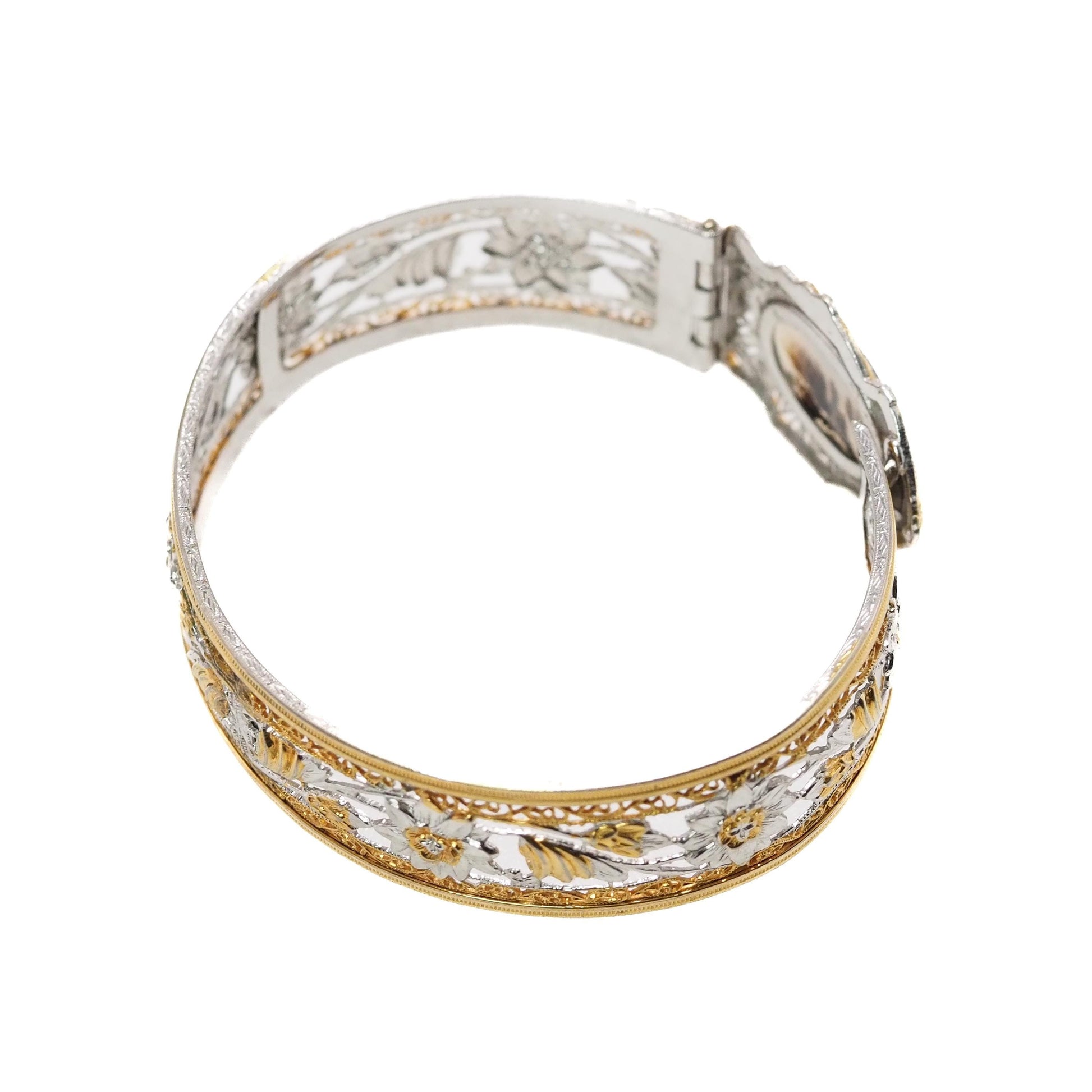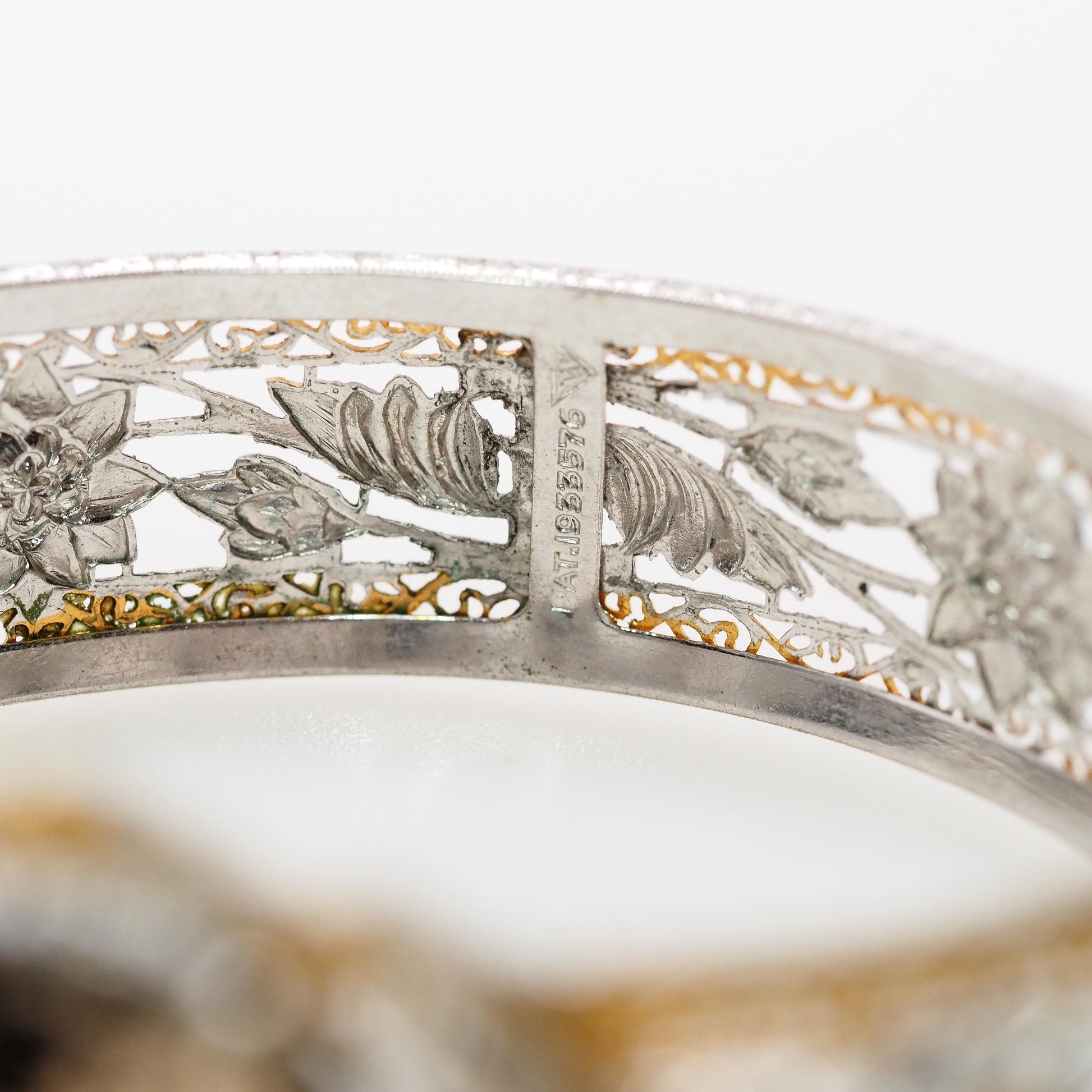 The bangle is in very good vintage condition with typical signs of wear. The plate is lightly scratched on the inside of the bangle on the clasp. The glass has a small chip, a few lines, and marks. The filigree is not broken, bent, or damaged. The bracelet is stamped PAT 1933576.