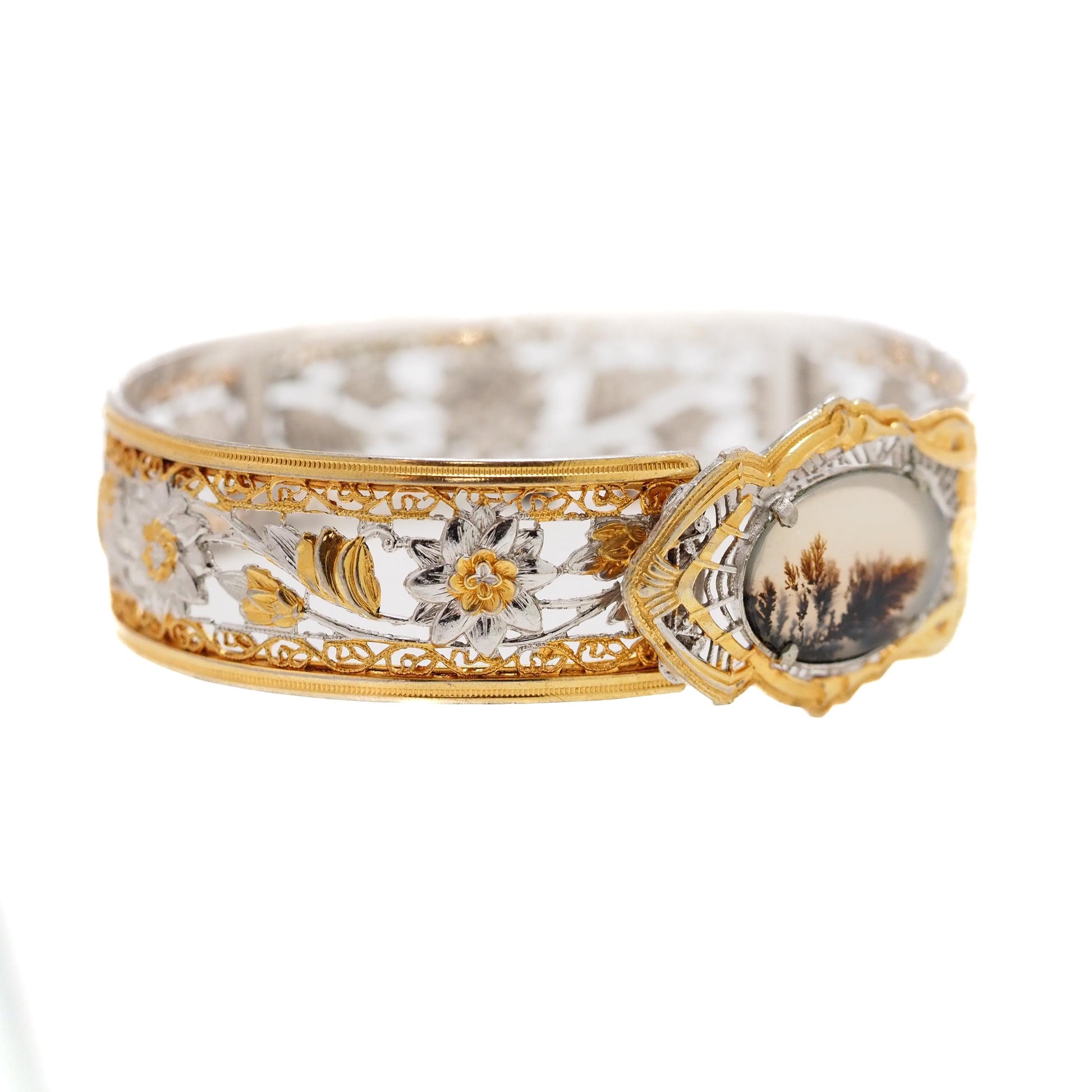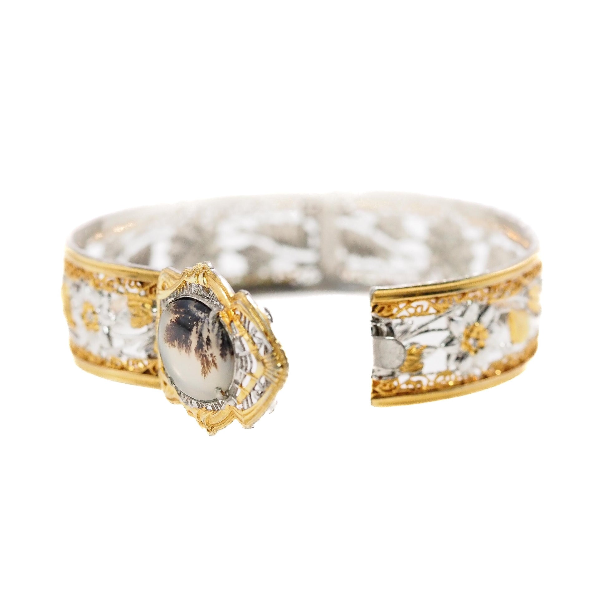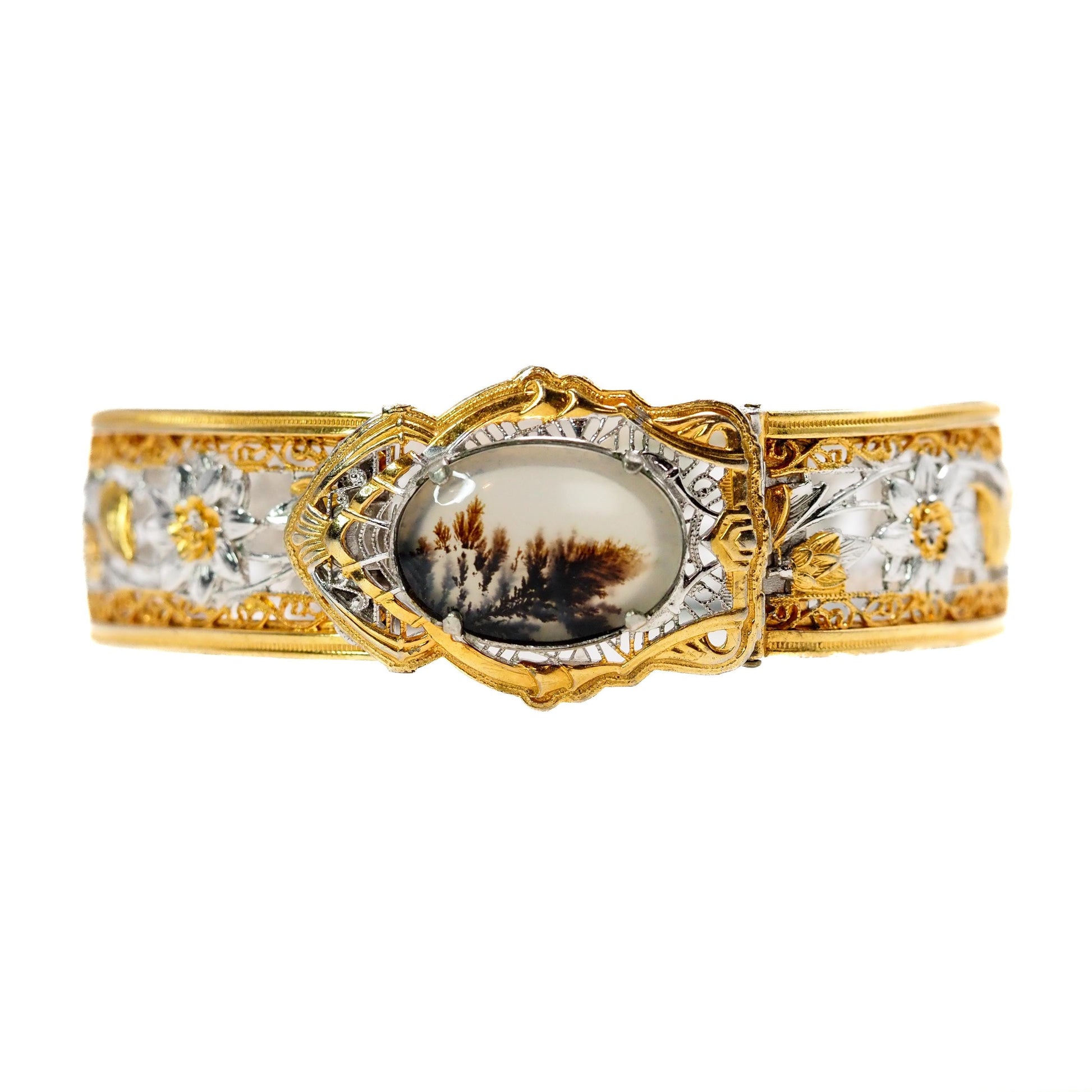 This fabulous vintage bracelet was designed in the 1930s by the J.J. White Jewelry Company. The intricate silver plate and brass filigree resemble delicate lace and add an element of femininity and elegance to the piece. The dendritic agate cabochon is a bezel set into a bangle that pops against the metal - a fabulous Art Deco piece to add to your collection.