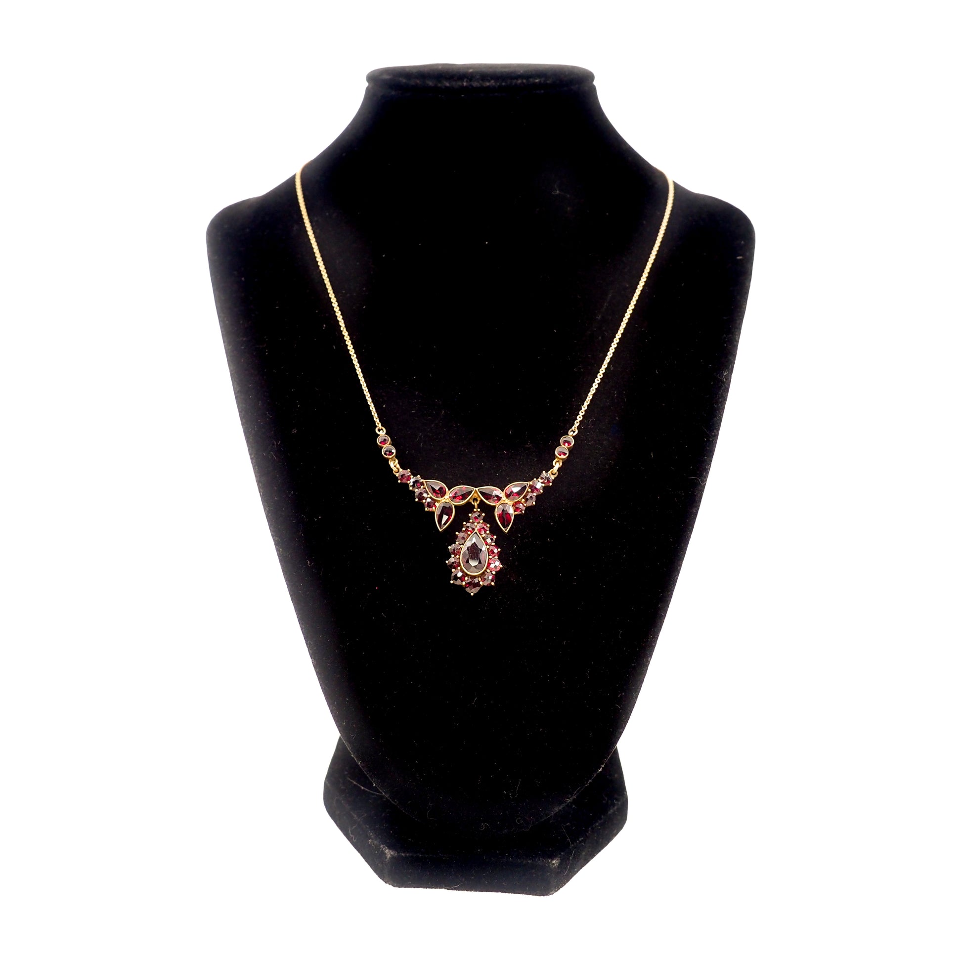 The necklace is in excellent antique condition with minimal signs of wear. The garnets are also in excellent condition; none are cracked or chipped, although some have tiny nicks on the facet junctions, visible under magnification. The gilt's surface shows fine lines and marks typical of antique jewelry.