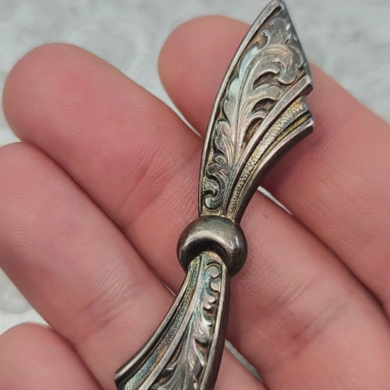 This highly stylized vintage bow brooch was crafted in the 1940s from 835 silver. The flowing, whimsical design of the pin enhances its vintage character. A beautiful unisex brooch to add to your collection!