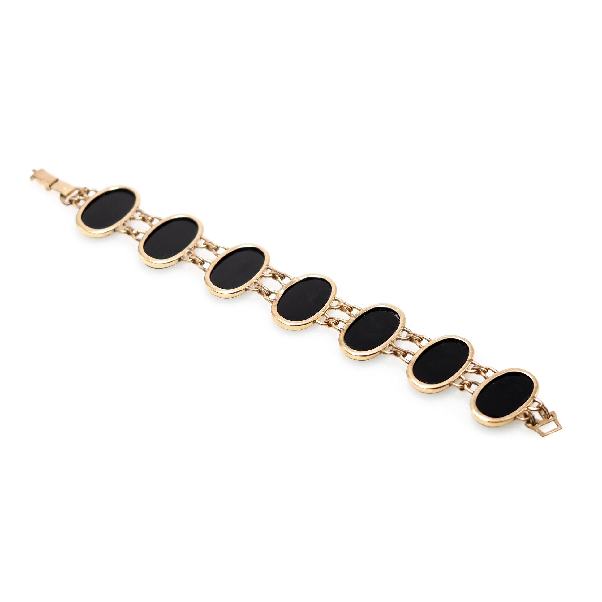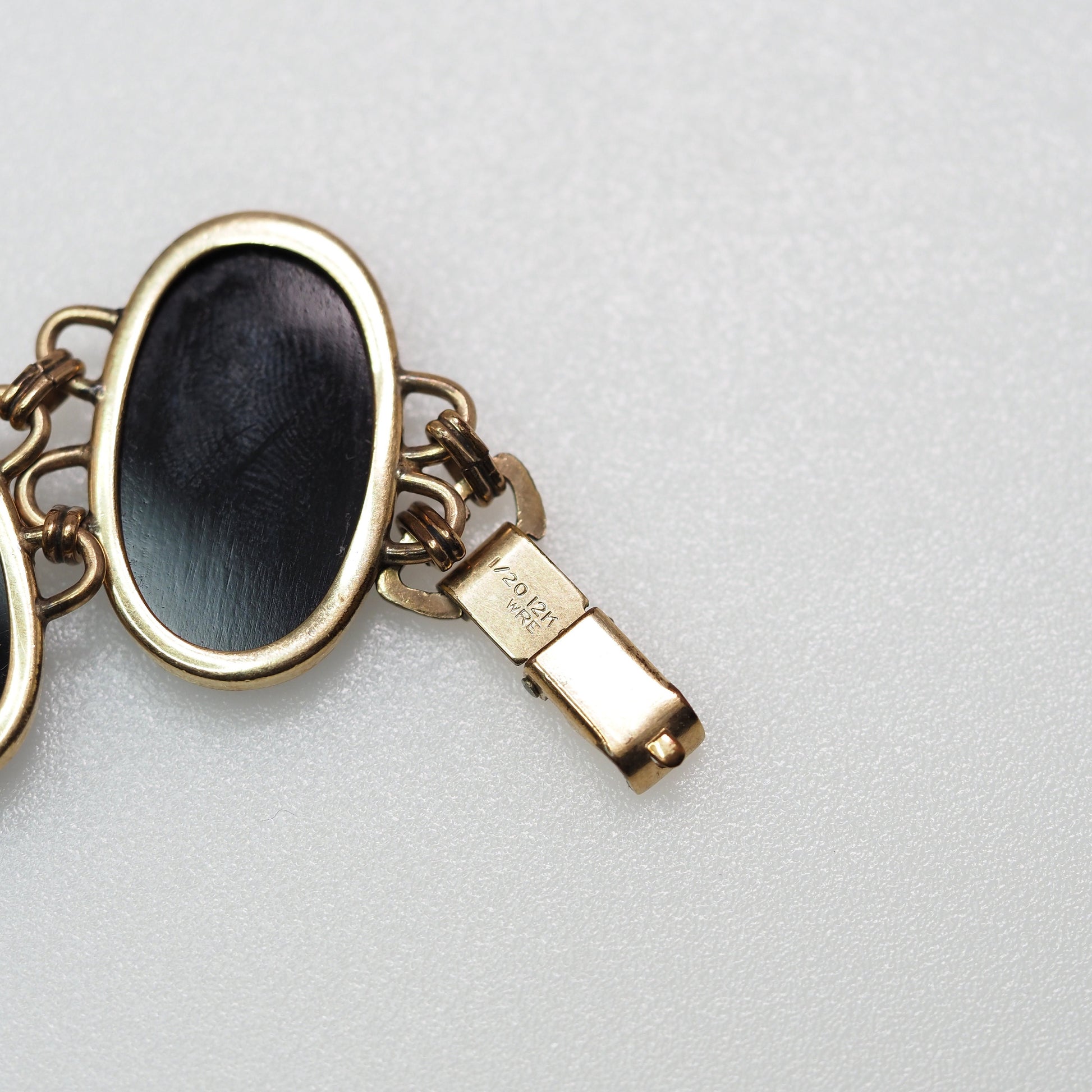 The bracelet is in very good vintage condition with minimal signs of wear. The surface of the gold-fill and onyx shows fine lines and marks but nothing noticeable or distracting. The onyx is secure in the setting and does not wiggle or move. There are no chipped or cracked cabochons; the stones were tested. The back is stamped 1/20 12K GF. The fold-over clasp is fully functional.