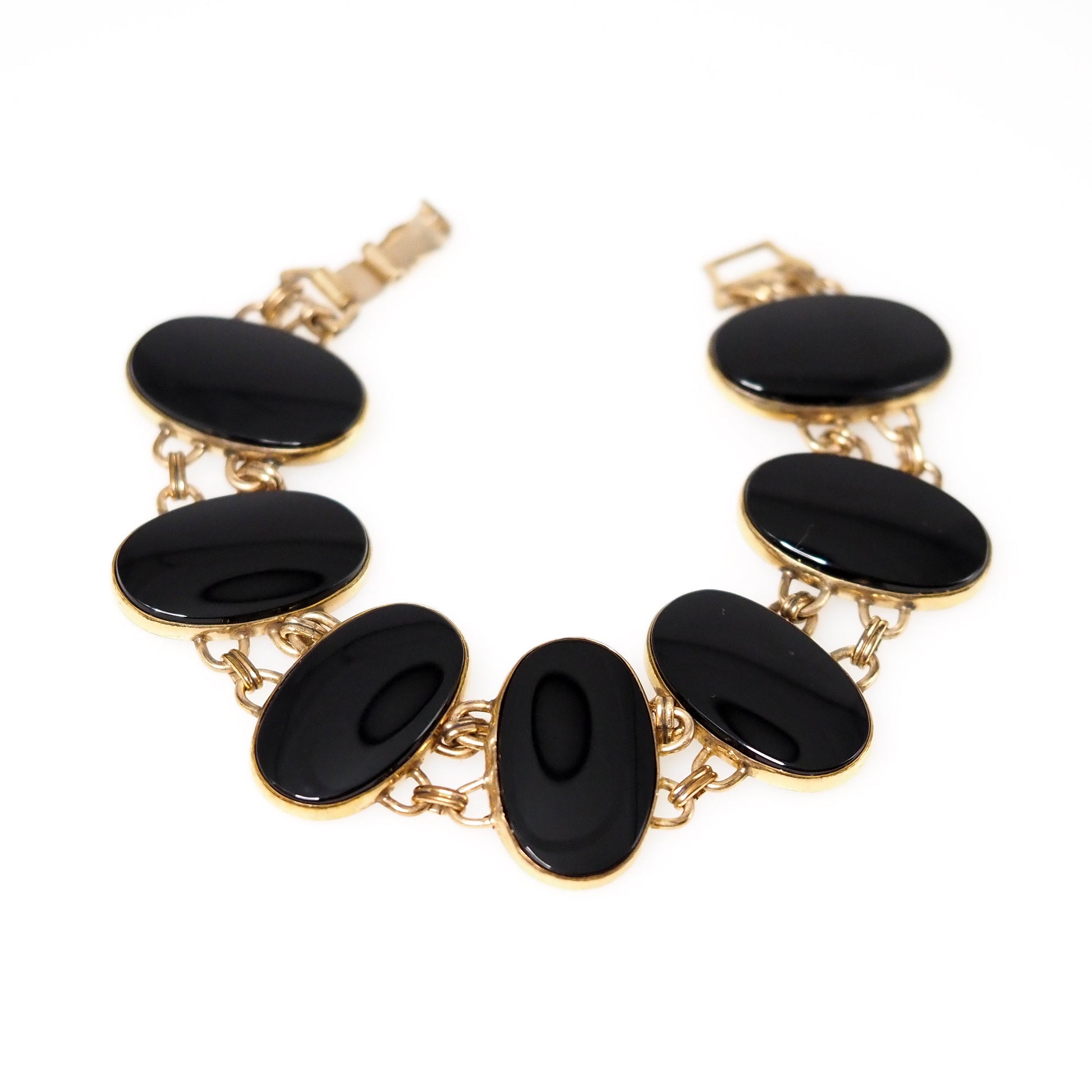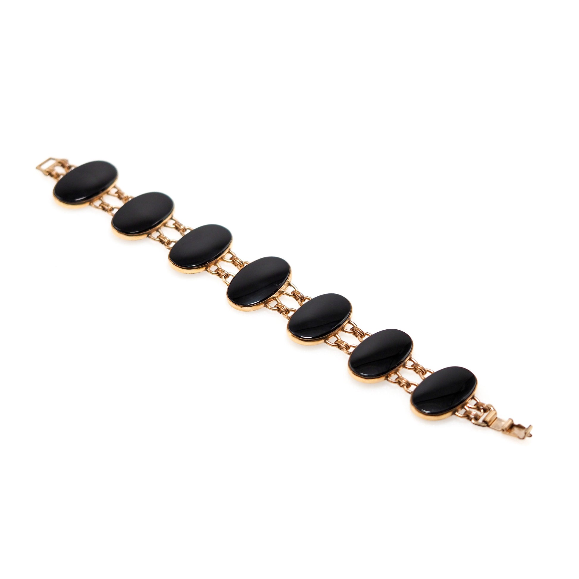 Vintage 1940s Retro Oval Black Onyx, Yellow Gold Filled Large Link 7" Bracelet