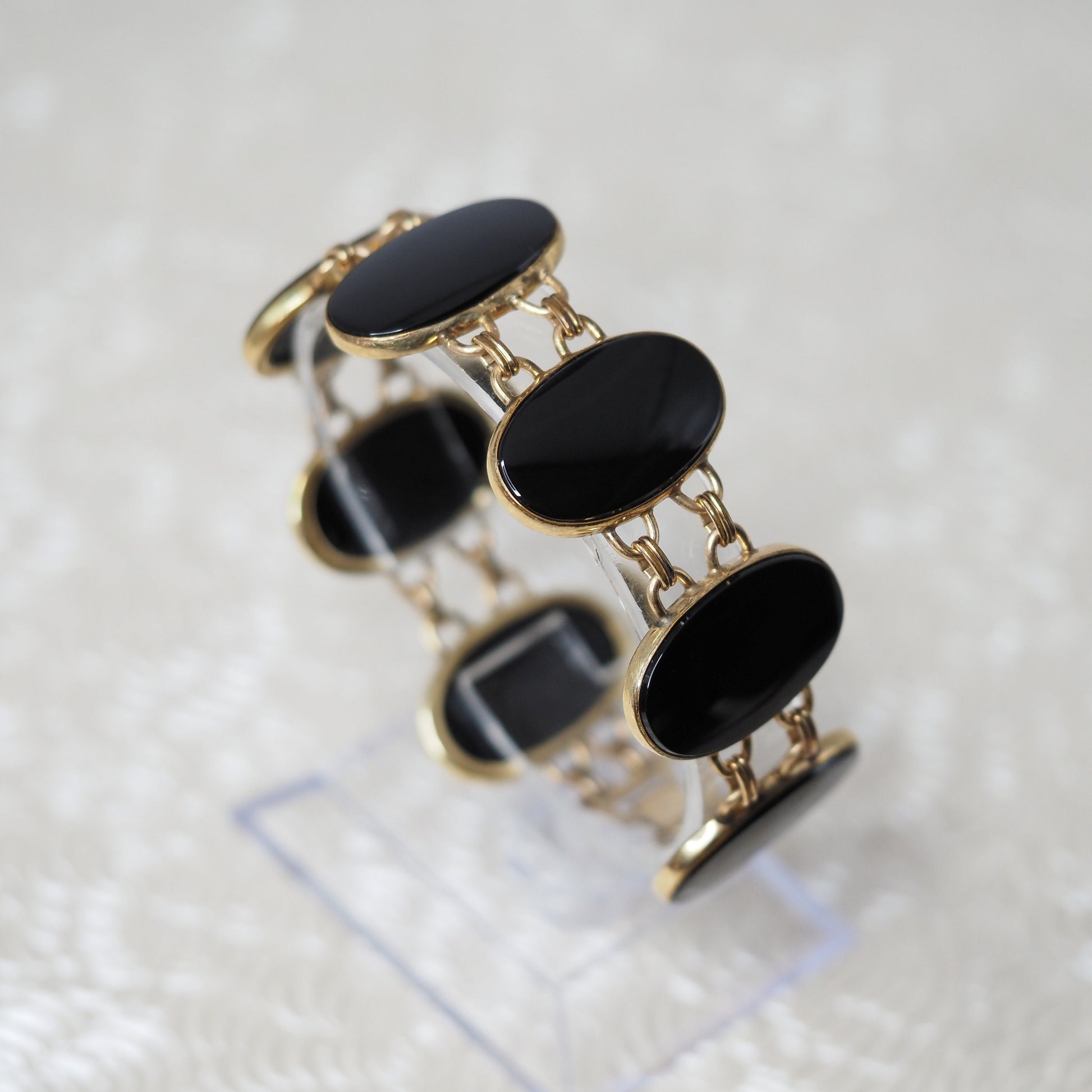 Discover elegance and charm with our Vintage 1940s Black Onyx Bracelet. This exquisite piece showcases black onyx gemstones set in yellow gold-filled metal, exuding timeless sophistication. Perfect for special occasions or everyday style, it‘s a must-have for vintage enthusiasts looking to add 1940s flair to their collection. Elevate your look with this classic beauty today!