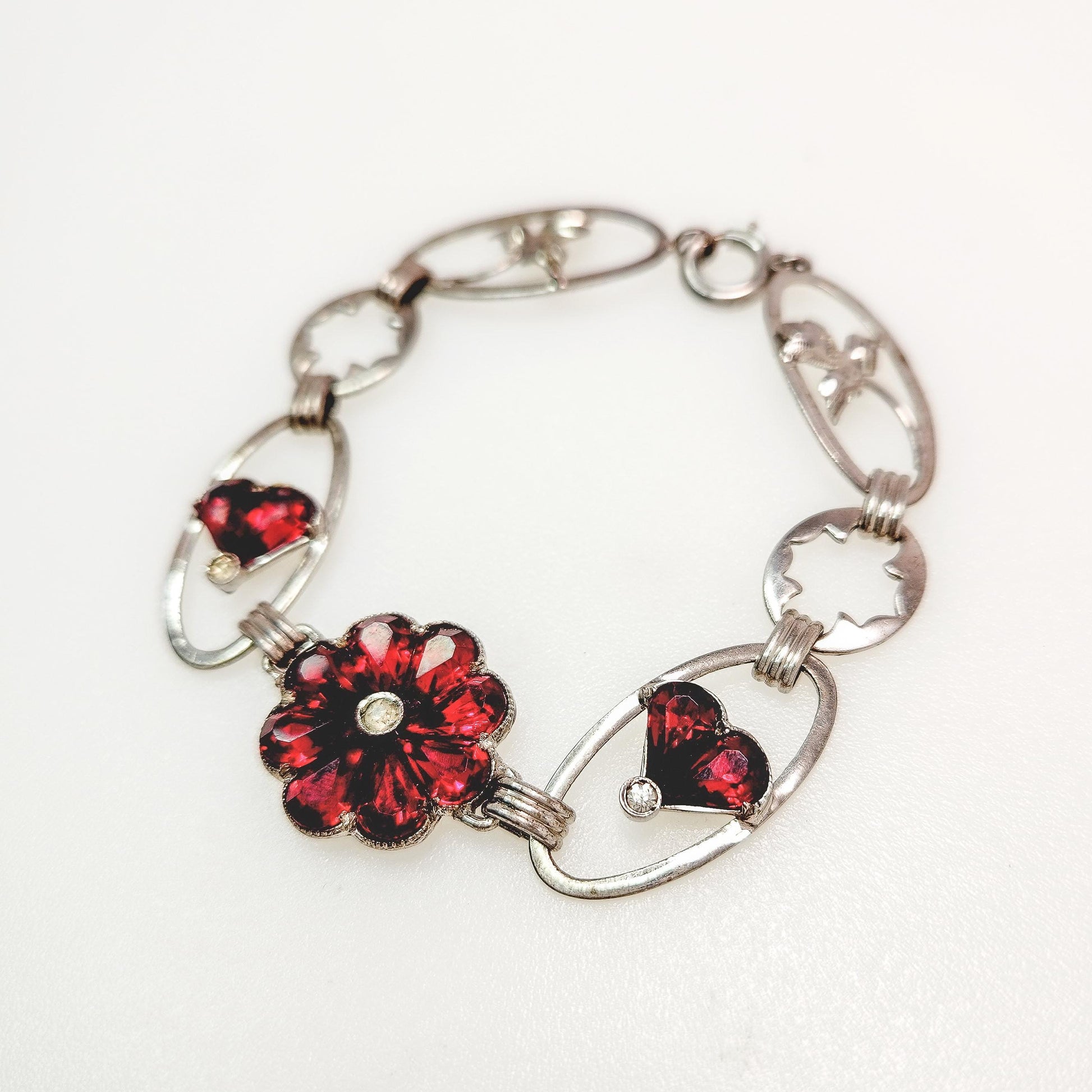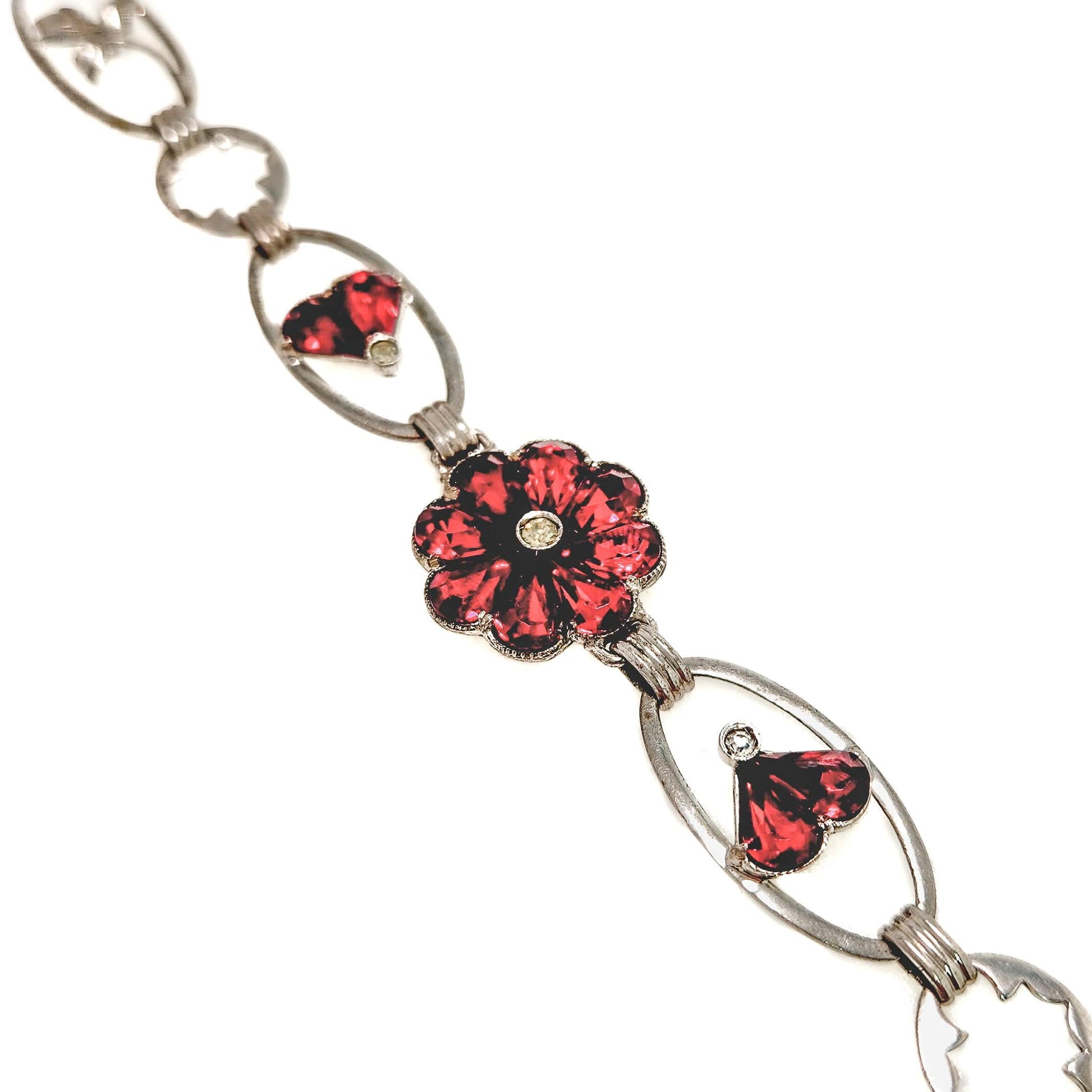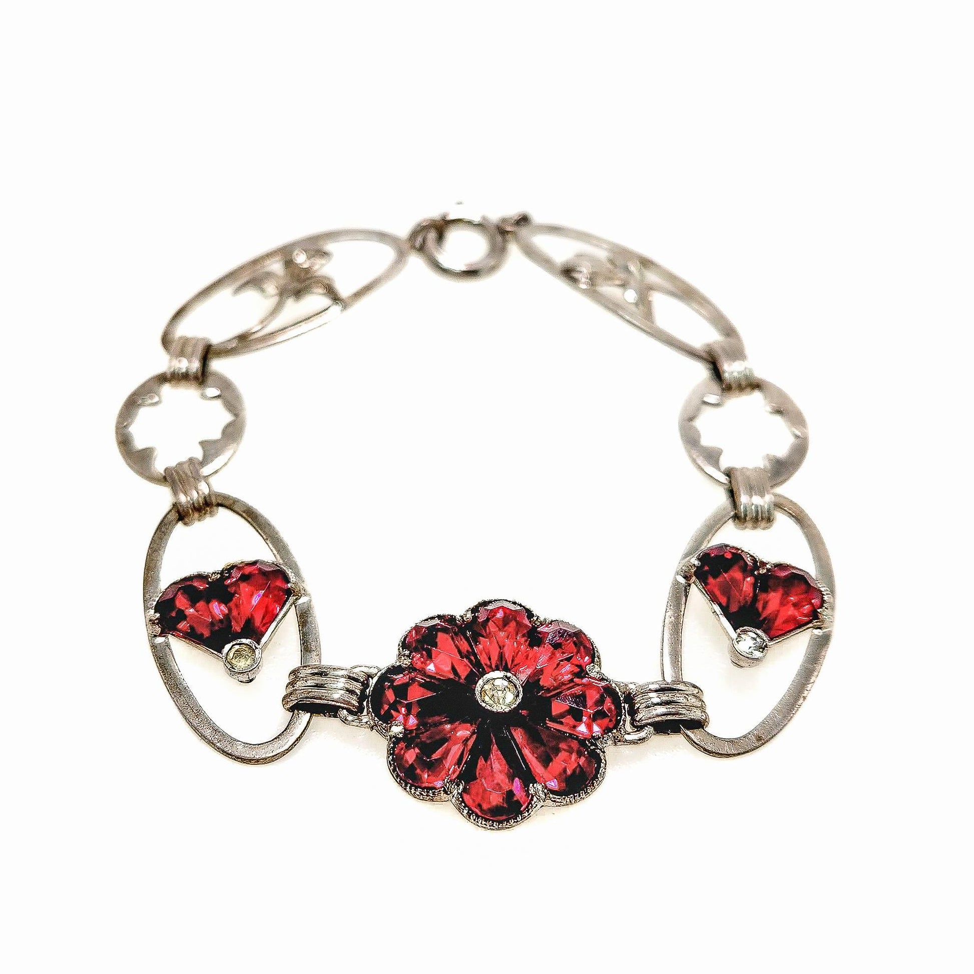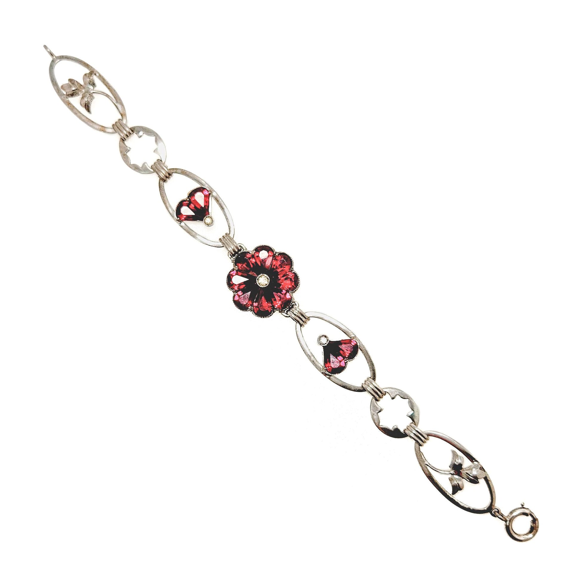 Vintage 1940s Retro Art Deco Sterling Silver and Red Flower Link 6-1/4" Bracelet