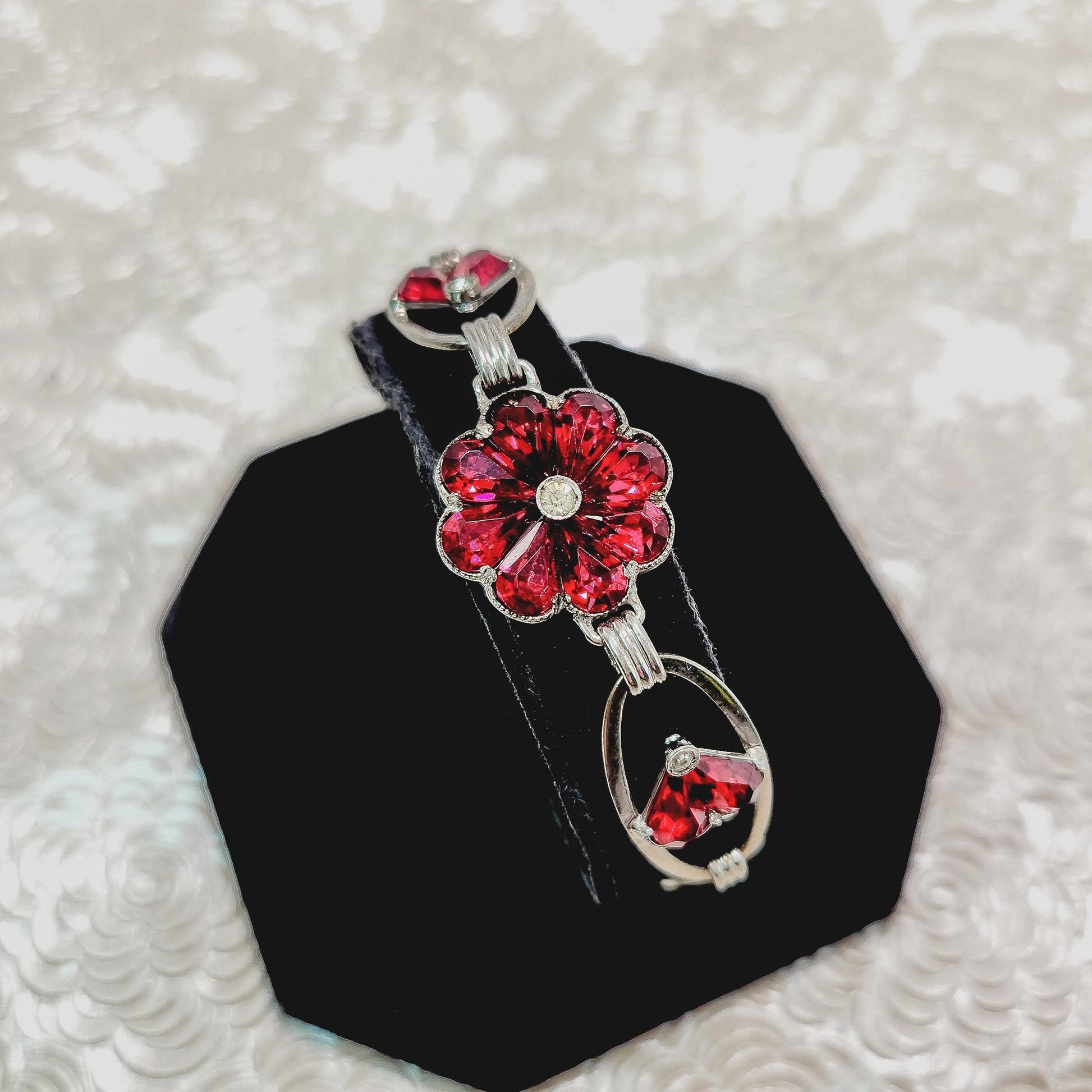 Indulge in the allure of the 1940s with this exquisite red glass flower bracelet delicately crafted from sterling silver. Embrace the timeless beauty of this piece and elevate your style with a touch of vintage elegance.
