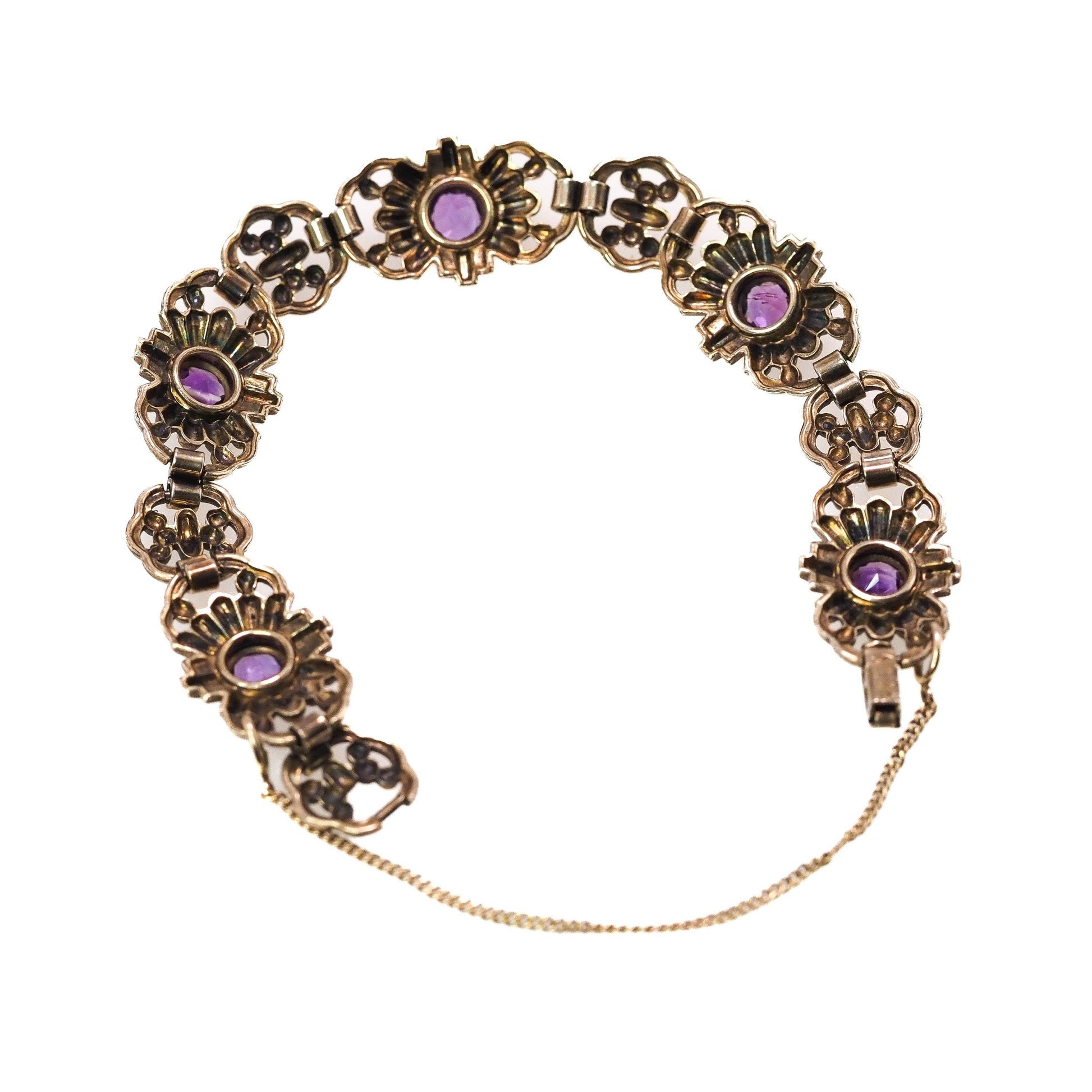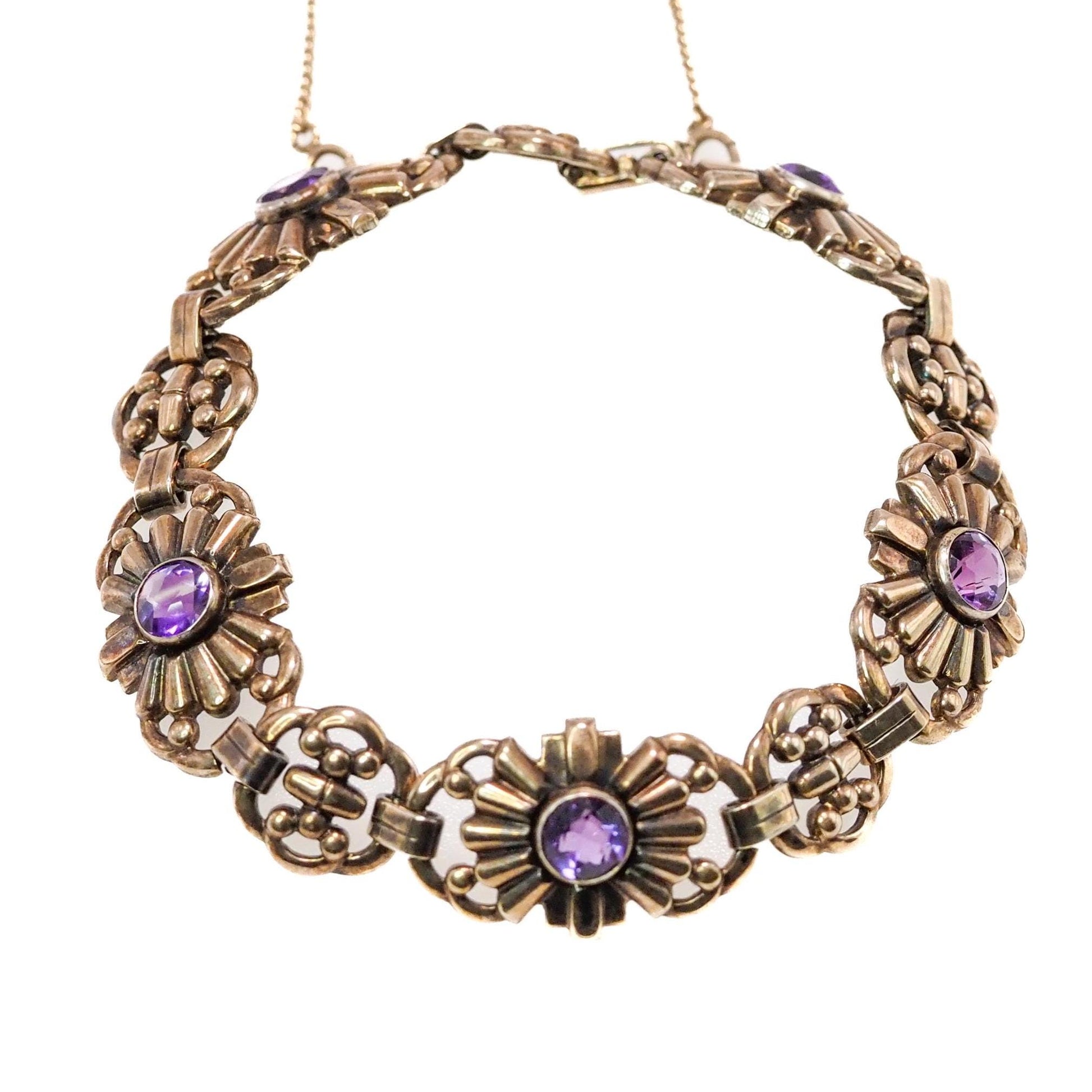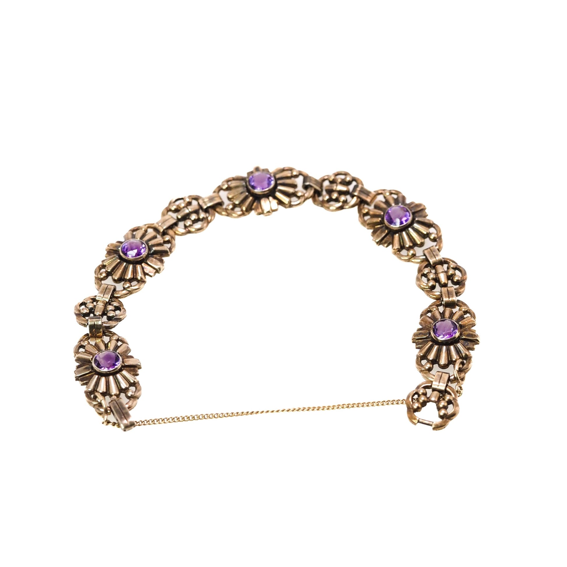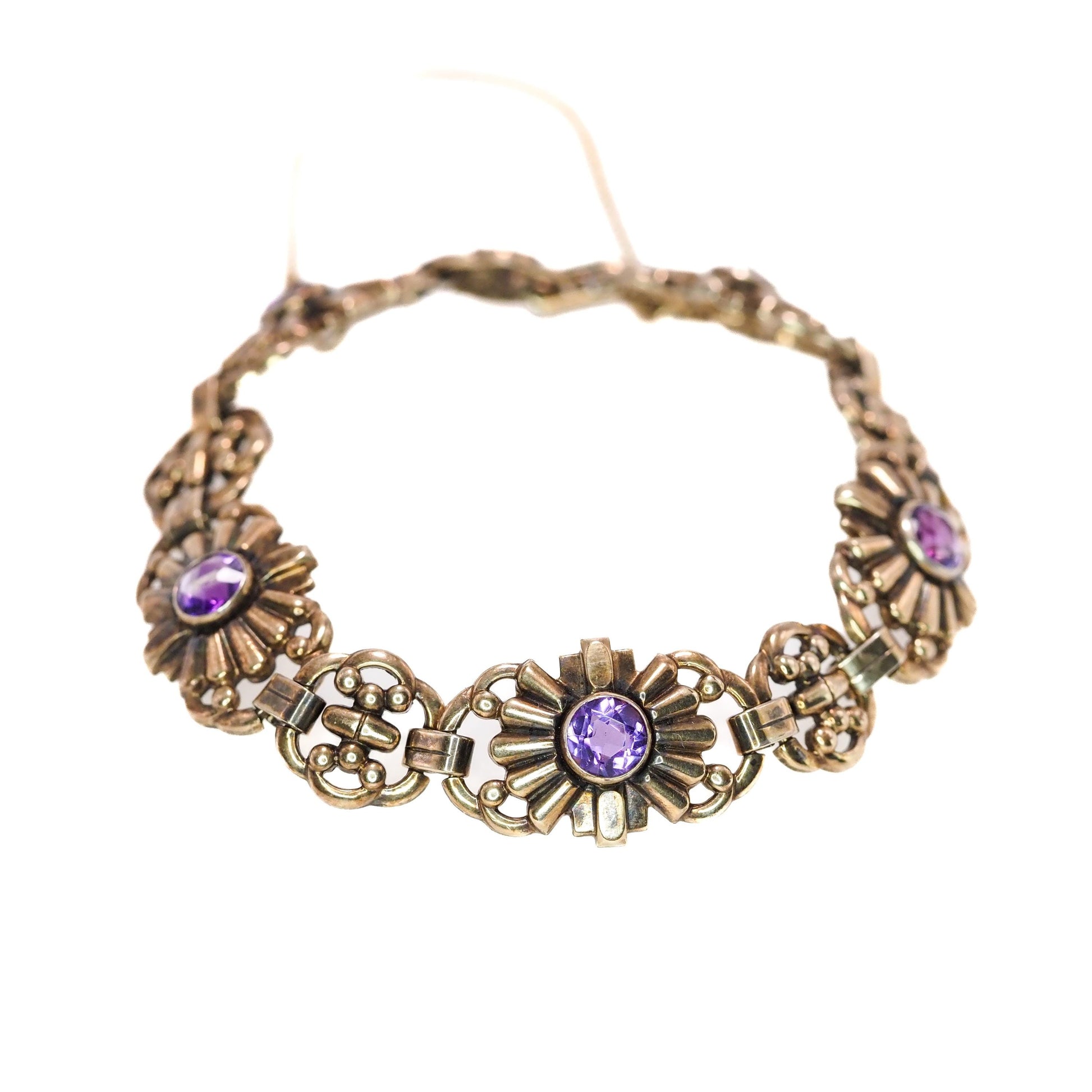 Vintage 1940s Retro Art Deco Purple Glass and Rose Gold Fill Flower Link 7" Bracelet