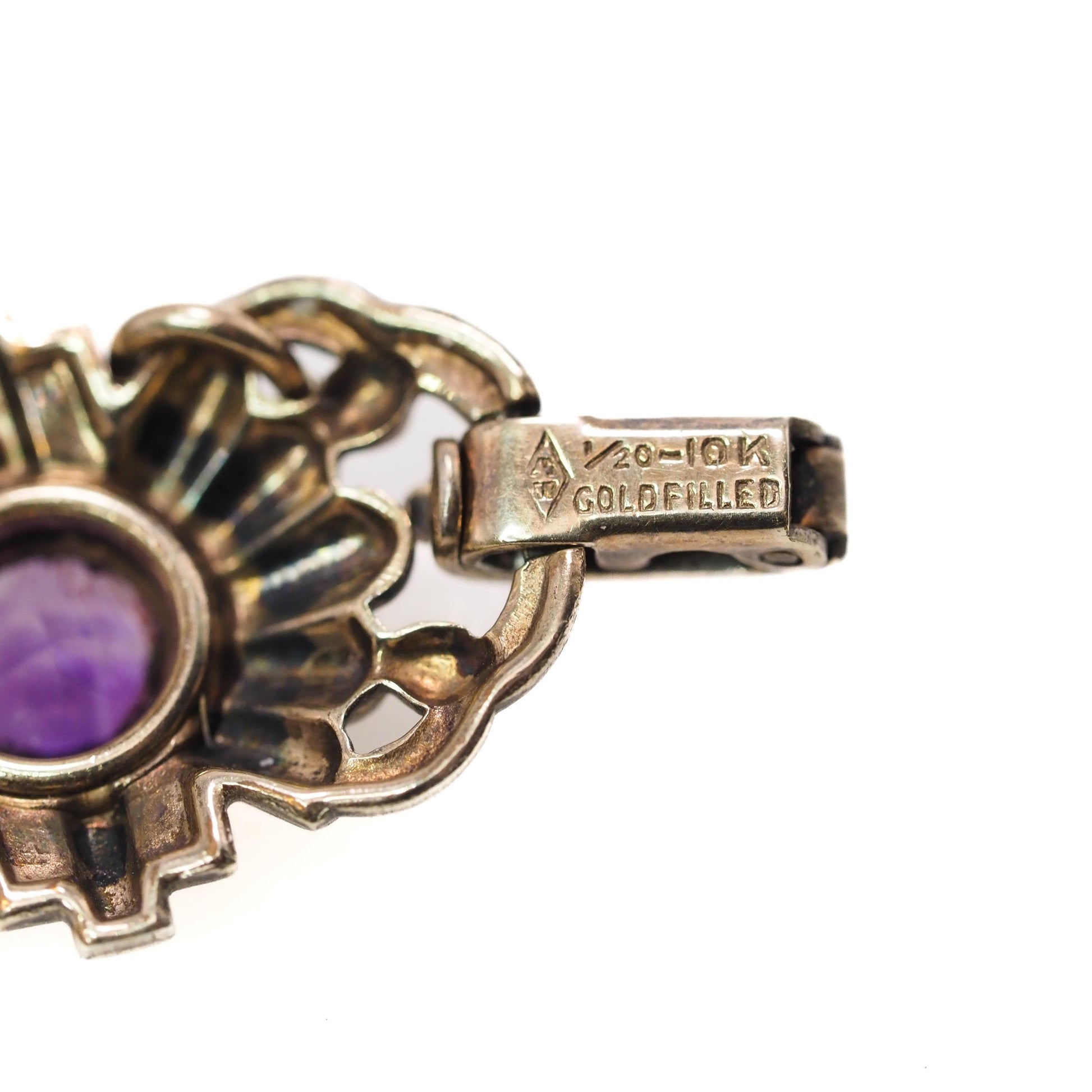 The bracelet is in good vintage condition with minimal signs of wear. The surface of the metal has fine lines and marks and light areas of wear, but nothing noticeable or obvious. The glass is not chipped or cracked and is secure in the settings. The fold-over clasp is fully functional, and the piece is stamped 1/20 10K GOLD FILLED.