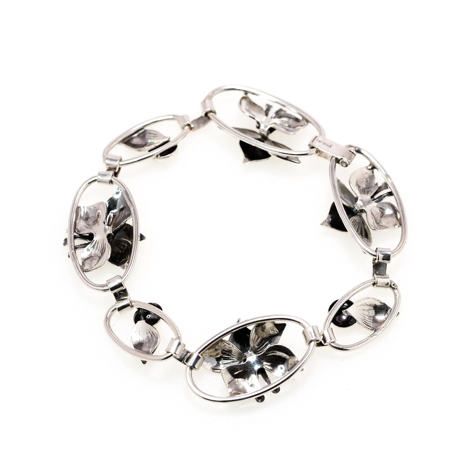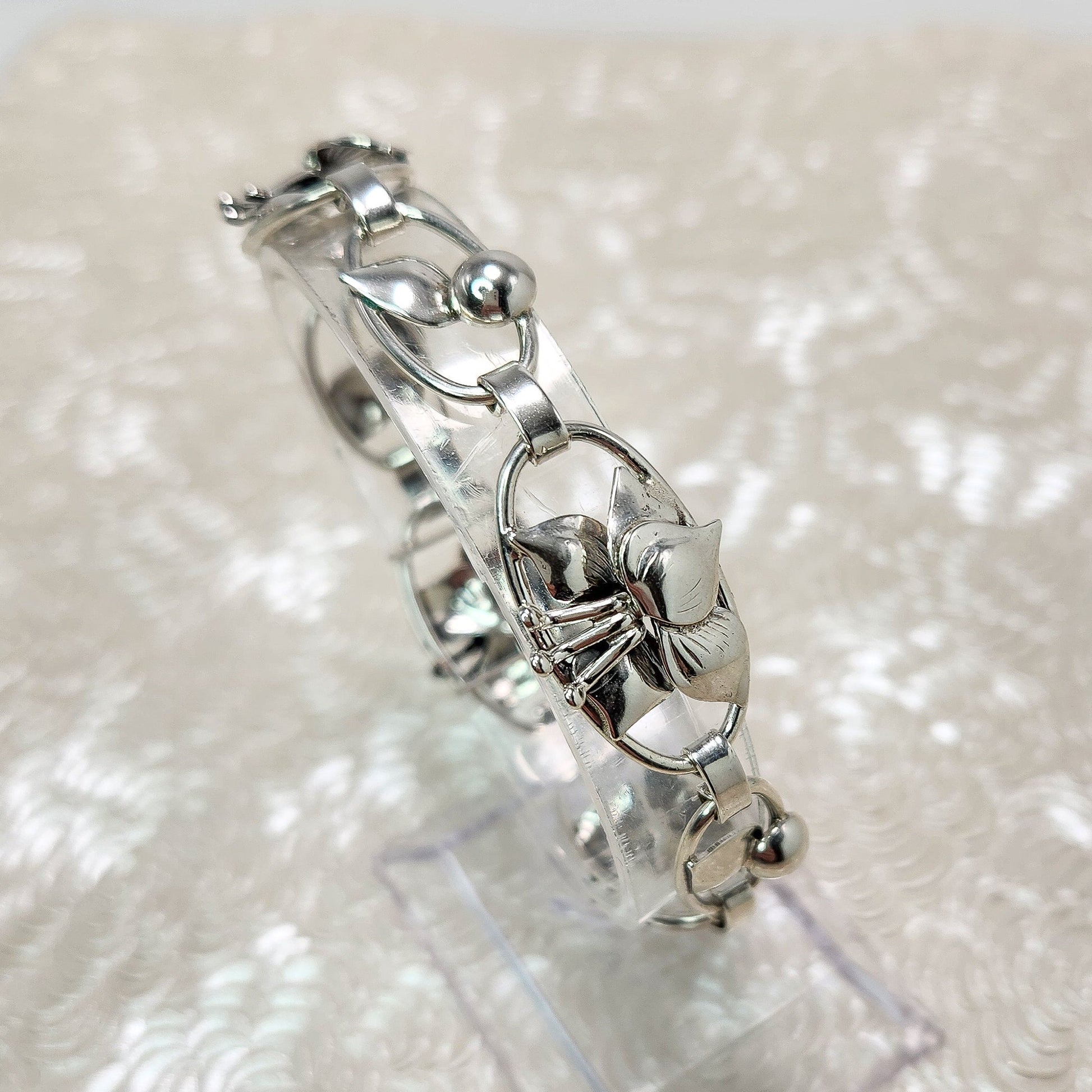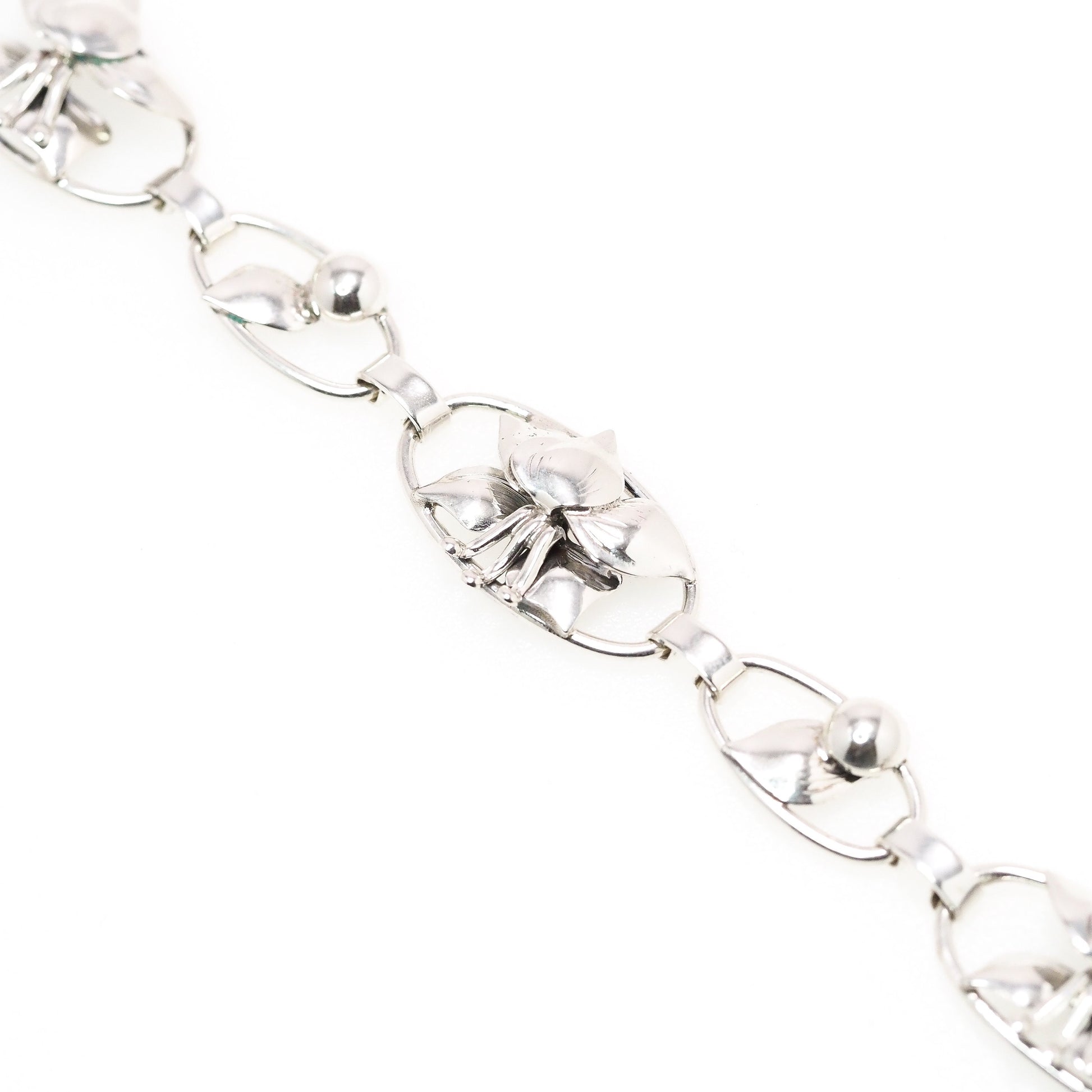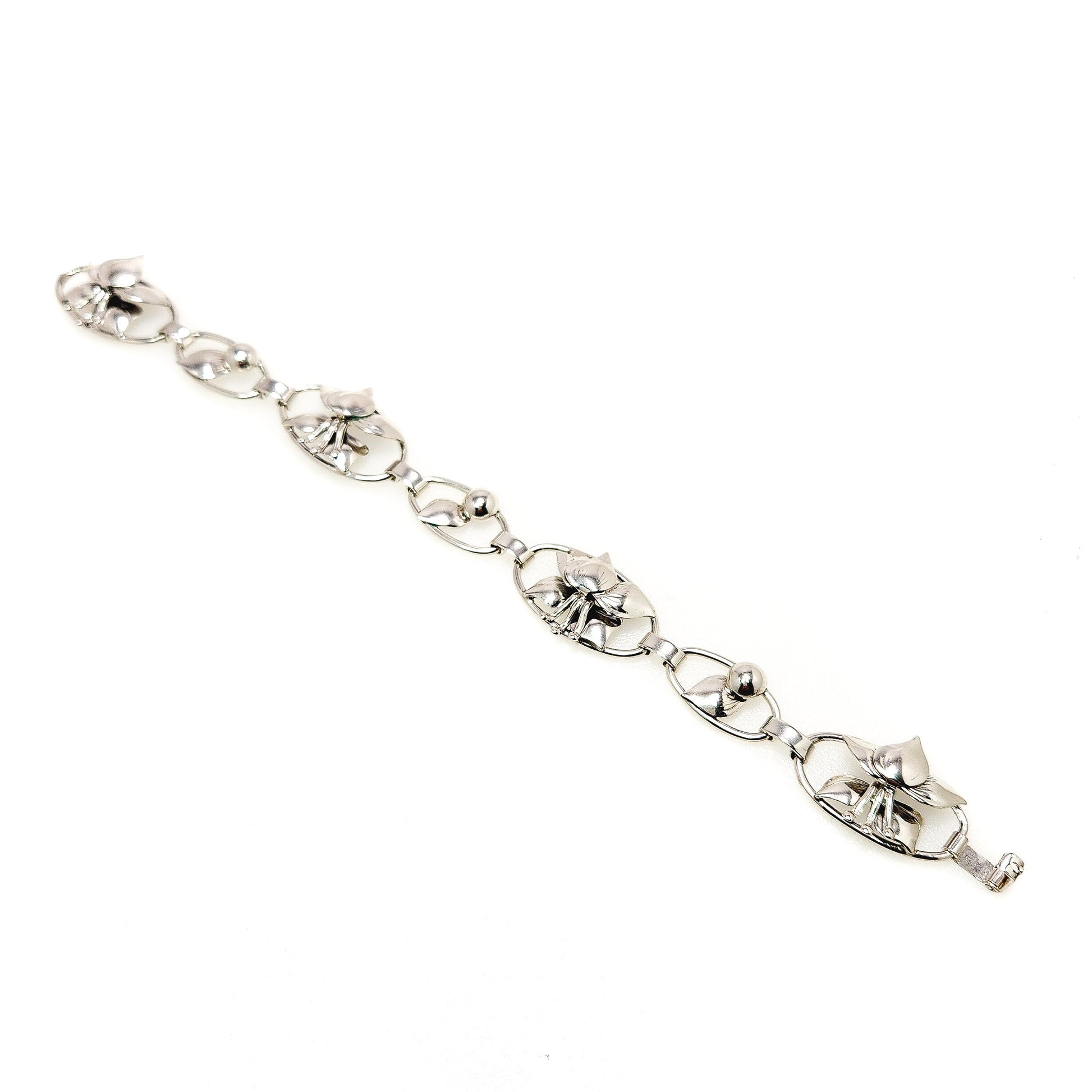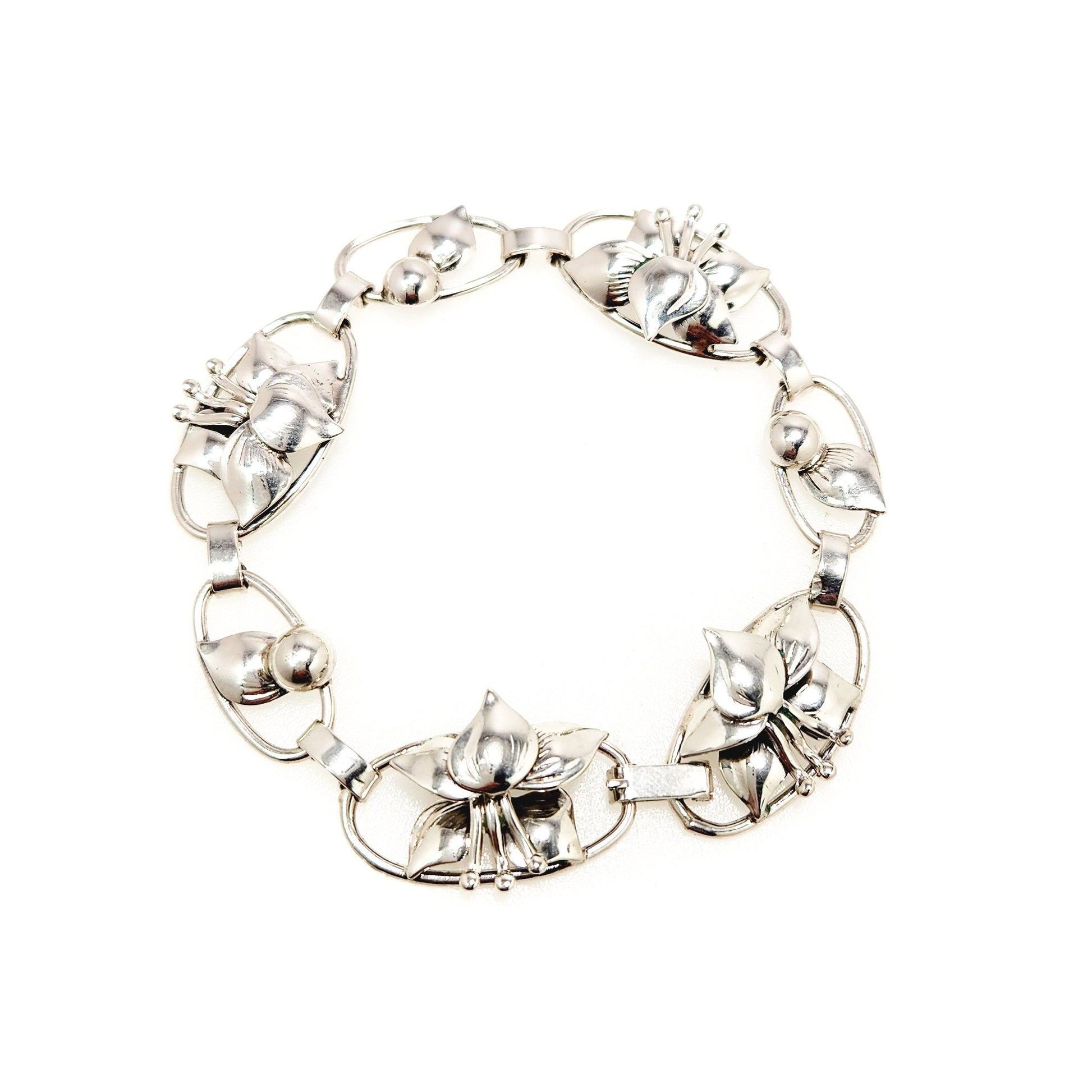 Rendered in the turbulent 1940s, this beautiful lily flower bracelet is crafted from sterling silver. The silver has a lovely sheen from years of wear, making this a perfect Retro bracelet to add to your collection.
