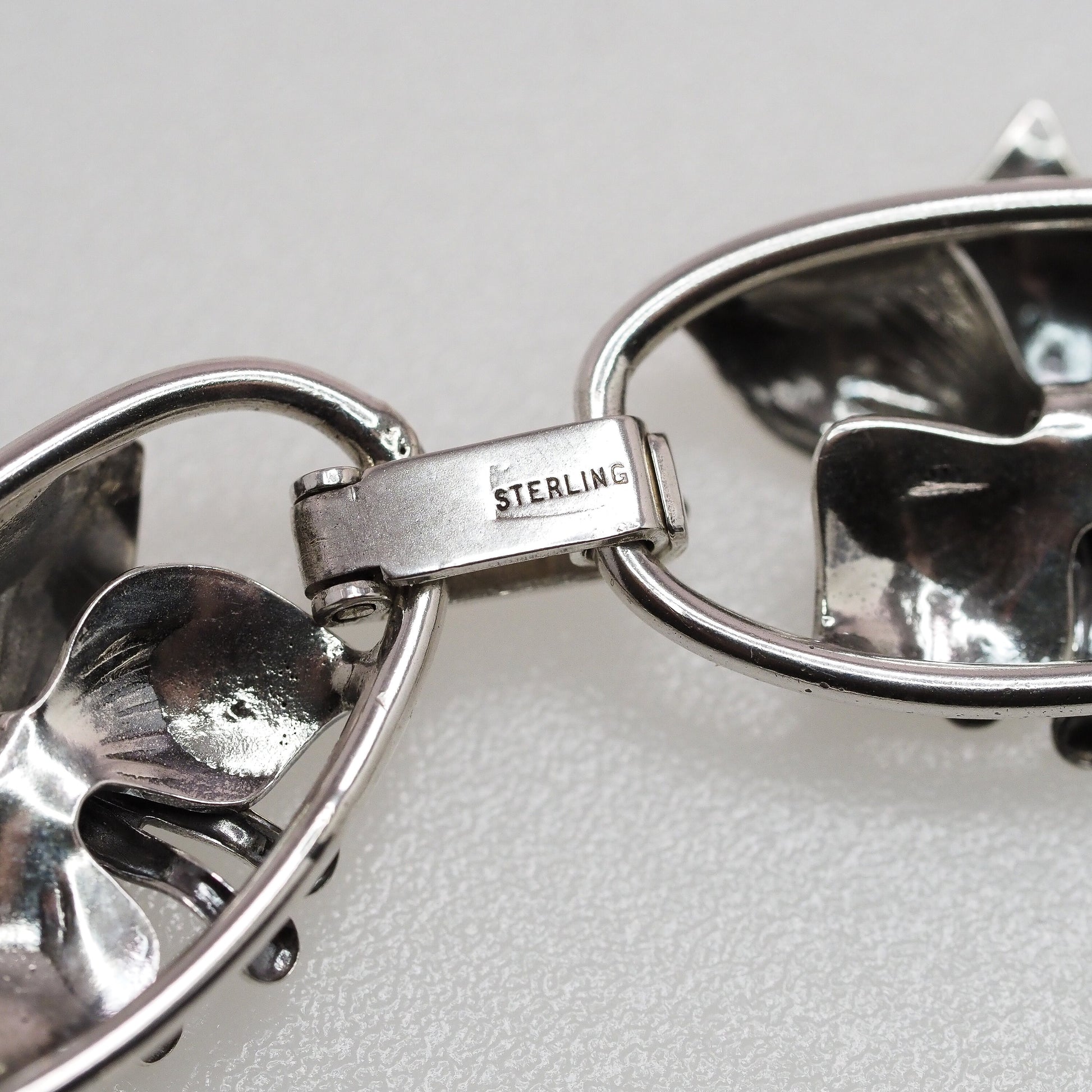 The bracelet is in very good vintage condition with minimal signs of wear. The surface of the silver has fine lines and marks, but nothing noticeable or obvious. The silver has a moderate patina layer that can be polished upon request. The clasp is stamped STERLING.