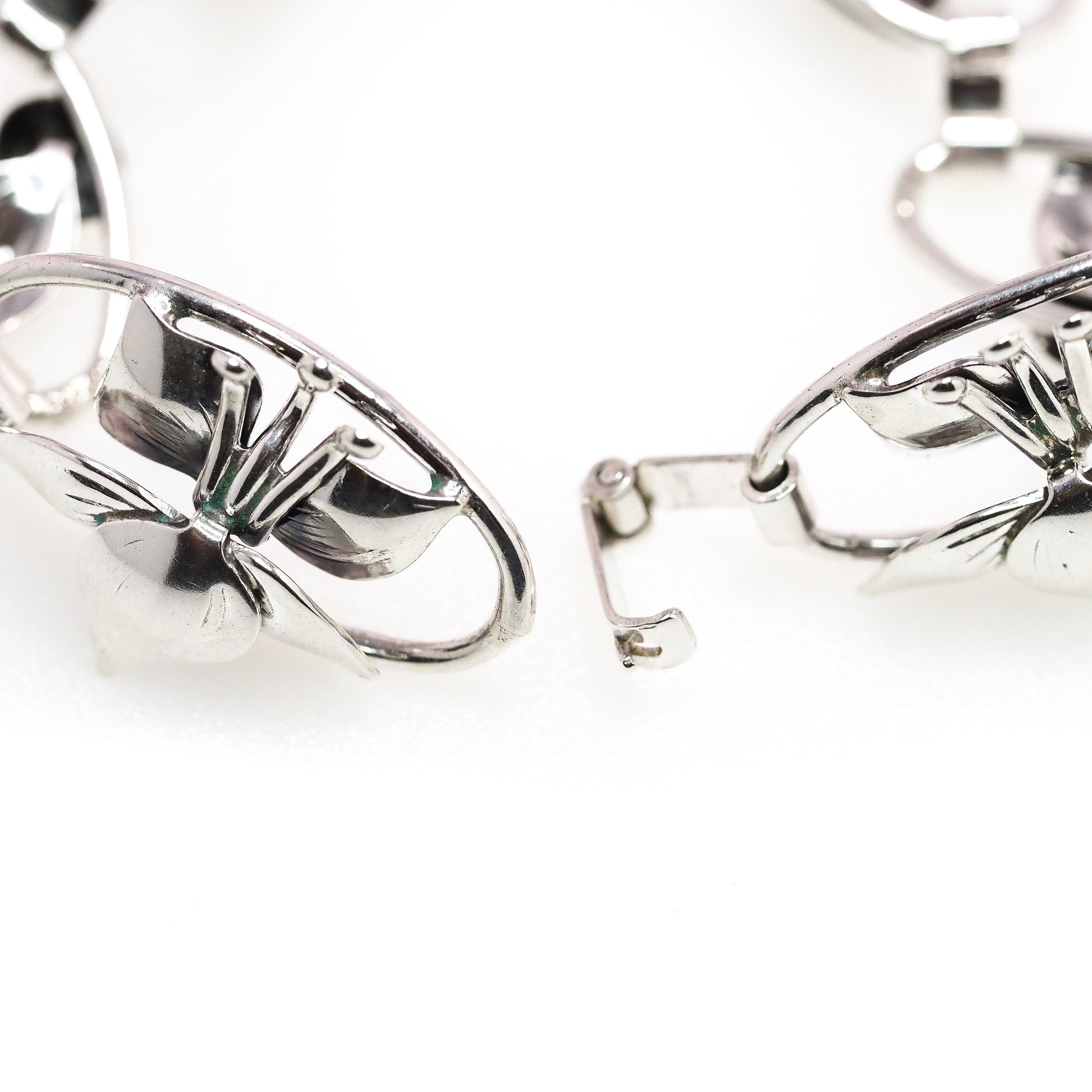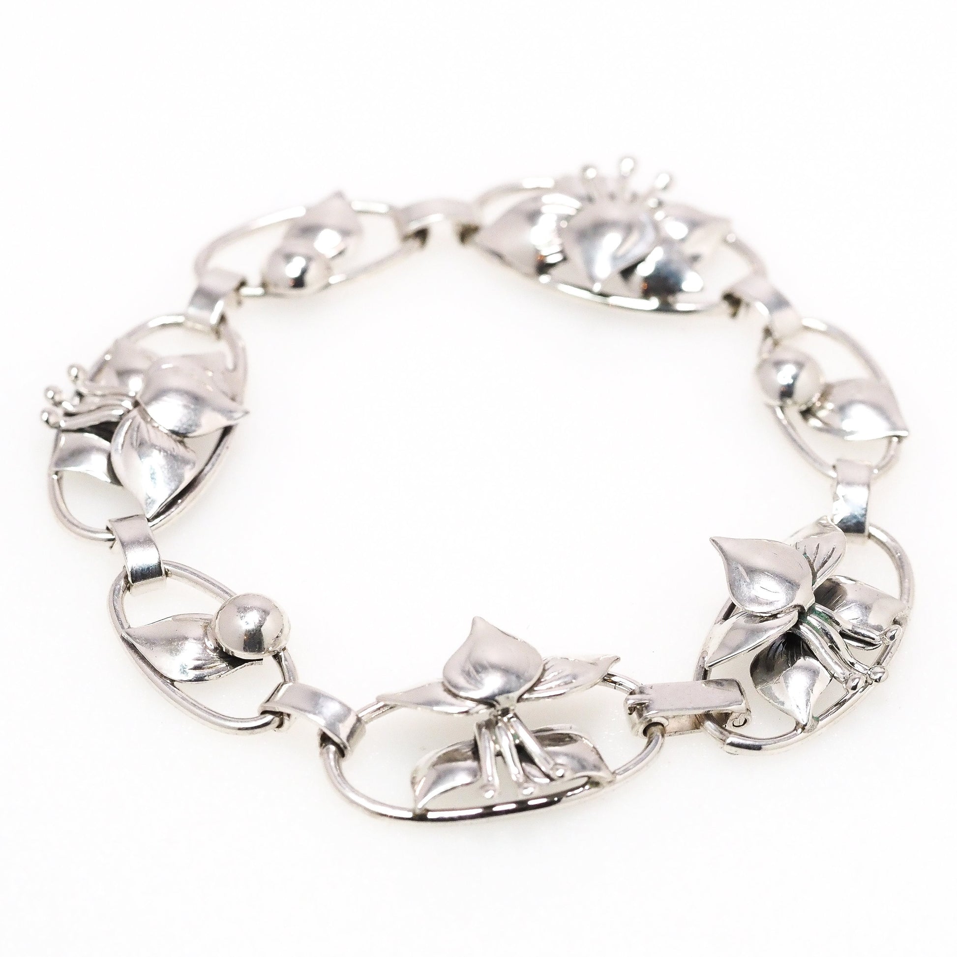 Vintage 1940s Retro Art Deco Sterling Silver Lily Flower Link 7" Bracelet