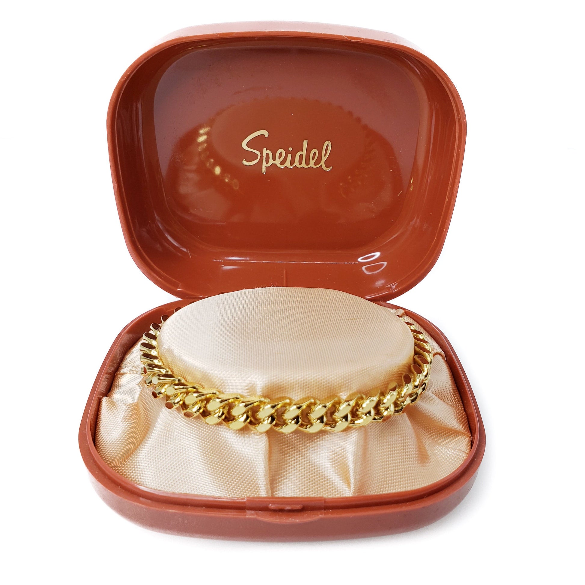 Vintage 1940s SPEIDEL Gold Plated Thin Yellow Gold Plate Cuff 6.75" Bracelet with Original Celluloid Box