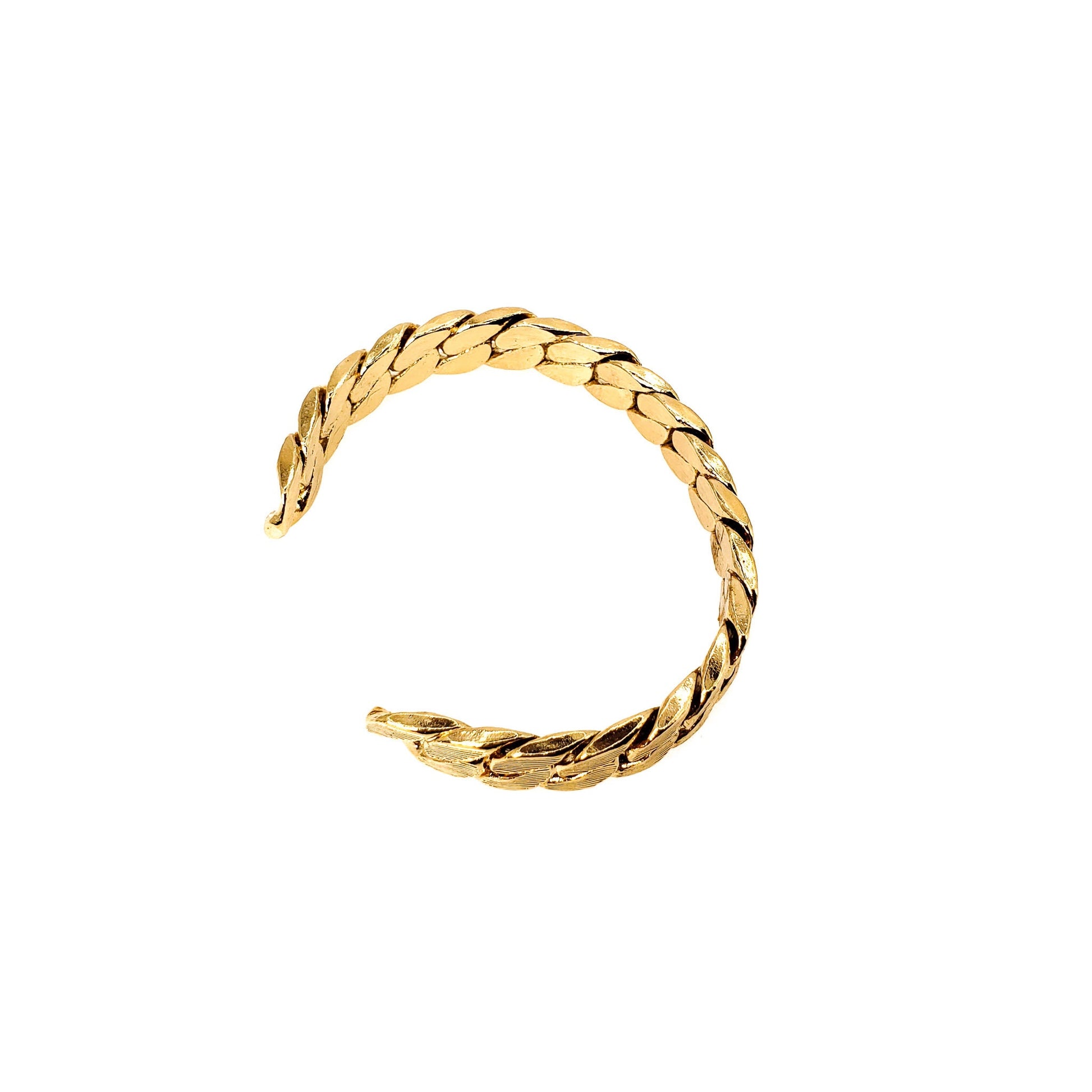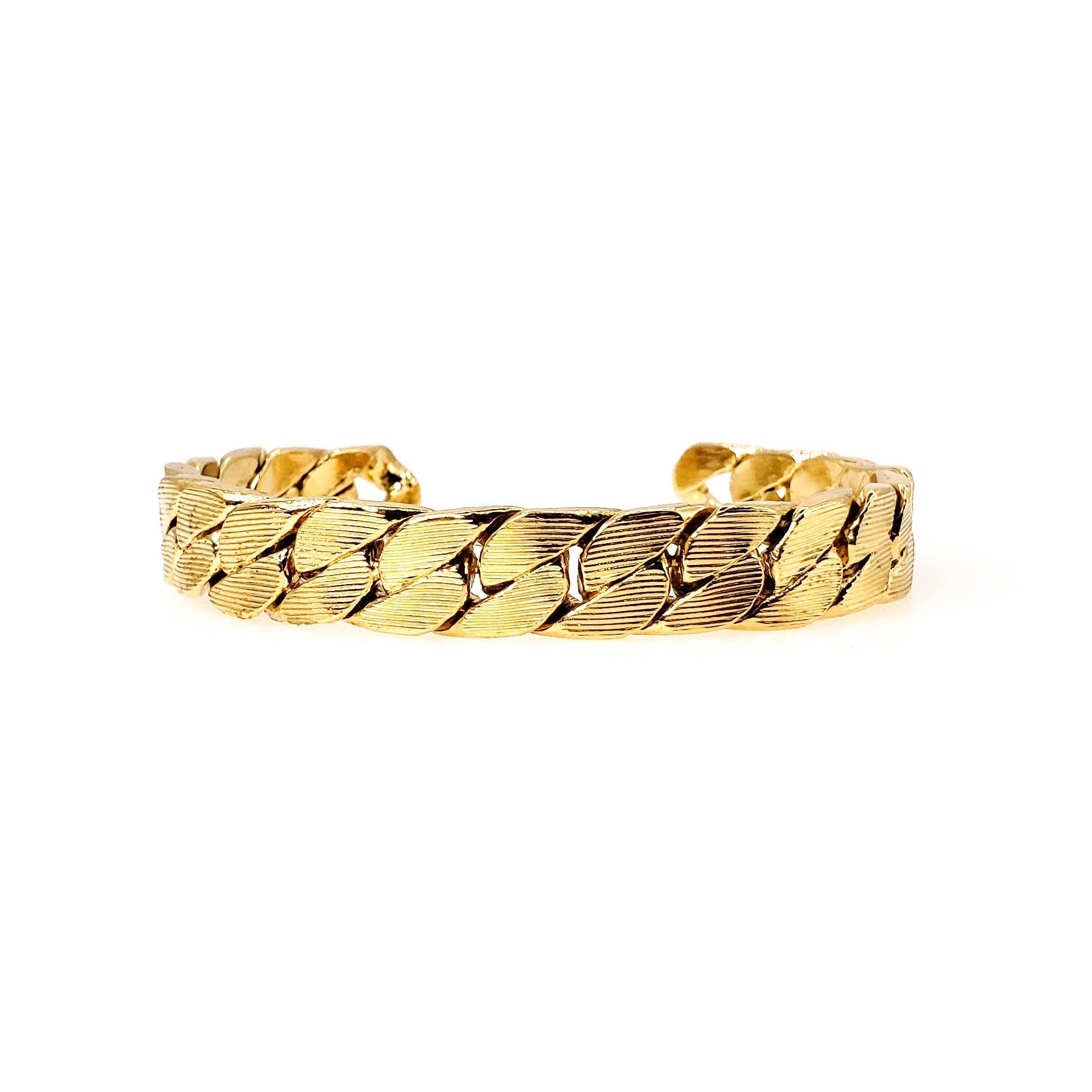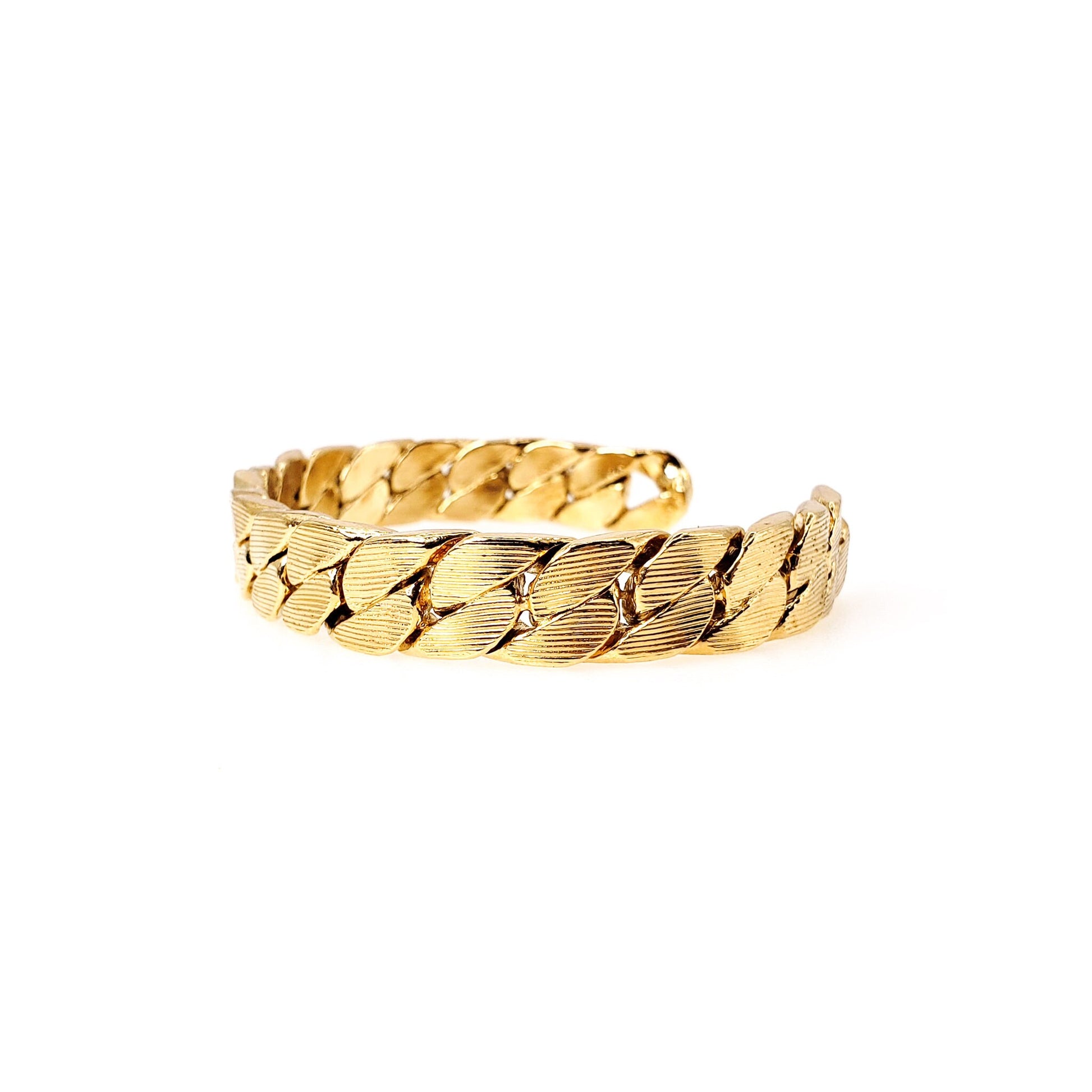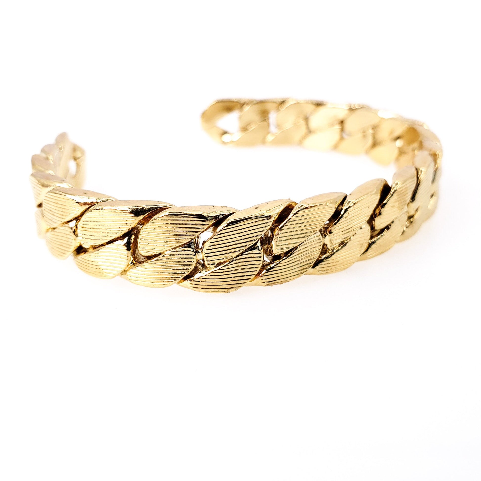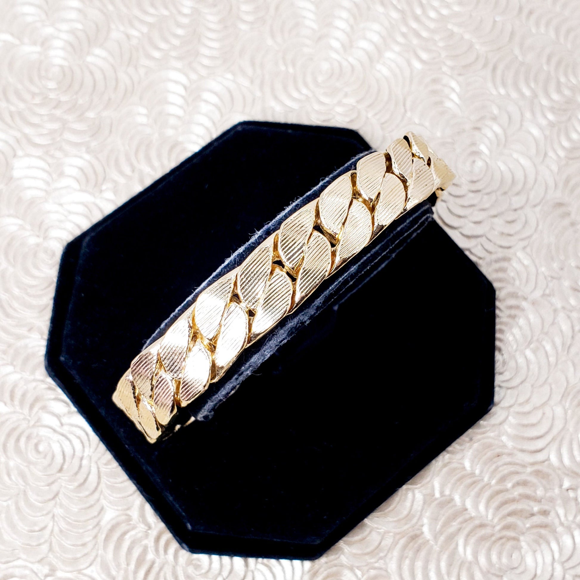 Crafted in the 1940s, this fun vintage cuff by Speidel is rendered in yellow gold plated metal. The textured metal contrasts nicely with your skin, and the cuff looks great alone or in a stack. Come with its original celluloid presentation box!