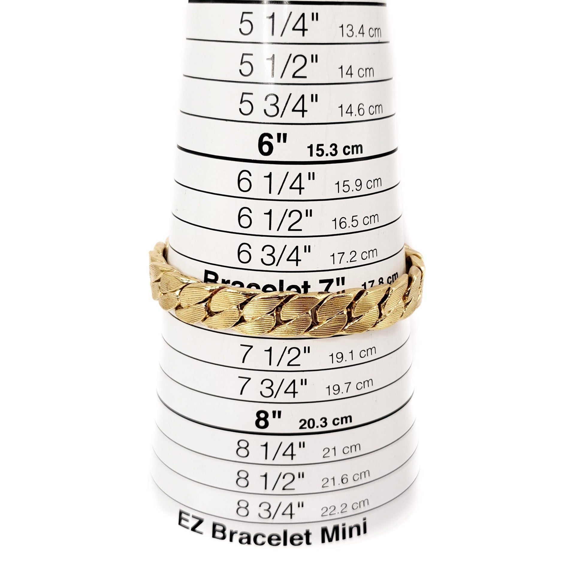 The bracelet is 7" long and 3/8" wide and weighs 35.70 grams. Comes with the box in the photos.