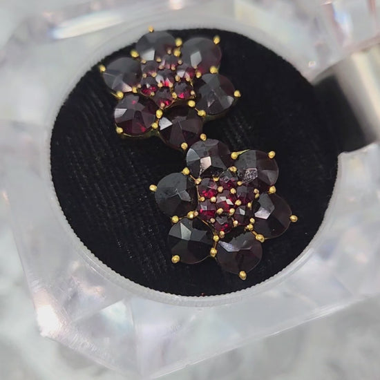 Made in the 1950s, these cluster earrings feature 26 rose-cut pyrope garnets prong-set in gold wash. These German screw-back earrings shine and sparkle in the sunlight!
