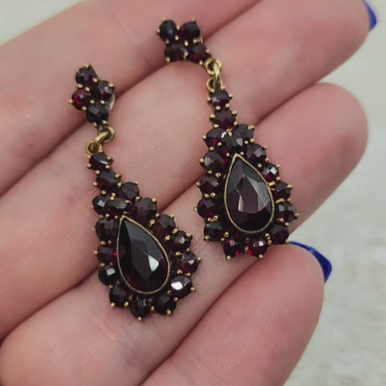 Made in the 1950s, these cluster earrings are set with 42 rose-cut pyrope garnets prong-set in gold wash. These vintage garnet earrings glow and sparkle in the sunlight!