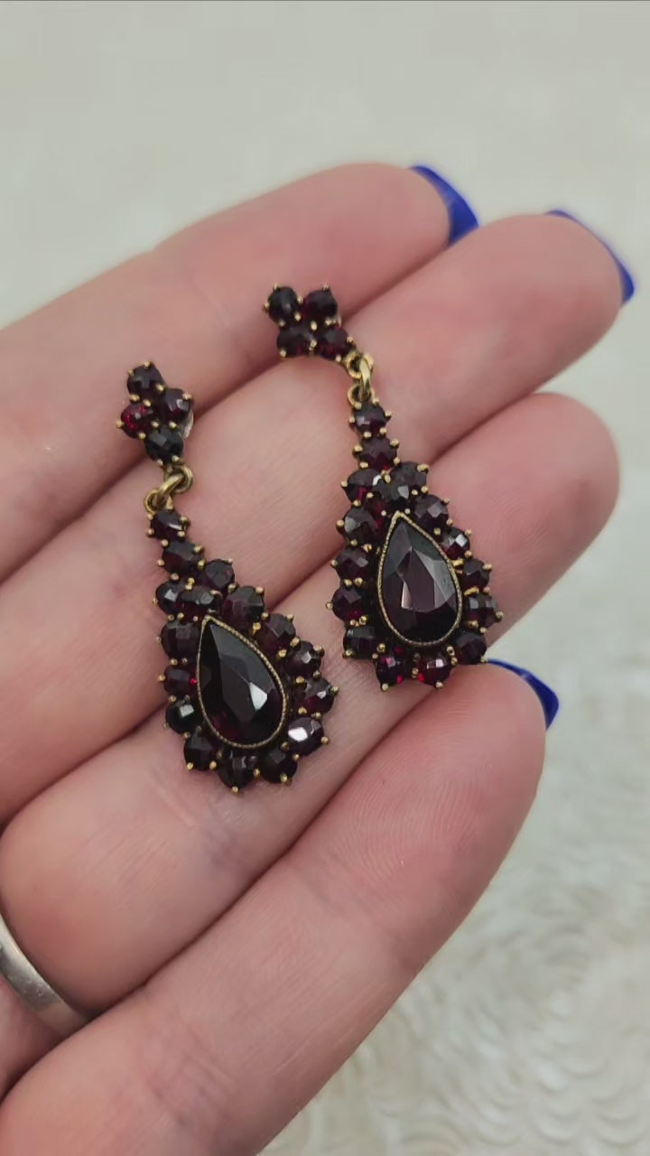 The earrings are in excellent vintage condition, with minimal signs of wear. The gold wash has a few minor signs of wear, primarily on the back. The garnets have no chips or cracks and are all securely set in place. There are a few tiny chips on the facet junctions under magnification, but they are not visible to the naked eye. There are no stamps or marks.