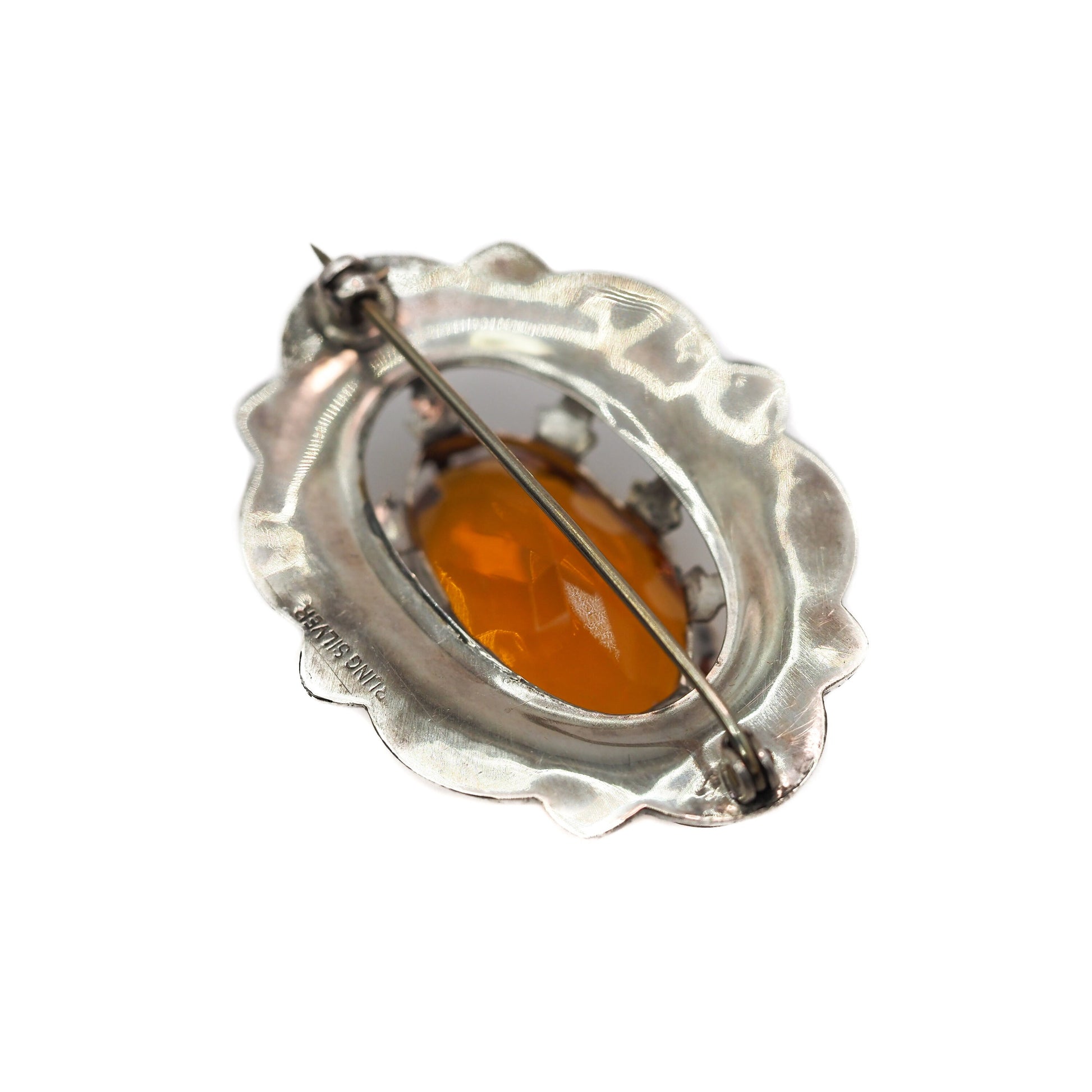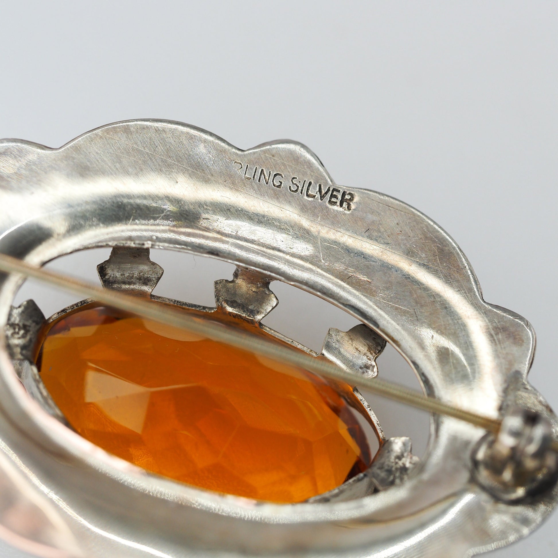 The brooch is in very good vintage condition with typical signs of wear. The citrine-colored glass has a few nicks on the facet junctions under magnification but is in excellent condition overall. The back of the brooch is stamped STERLING SILVER and has a moderate layer of patina that can be polished upon request.