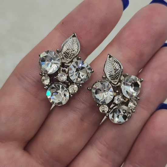 Vintage 1960s Clear Rhinestone and Silver Tone Leaf Cluster Clip-On Earrings