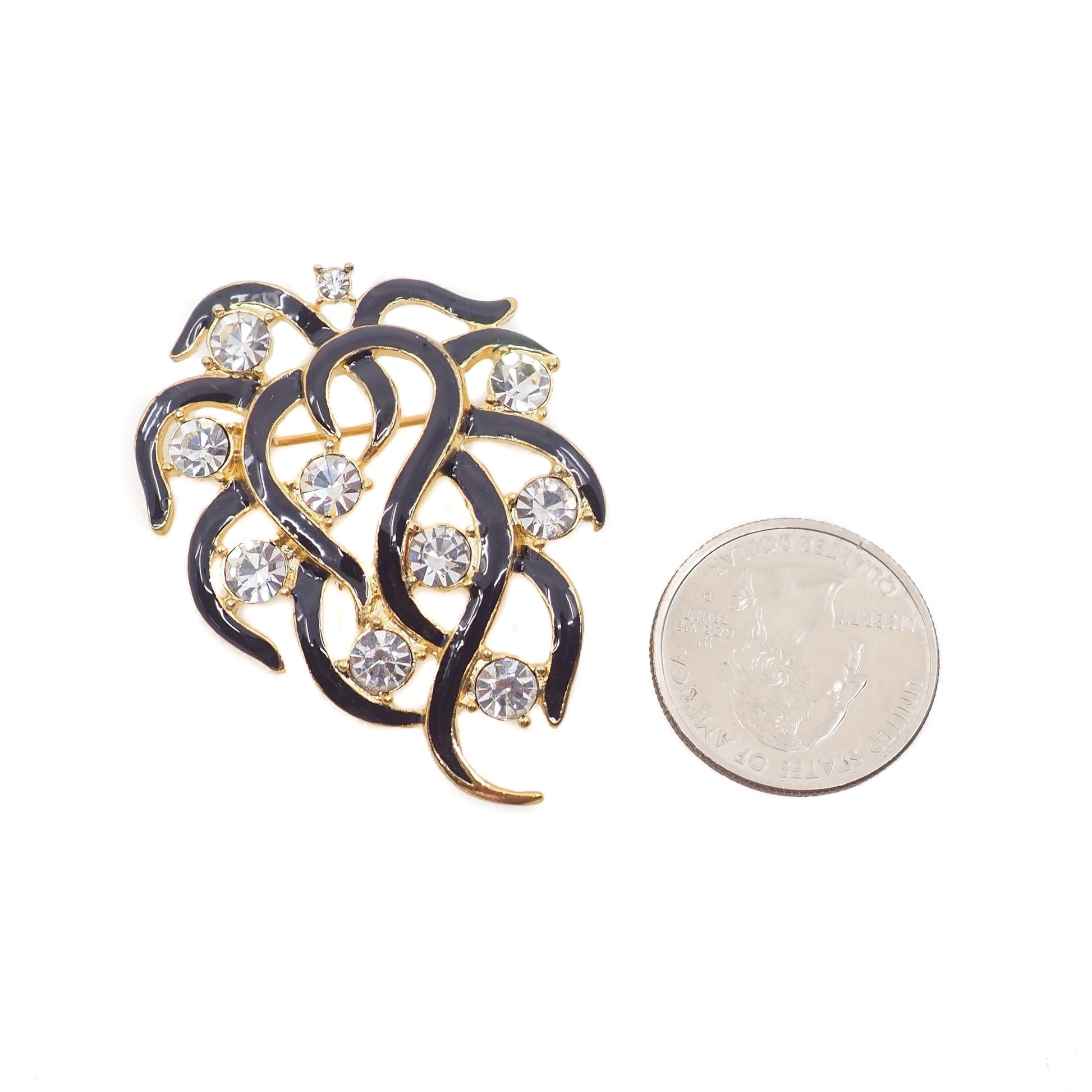 Vintage 1960s Clear Rhinestone Gold Plate Spray Costume Black Enamel Brooch