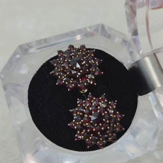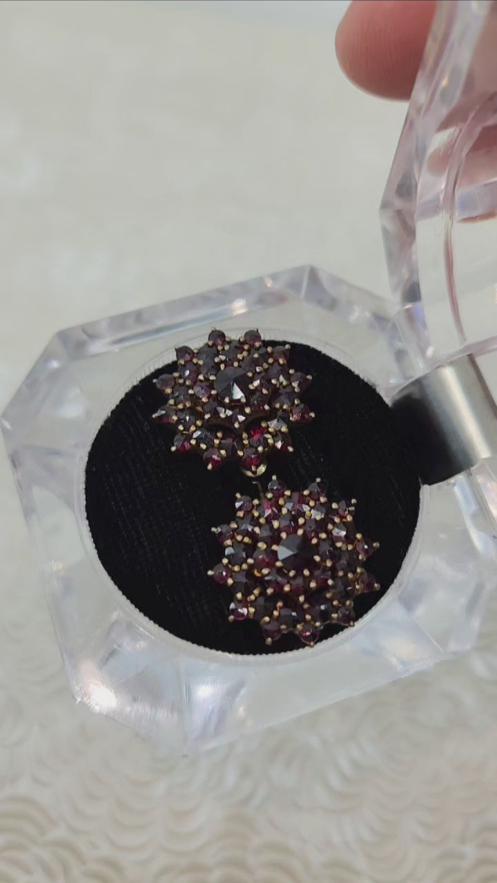 These stunning earrings, crafted in the 1960s from 900 silver with a yellow gold wash, feature 68 rose-cut pyrope garnets from Czechoslovakia's hills. The open-back setting allows sunlight to pass through the stones, making them sparkle and glow. The cluster motif, popular during the Georgian and Victorian eras, adds charm and style to these earrings. They are perfect for any occasion or a January birthday!
