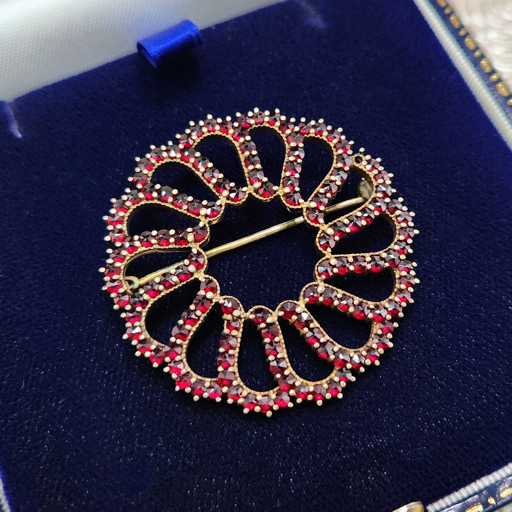 This stunning Bohemian garnet and gold-washed brooch, straight from the 1960s, exudes elegance. The vintage piece features red Czech garnets that shimmer and sparkle in sunlight.