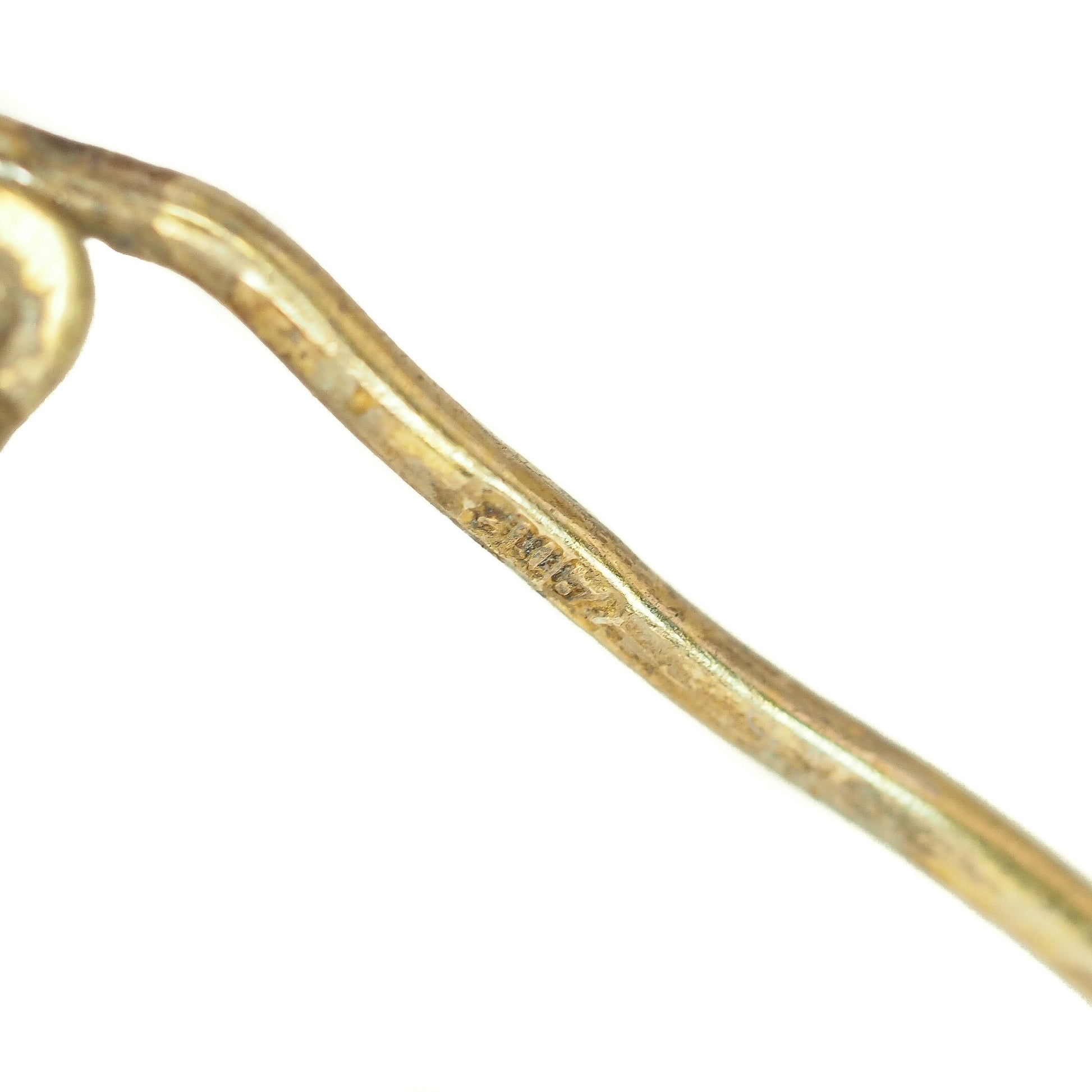 The pin is in good vintage condition with minimal signs of wear. The surface of the gold-washed silver has a few fine lines and marks. One garnet is missing; the rest are securely set into the mounting and only have a few tiny nicks under magnification. The pin is stamped with the maker's mark G2 (Granat Turnov) and 900 (90% silver).