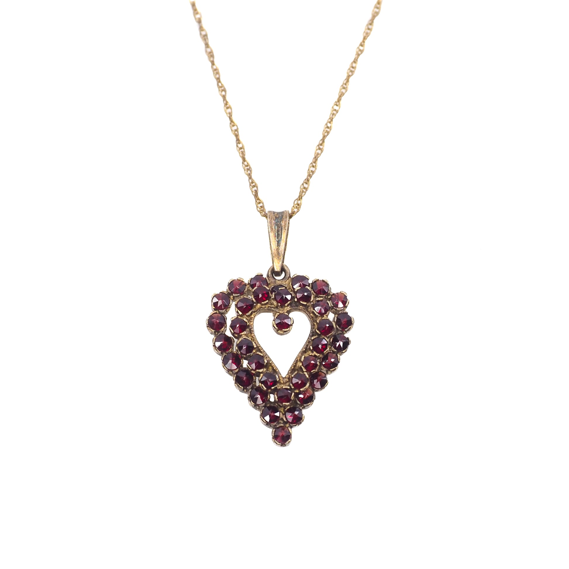 This sparkling heart pendant from the 1960s is set with 35 rose-cut Bohemian garnets in gold-washed metal. The small garnets are prong-set in sterling silver with a gold wash. The garnets glow and glisten in the sunlight, a perfect gift for many occasions, styles, and ages!