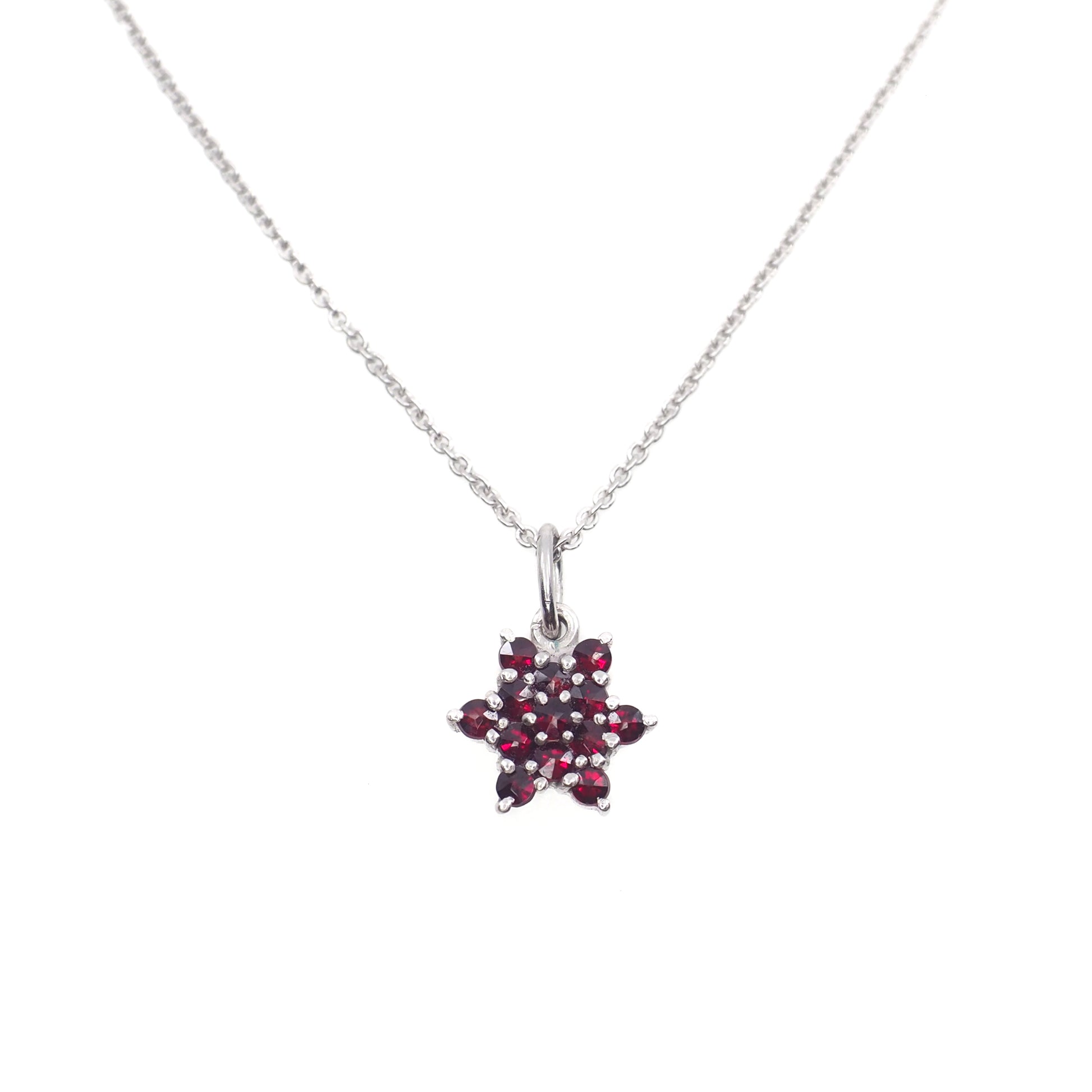 This stunning vintage Bohemian garnet necklace features 13 rose-cut pyrope garnets set in sterling silver. The cluster of garnets captures sunlight and radiates from within, beautifully contrasting with the sparkling metal. Made in the 1960s, this exquisite garnet necklace is perfect for January birthdays or garnet enthusiasts!