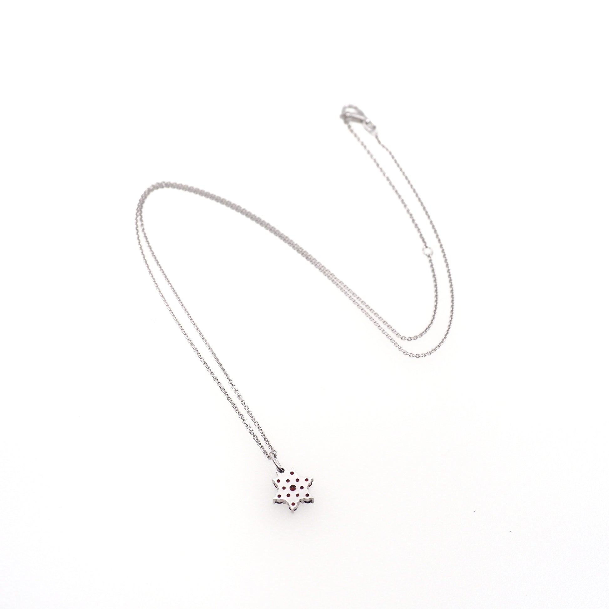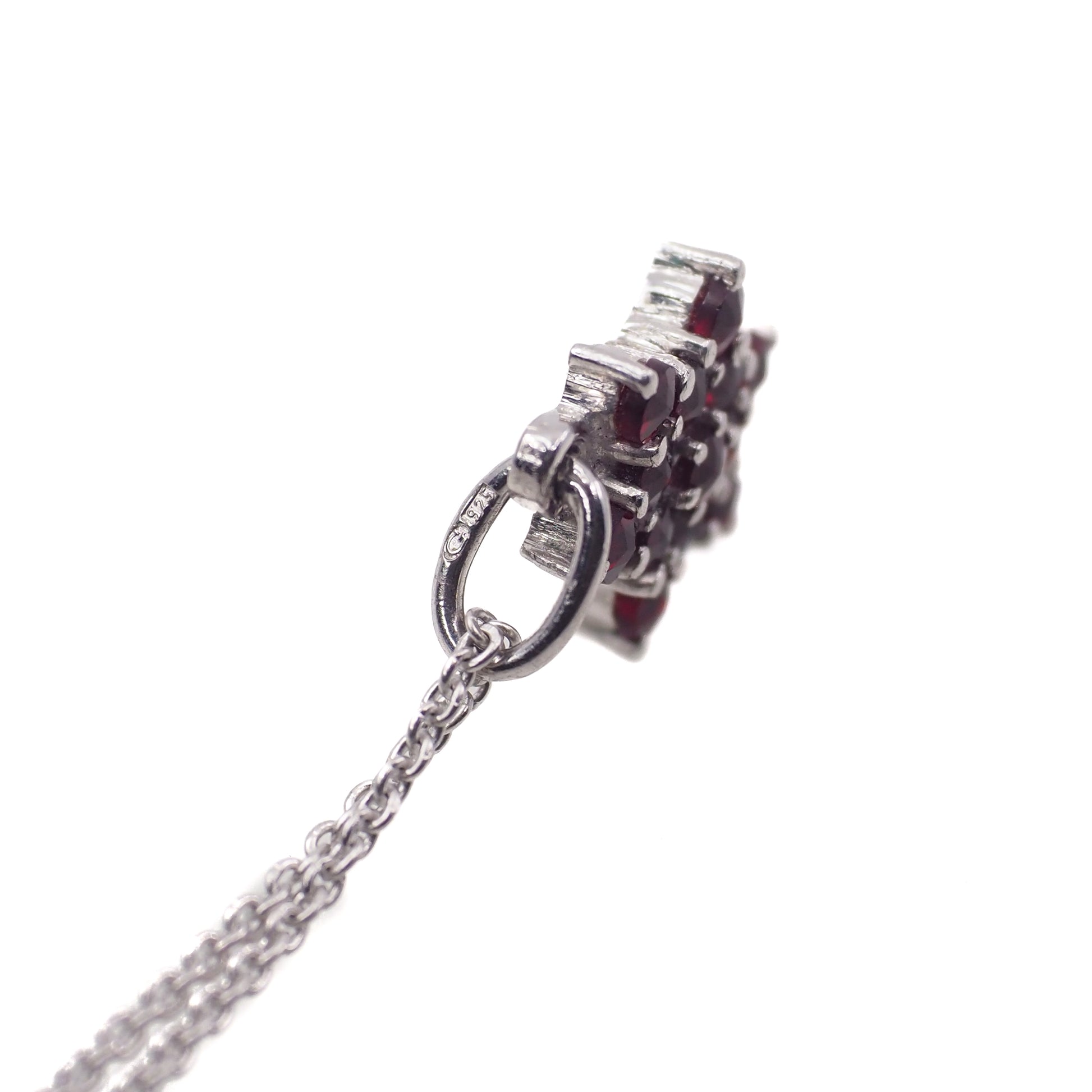 The necklace is in very good condition with minor signs of wear. The garnets are in excellent shape, with no significant chips or cracks, and are securely set. Under magnification, the garnets display tiny nicks at their facet junctions. The pendant is stamped with 925 (sterling silver), G (Granat Turnov hallmark).