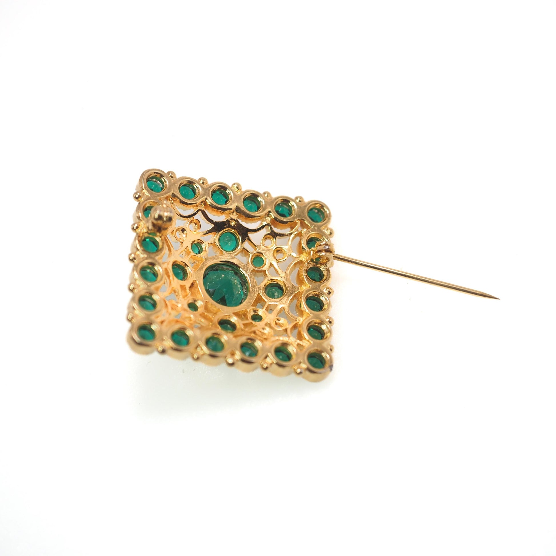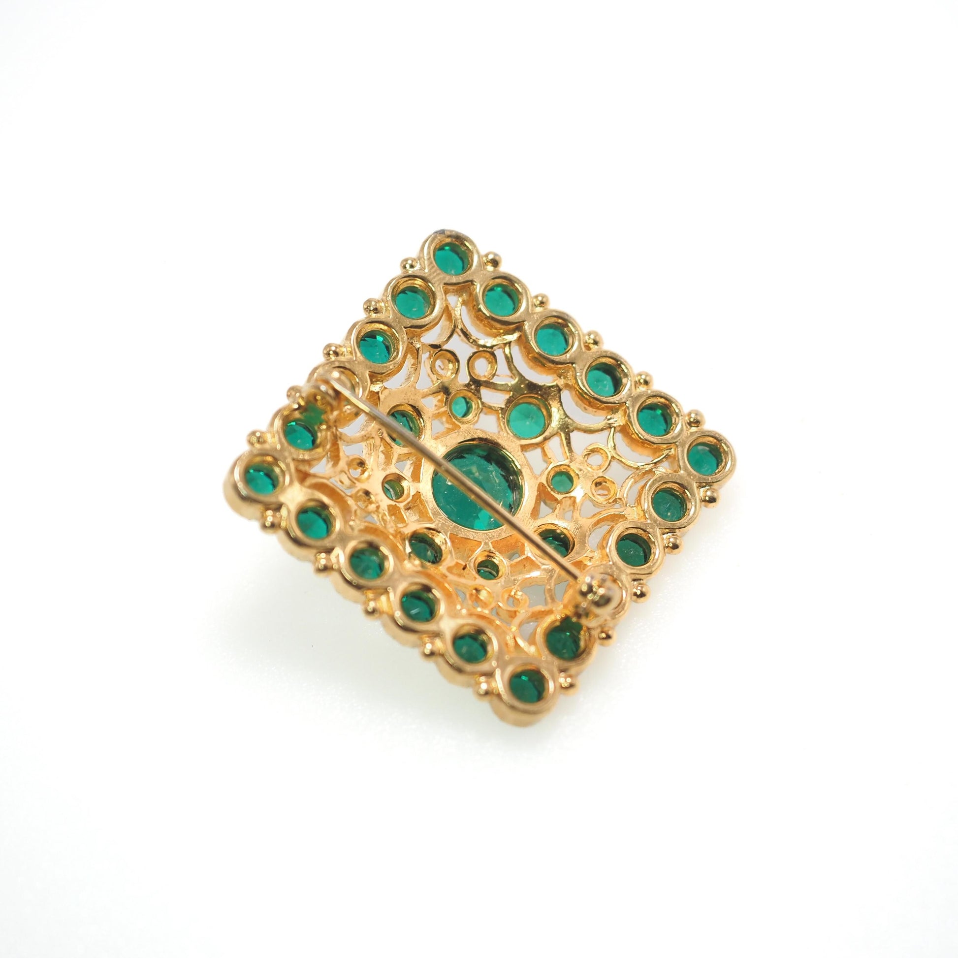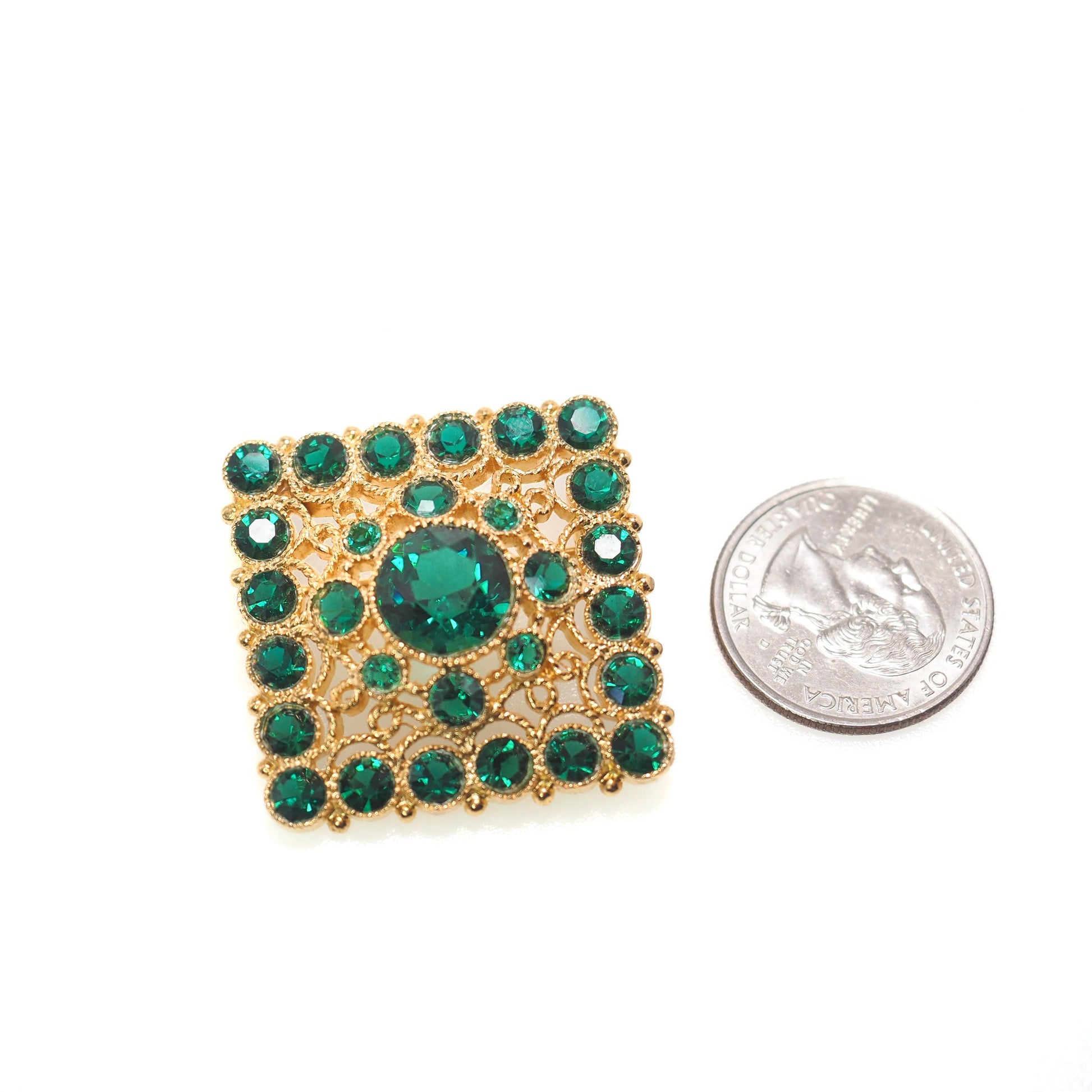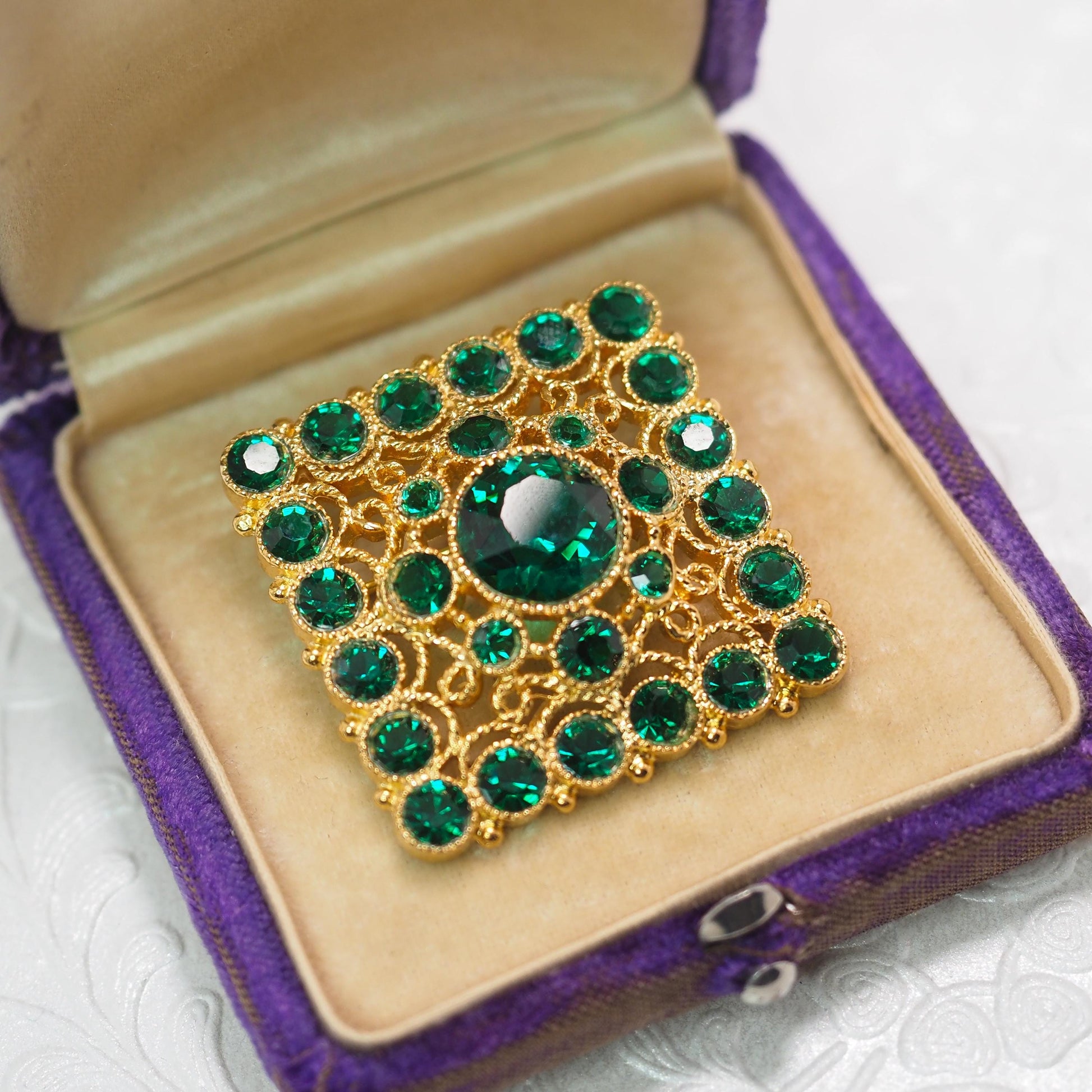 Crafted during the 1960s, this fun Renaissance revival brooch features glowing green round-cut rhinestones in gold-toned metal. The intricate metalwork is accented with green rhinestones that add to the sparkle and vintage appeal. It‘s a fabulous costume brooch for any occasion!