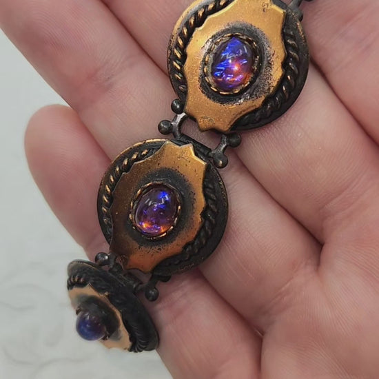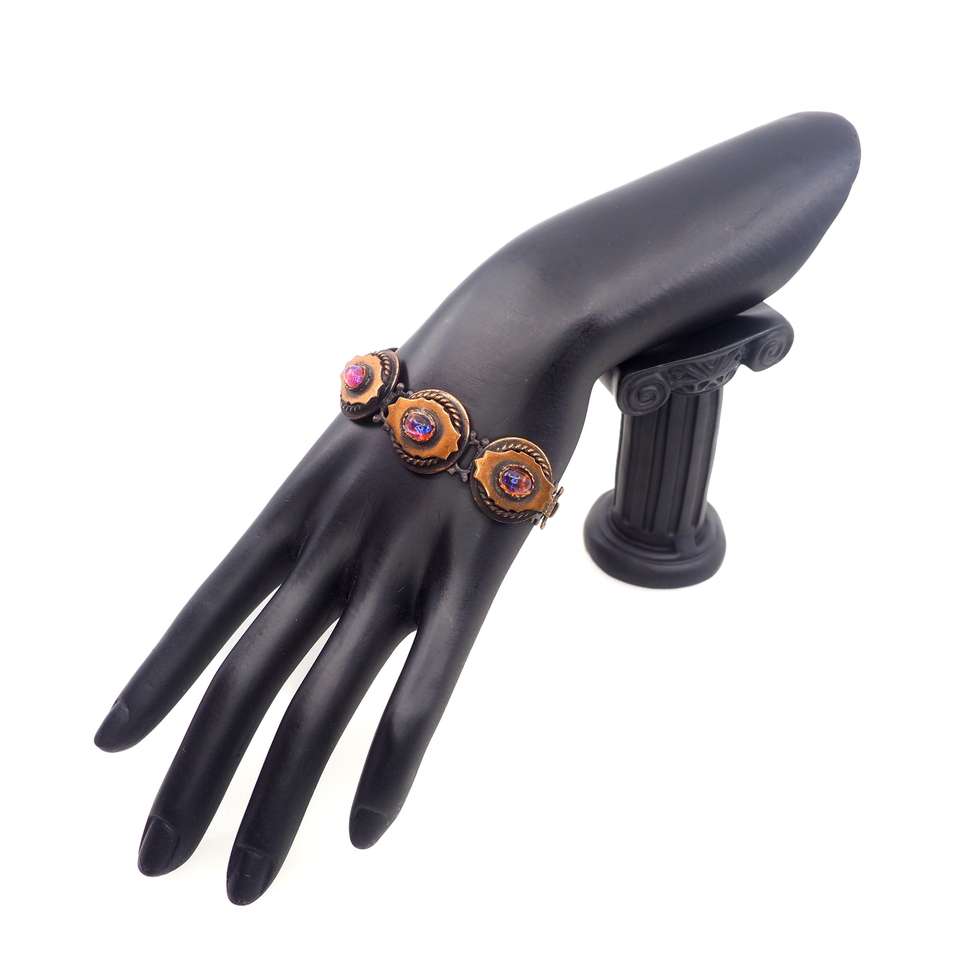 This fabulous dragon's breath link bracelet from the 1960s showcases a swirled scroll design with a burnished shadow effect on shimmering copper. It's a perfect vintage piece for anyone who appreciates modernist, mid-century modern, or copper jewelry!