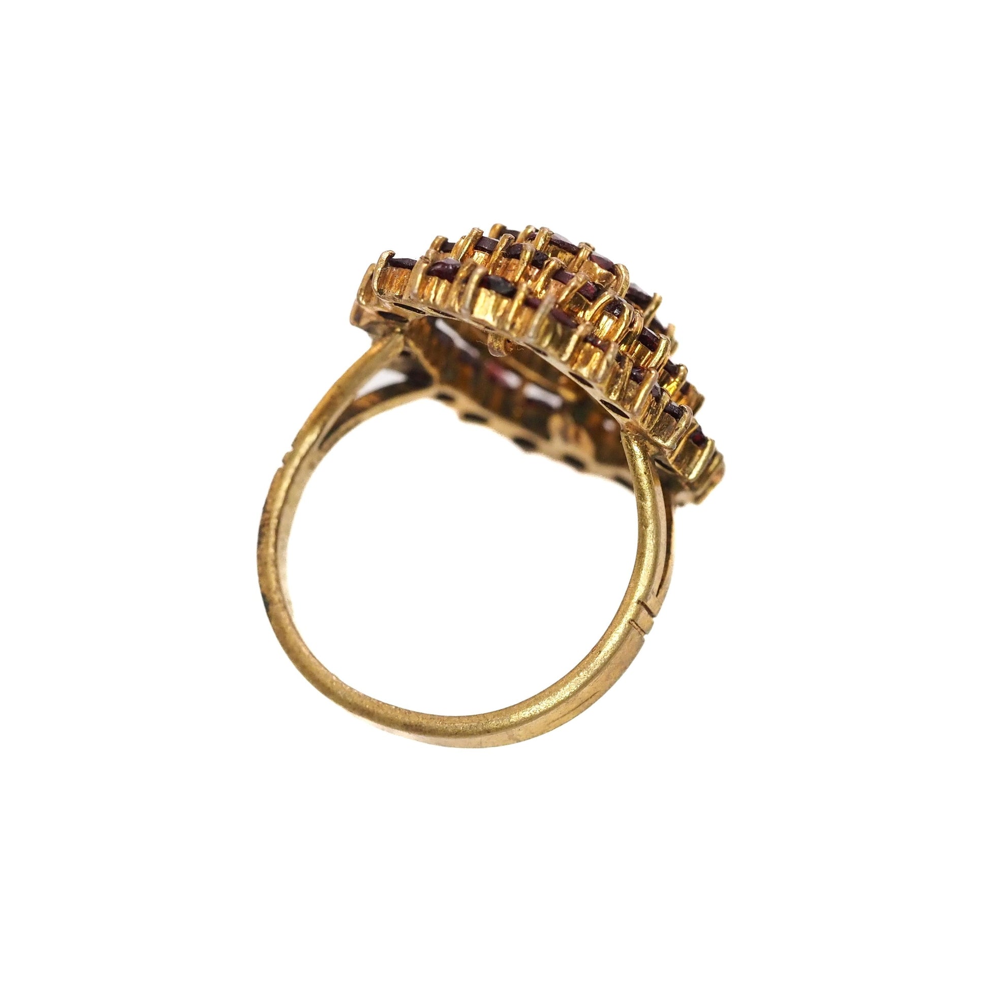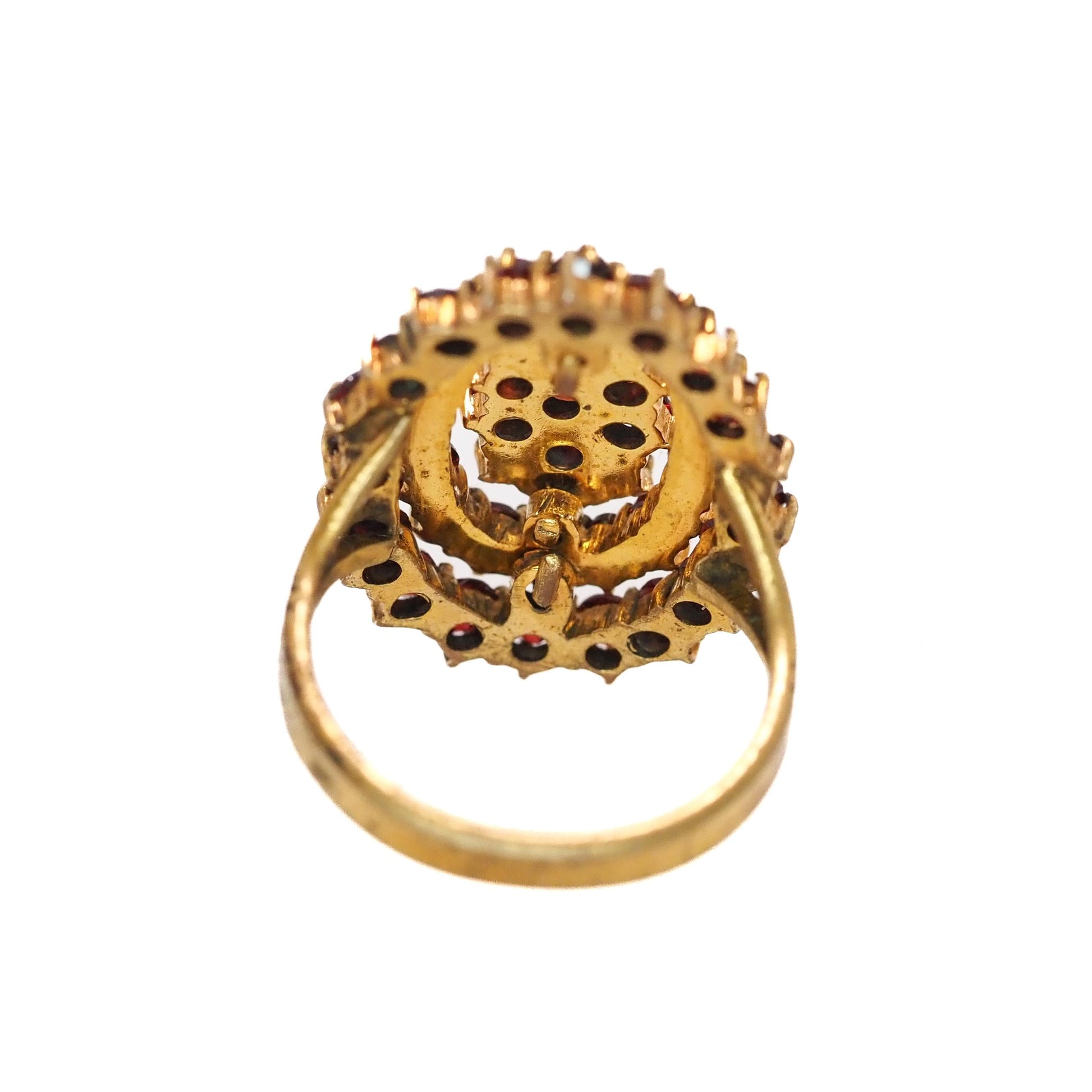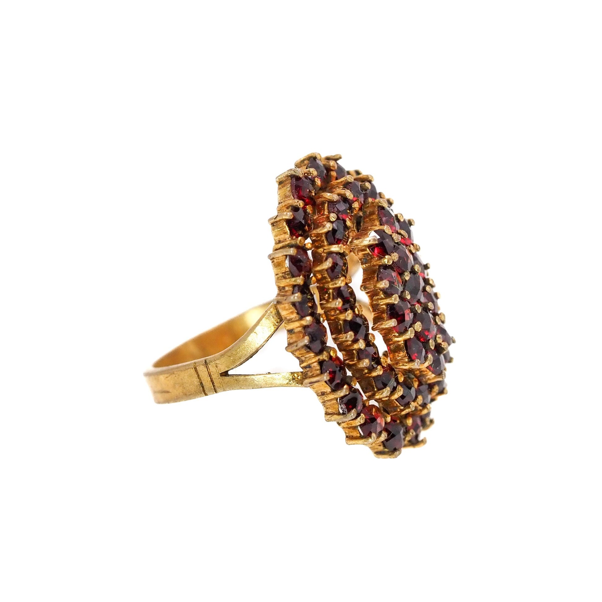 The ring is in good vintage condition with some noticeable signs of wear. The garnets are in good condition; none are cracked or chipped, but some have tiny nicks and abrasions on the facet junctions under magnification. The garnets do not wiggle and are secure in the mounting. The surface of the gold wash shows fine lines and marks, mainly on the inside of the band. Dark patina spots on the band from years of wear were left behind after polishing.