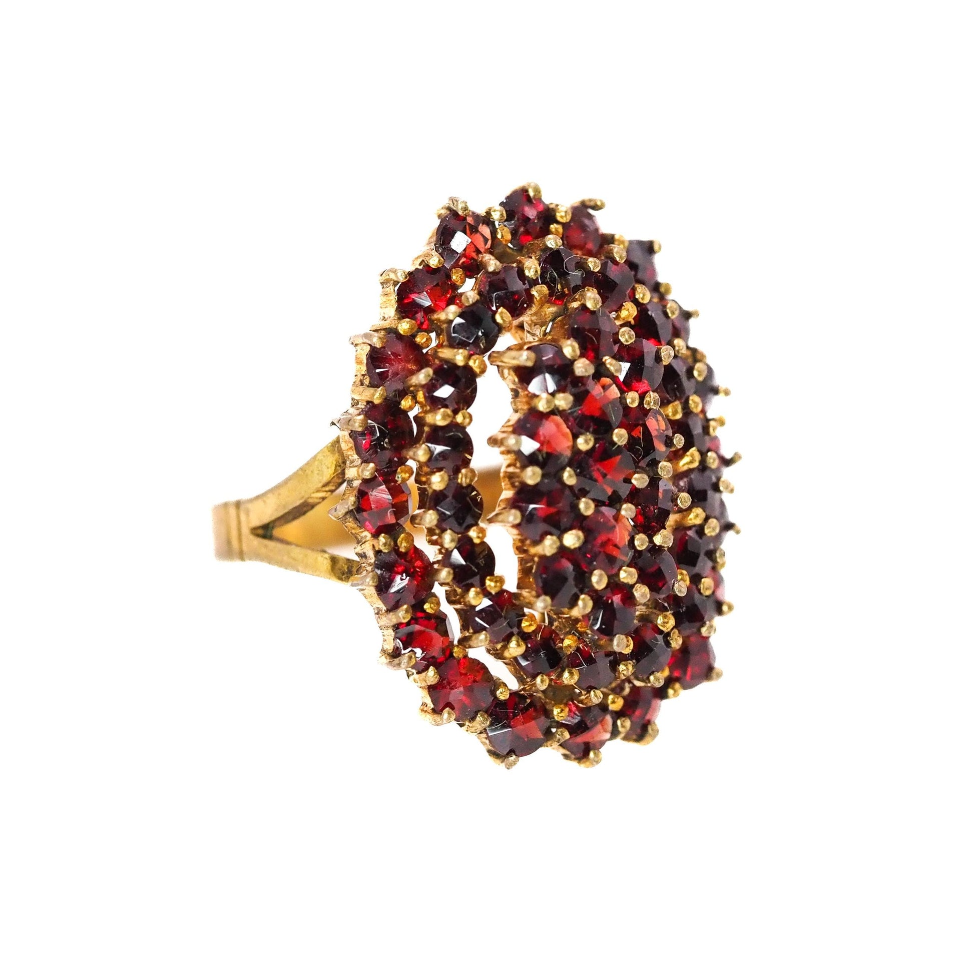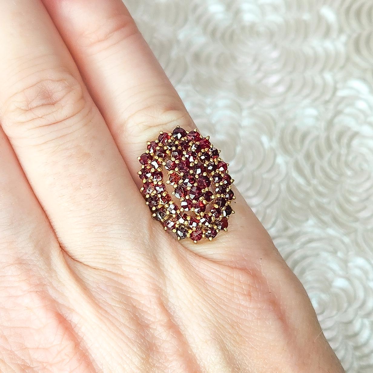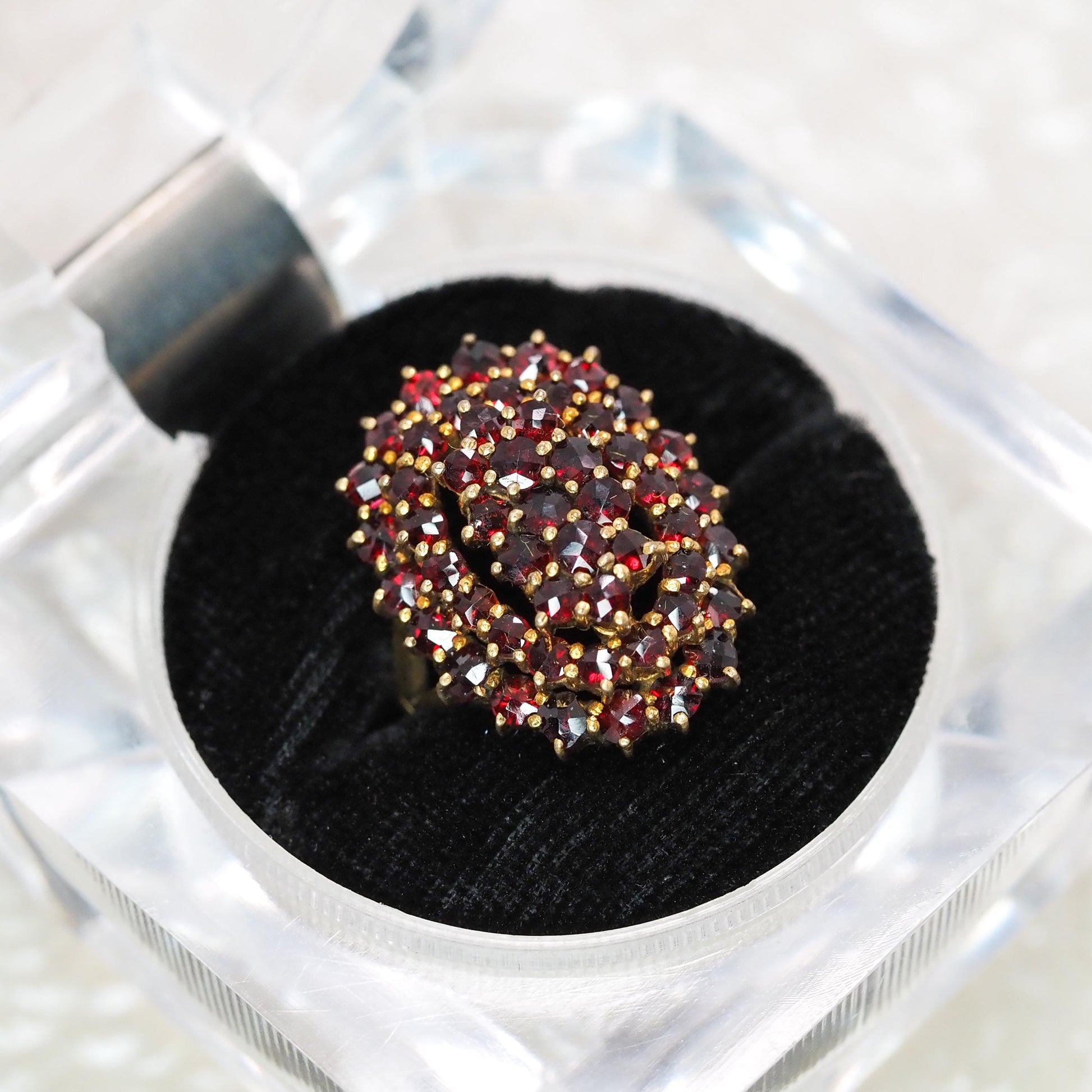Adorned with 51 exquisite rose-cut garnets, this stunning vintage cluster ring effortlessly radiates brilliance when worn on your finger. The three thoughtfully arranged rows of pyrope garnets capture and reflect light from all directions, captivating your gaze. Crafted in Europe during the 1960s from gold-washed 900 silver, this ring showcases garnets renowned for their captivating inner glow.