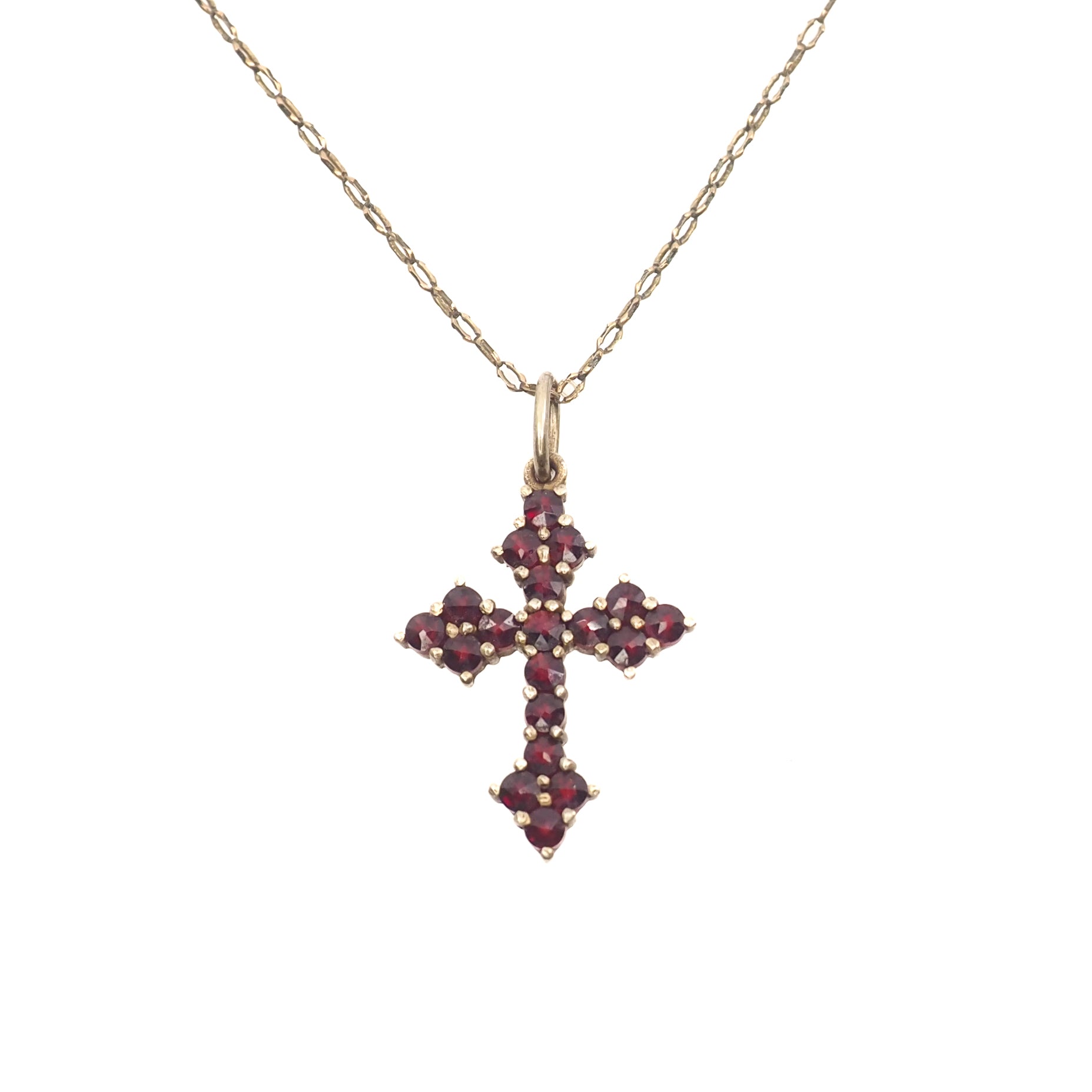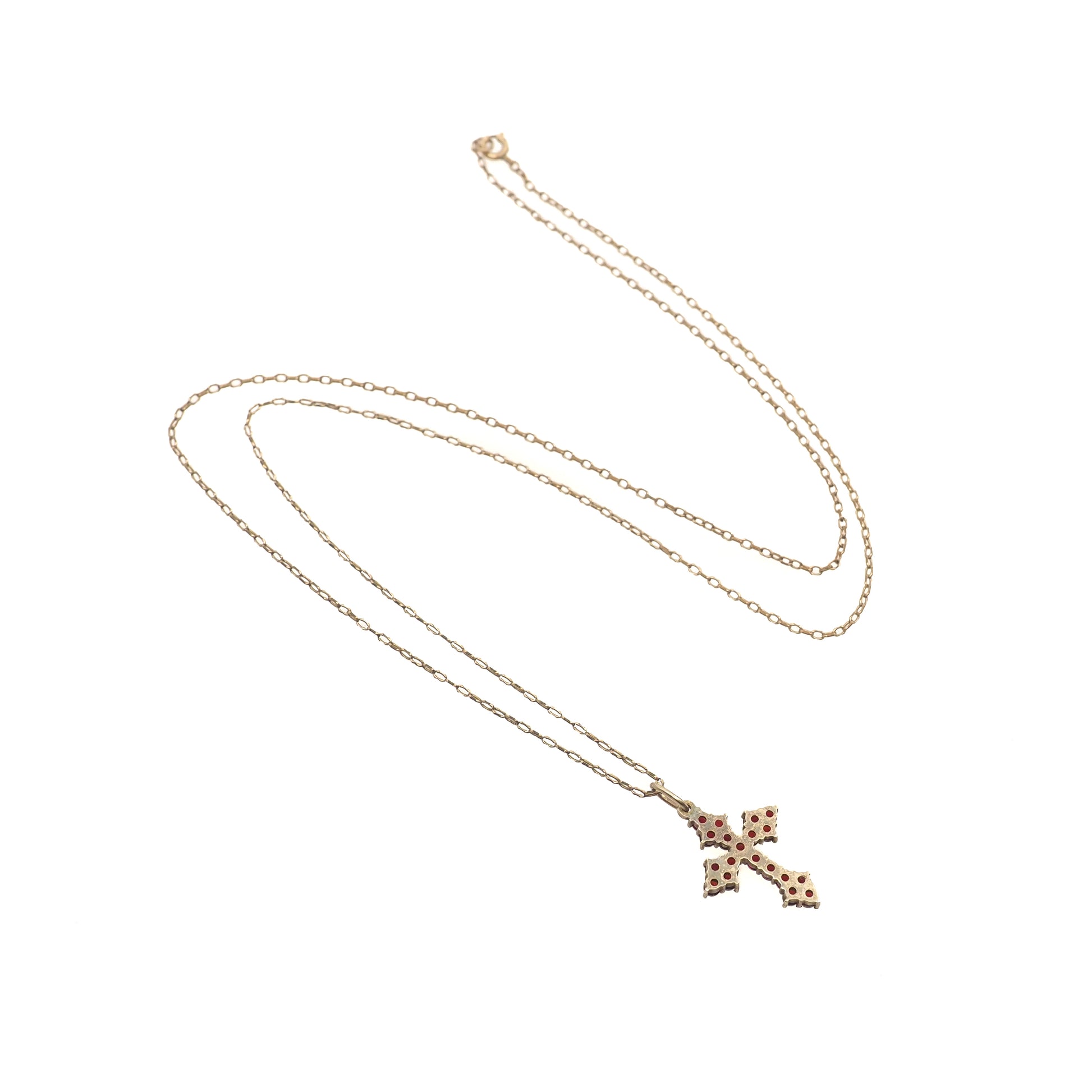 Vintage 1960s Red Garnet and Gilt Cross Pendant 24" Necklace