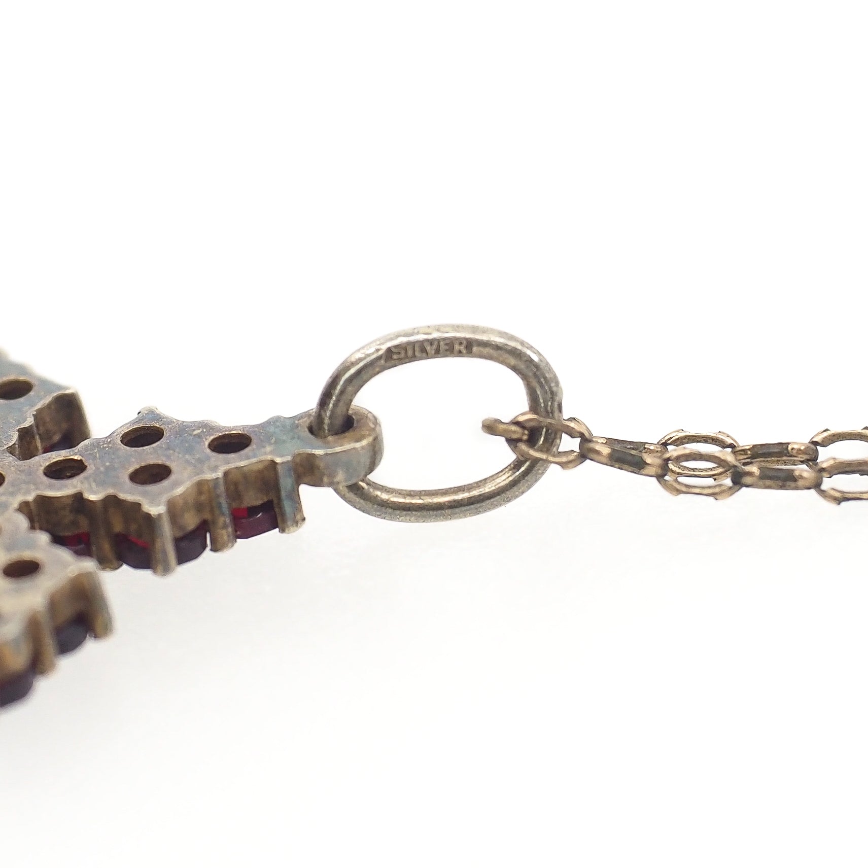 The pendant is in excellent vintage condition, with minimal signs of wear. The garnets are in excellent condition; none are cracked or chipped, but some have tiny nicks on the facet junctions under magnification. The jump ring is stamped SILVER.