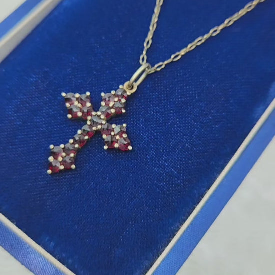 This is a gorgeous vintage pyrope garnet cross pendant crafted in the 1960s. The rose-cut garnets catch the light from every angle, drawing your eye to the elegant cluster design. The open-backed setting allows the sunlight to illuminate these pyrope garnets, giving them their signature "inner glow."