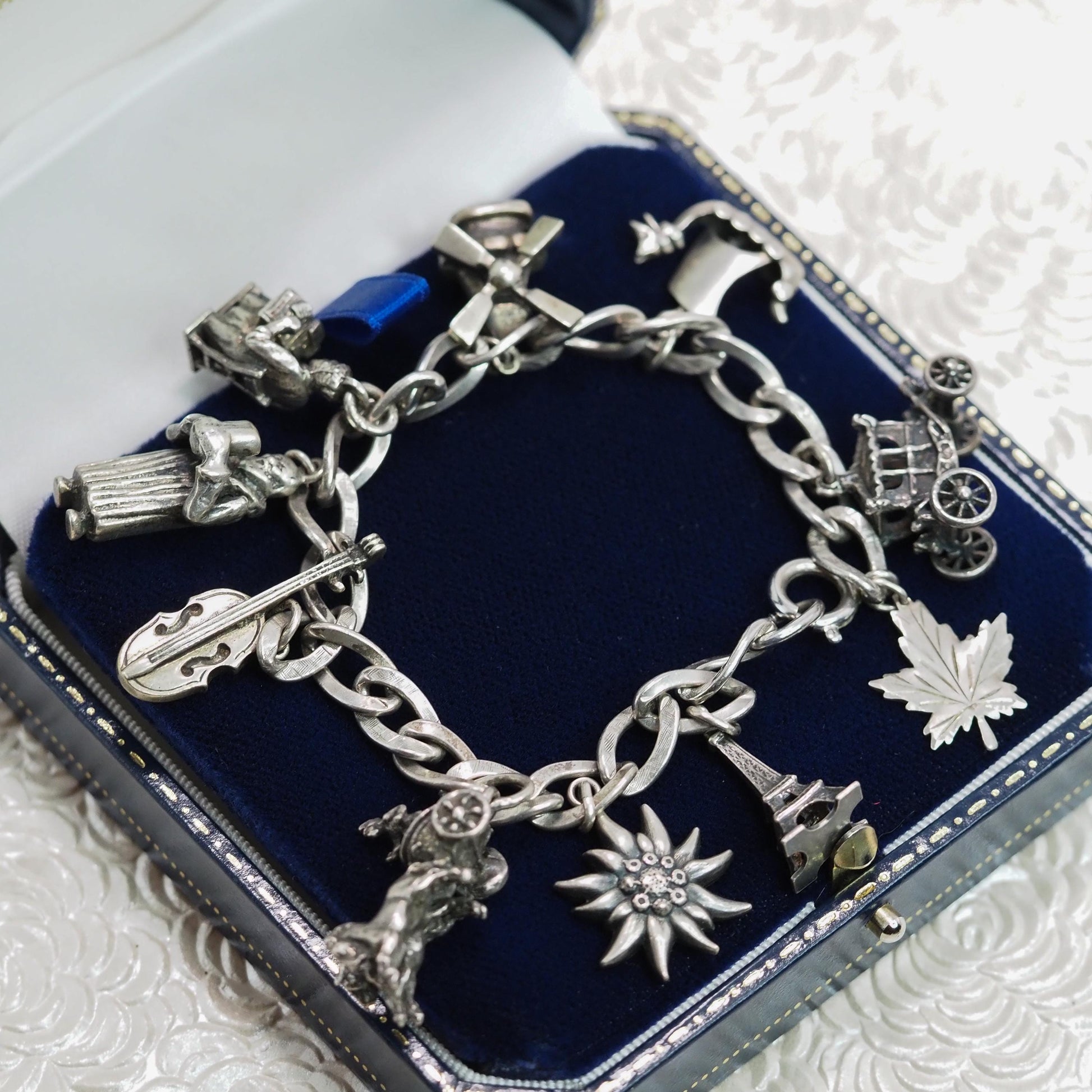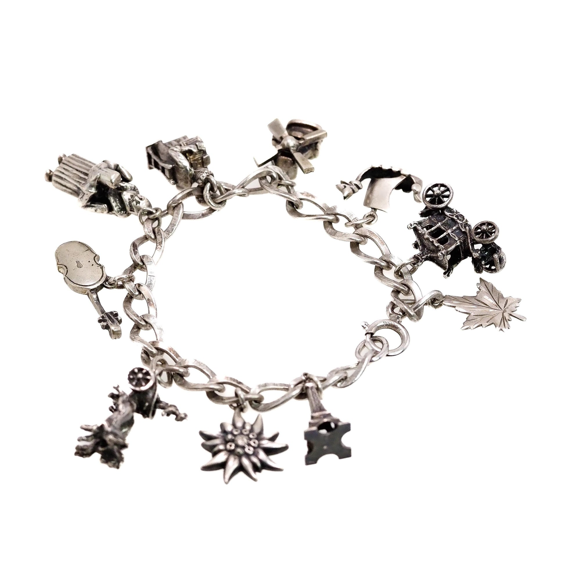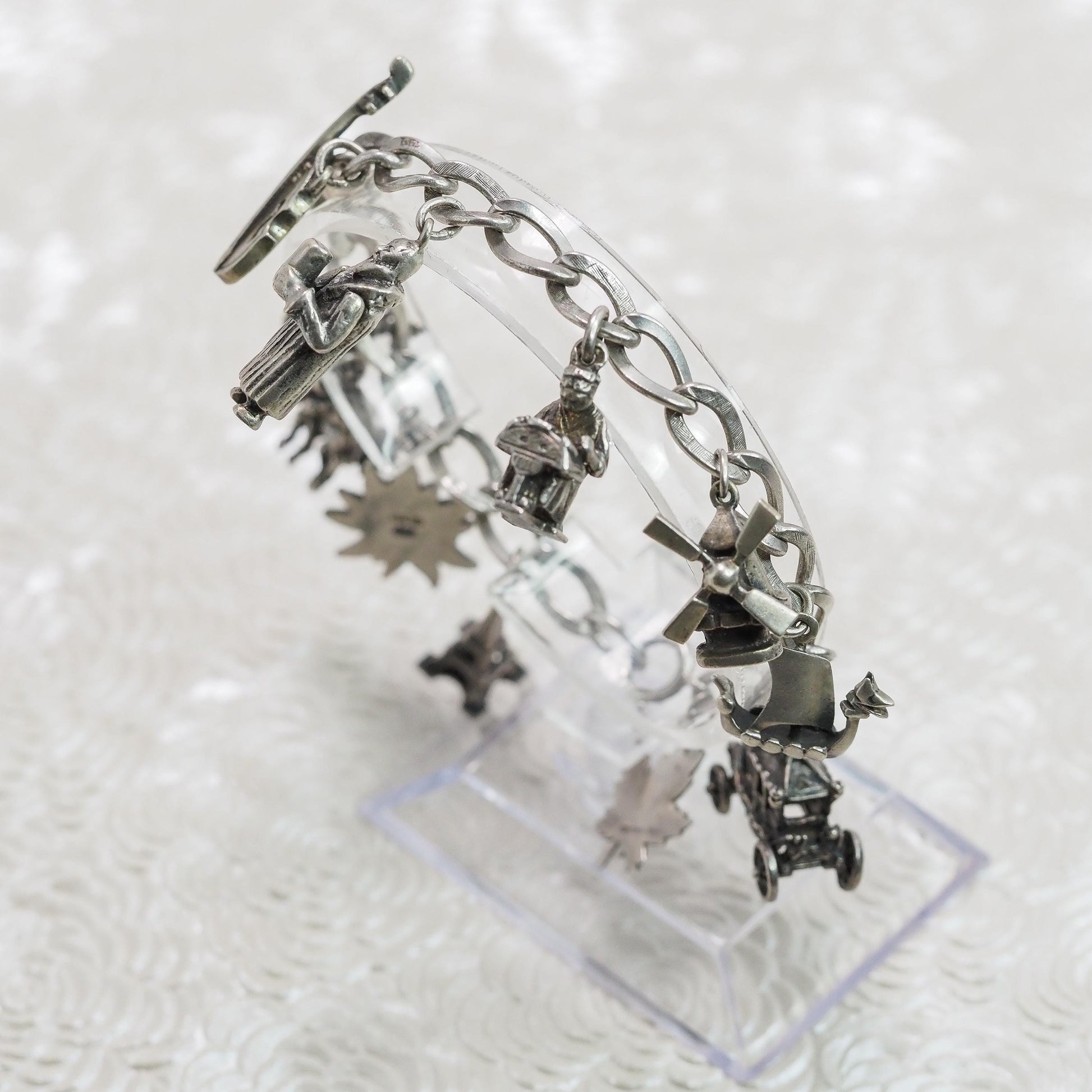 The bracelet is in very good vintage condition with minor signs of wear. Most of the charms are marked: the flower, chariot, and man drinking (800, European mark for 80% silver). The windmill is stamped 935 (Austria/Germany/Swiss mark for 93.5% silver). The cello is marked JD 925 (sterling silver). The man at the desk is marked Bruxelles. The maple leaf is marked Forstner STG.