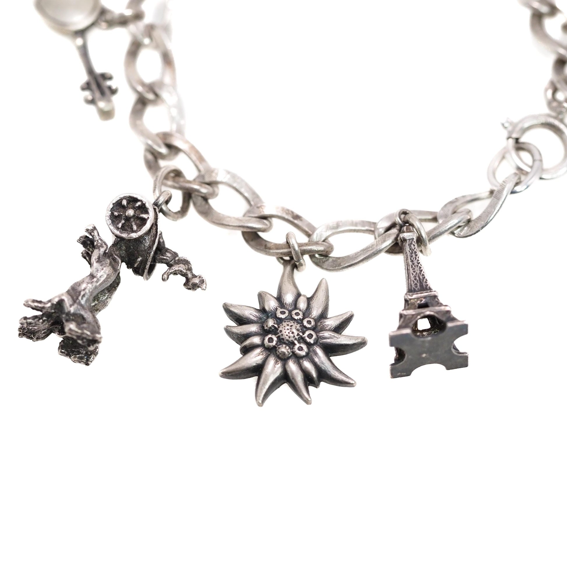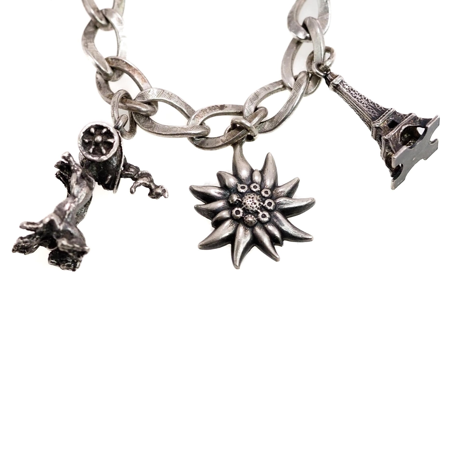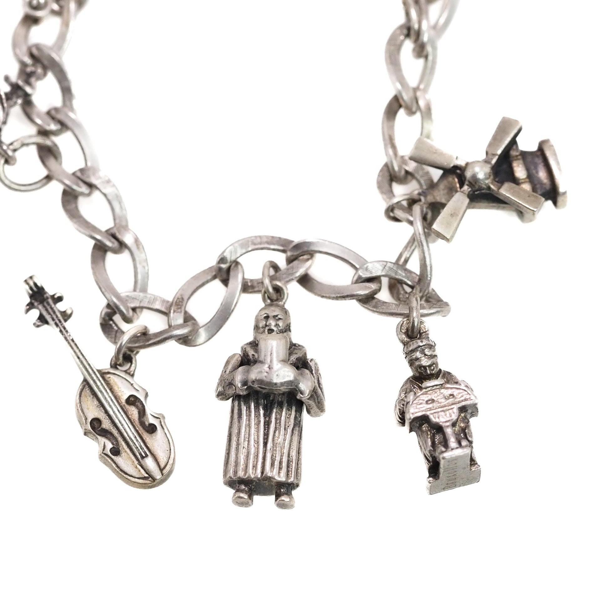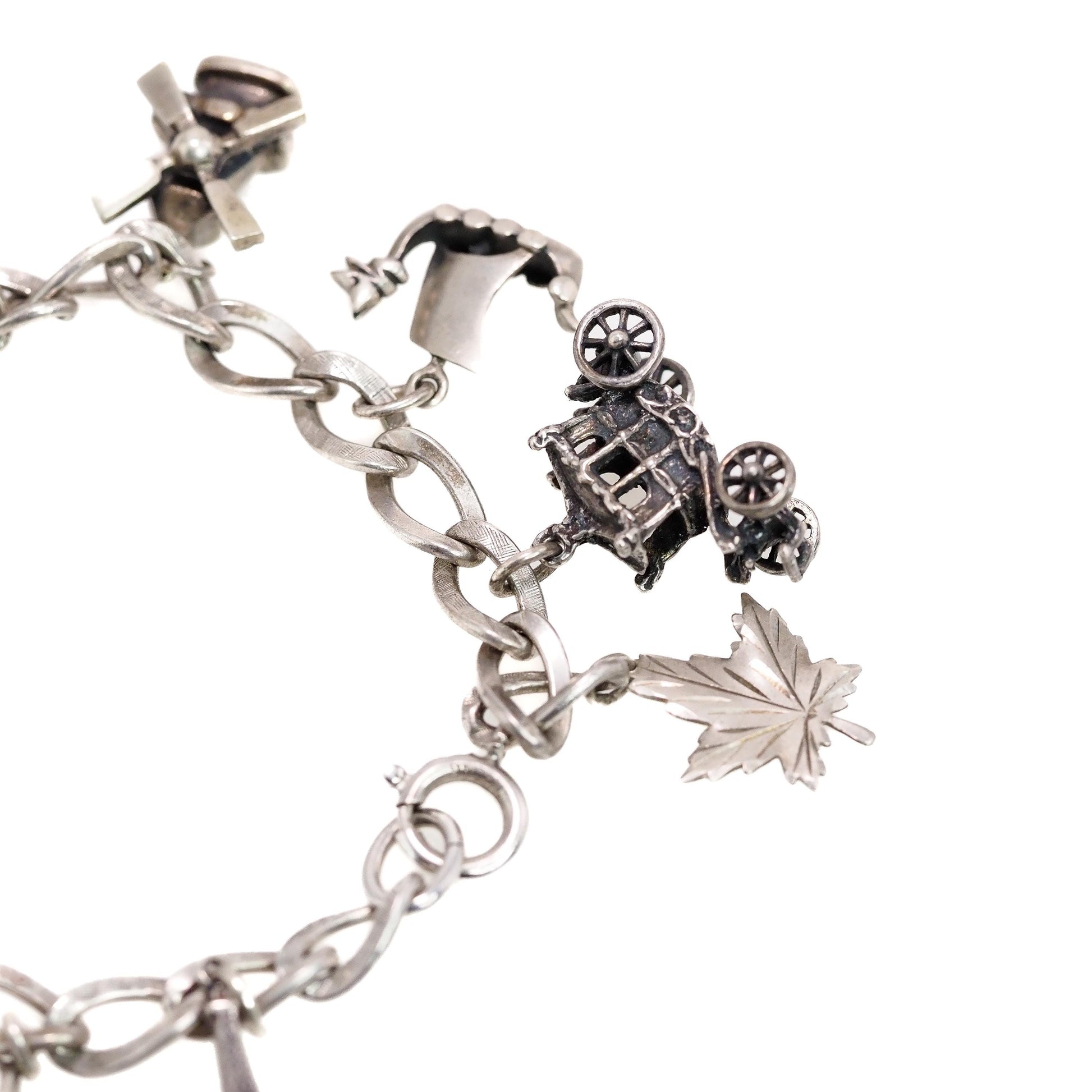 The bracelet is in very good vintage condition with minor signs of wear. Most of the charms are marked: the flower, chariot, and man drinking (800, European mark for 80% silver). The windmill is stamped 935 (Austria/Germany/Swiss mark for 93.5% silver). The cello is marked JD 925 (sterling silver). The man at the desk is marked Bruxelles. The maple leaf is marked Forstner STG.