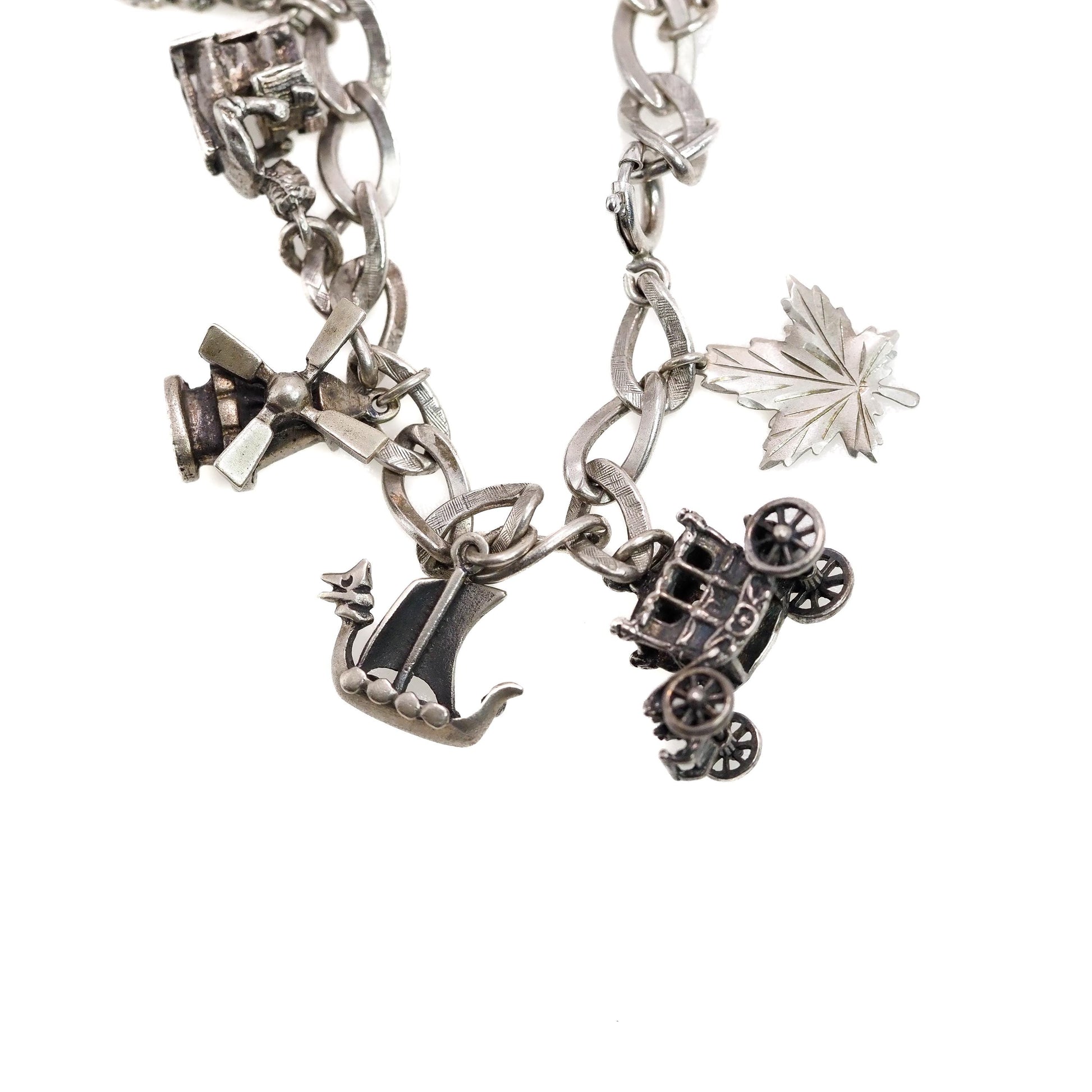 The loaded charm bracelet, crafted from sterling silver in the 1960s, is highly detailed and adds a bit of whimsy and character to the piece. It has two charms that move: a man who drinks and carriage wheels. The bracelet also has the Eiffel Tower, a flower, a chariot, a cello, a man at a desk, a windmill, a Viking ship, and a maple leaf.