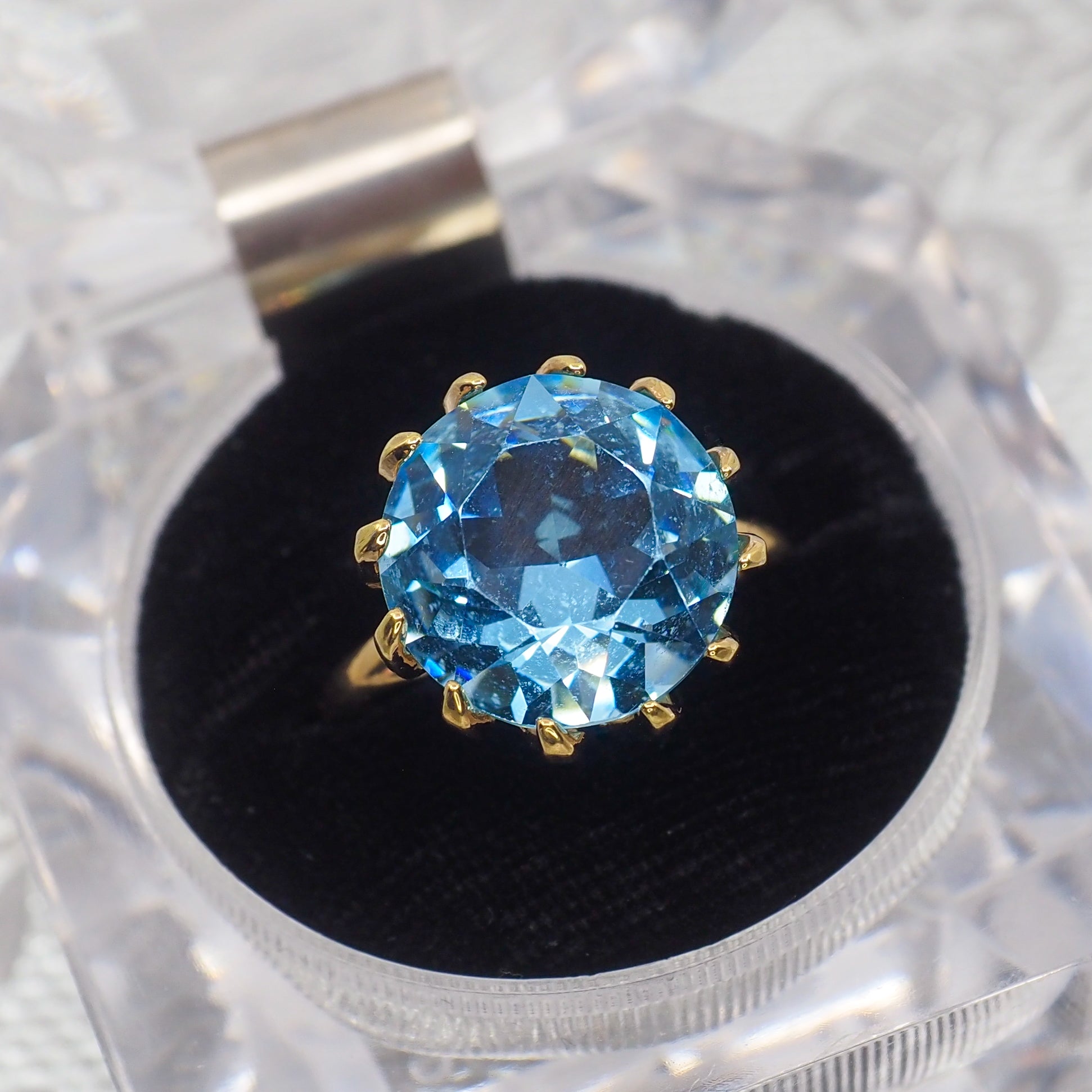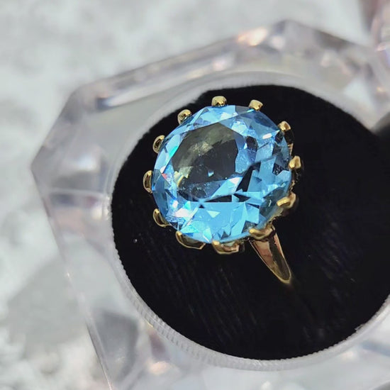 Vintage 1960s UNCAS Blue Glass and 18K Gold Electroplate Large Cocktail Ring Size 9