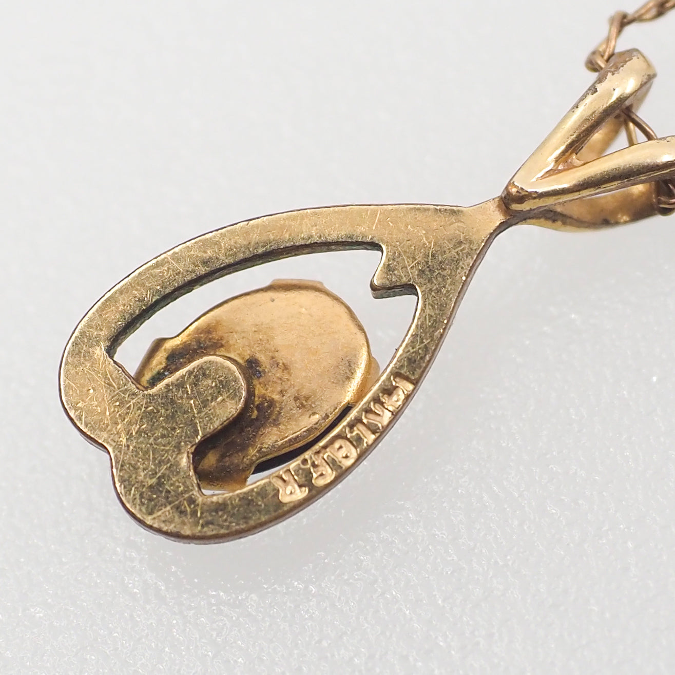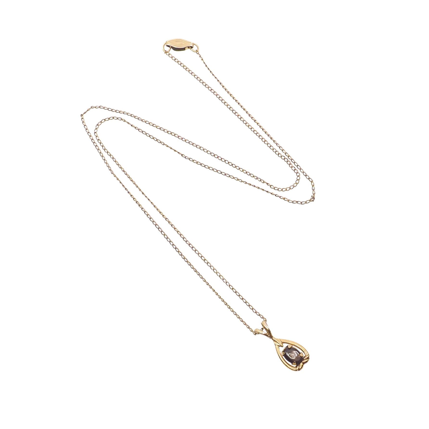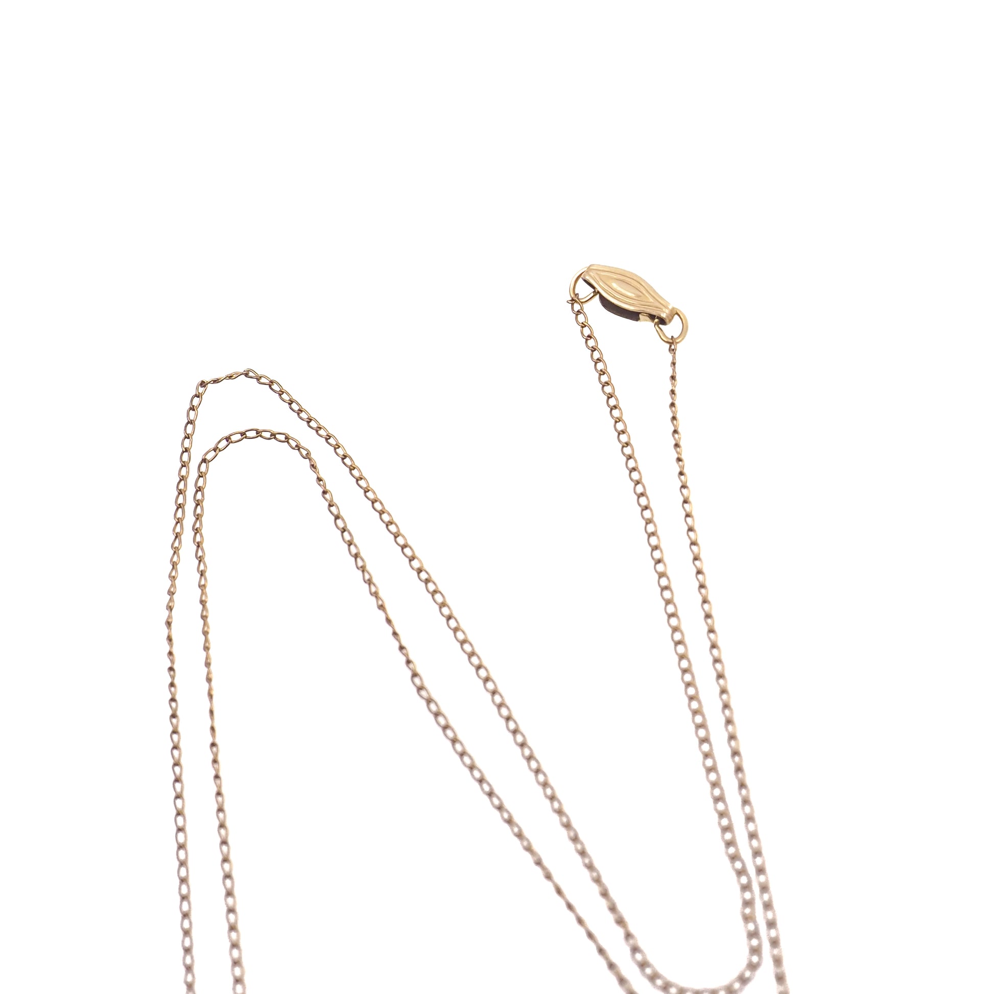 The necklace is in excellent vintage condition with minimal signs of wear. The sapphire is natural, not lab-created, and is free from chips or cracks. The back is stamped 14 K.T. GF R.