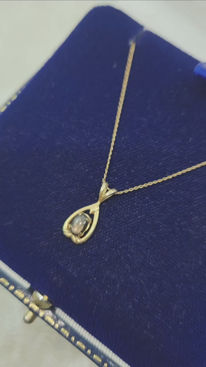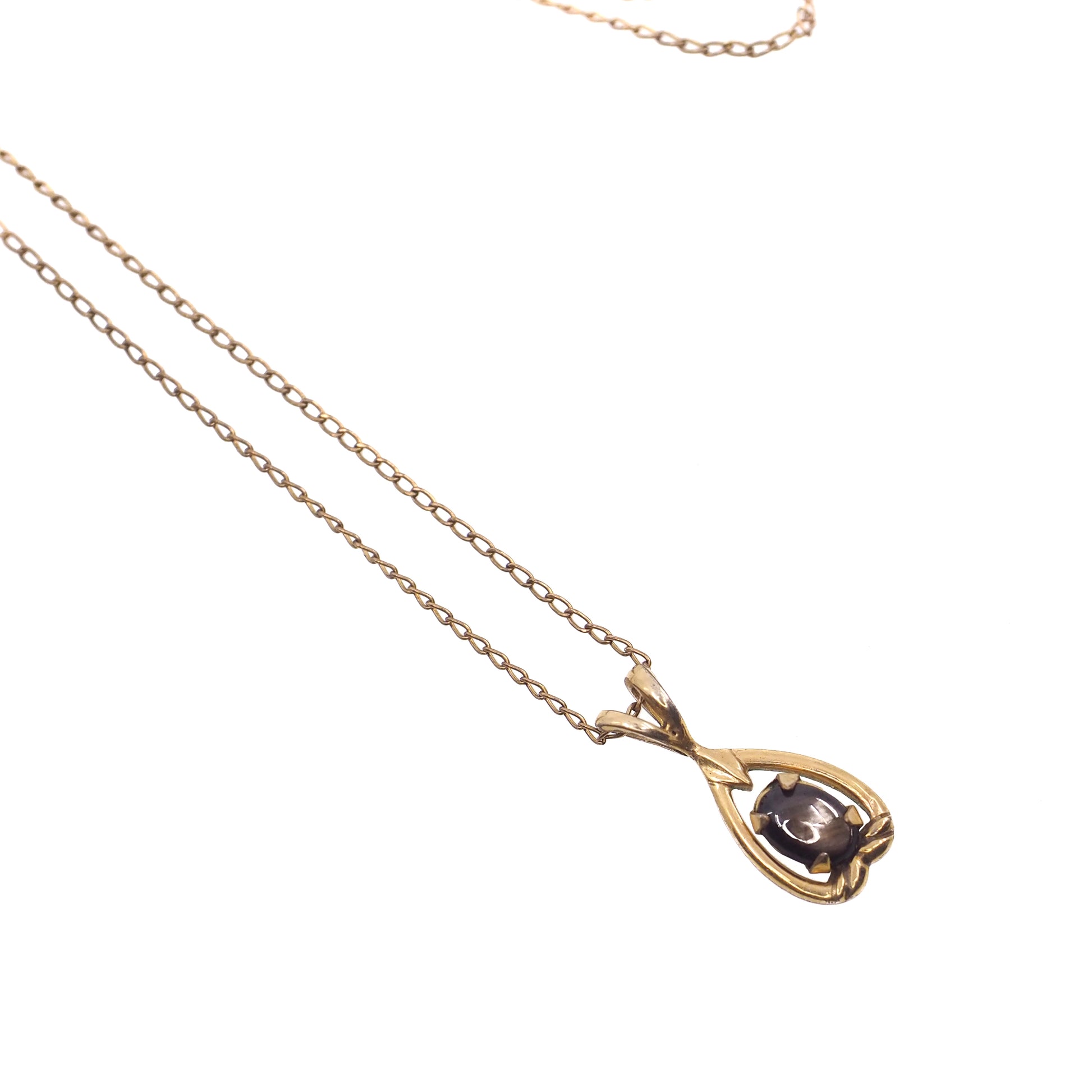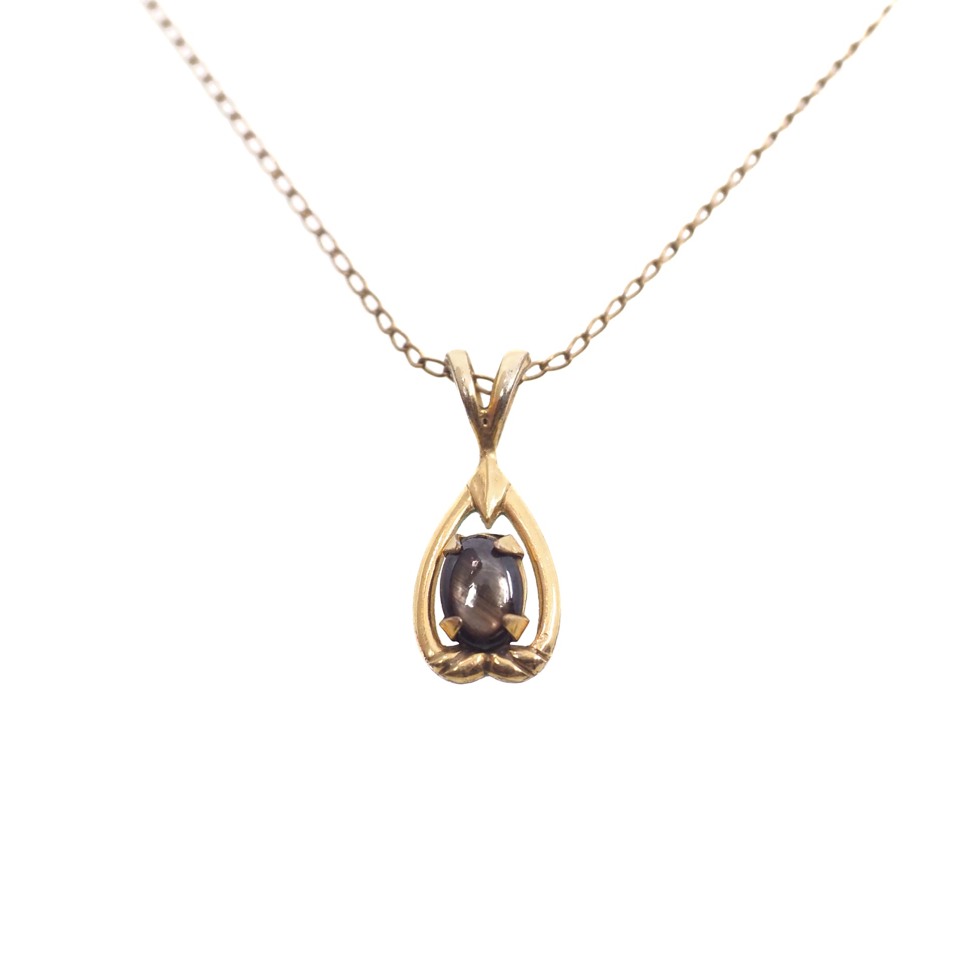 This classically styled and fun necklace from the 1970s features a black star sapphire cabochon set in prongs on yellow gold-filled metal. The natural star sapphire shines brilliantly in sunlight. A perfect vintage pendant for September birthdays or any sapphire enthusiast!