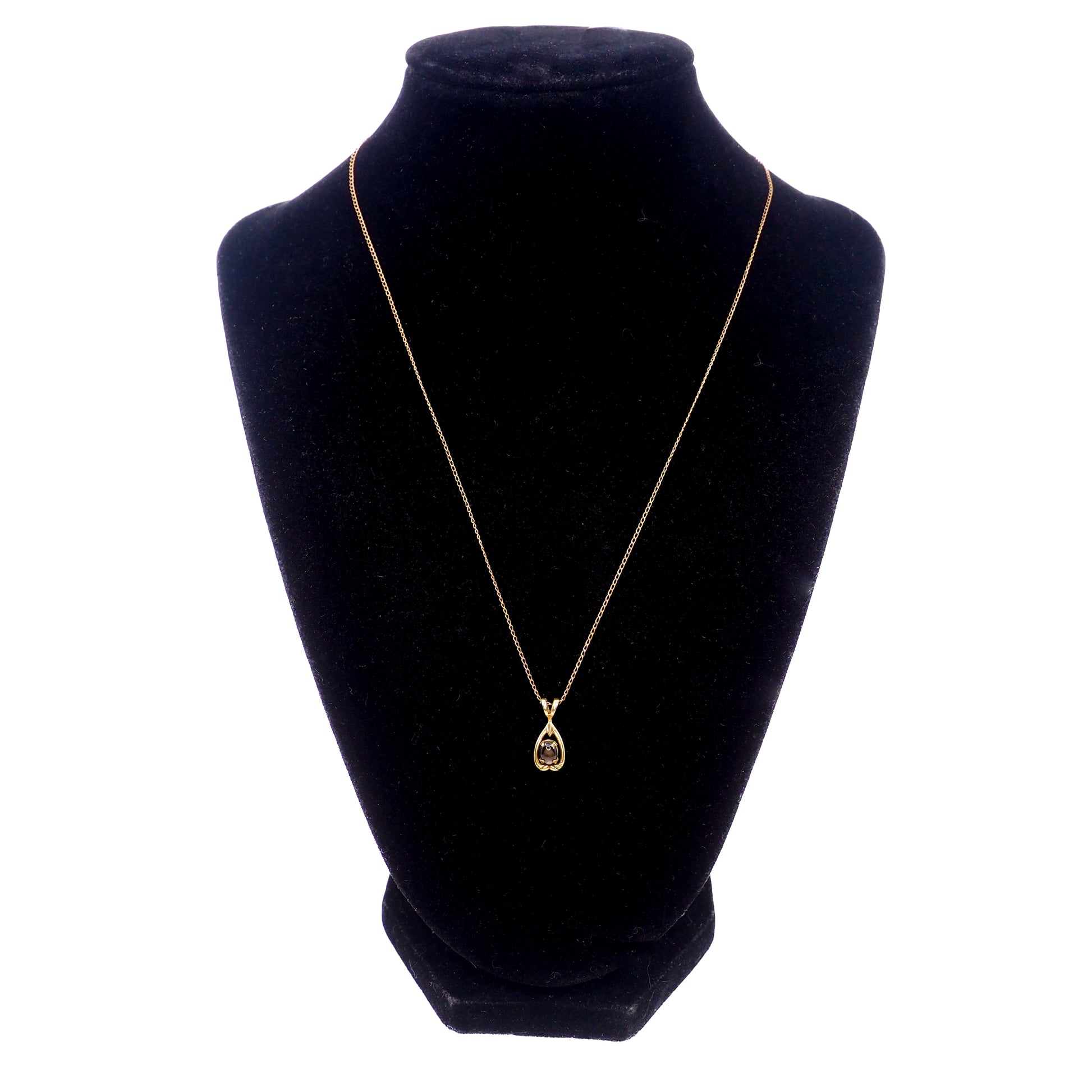 The necklace is 18" long, and the pendant measures 5/8" tall and 1/4" wide and weighs 1.27 grams. The sapphire measures 6 mm x 4 mm x 2 mm and weighs 0.50 carats. The box is for display purposes only.